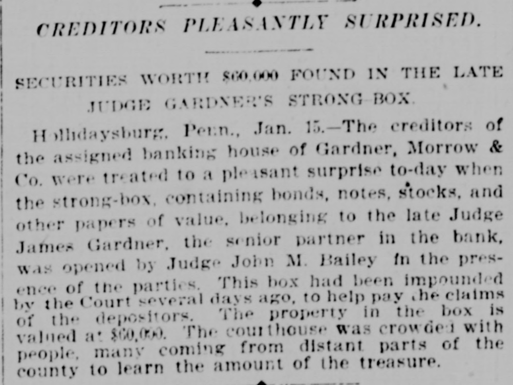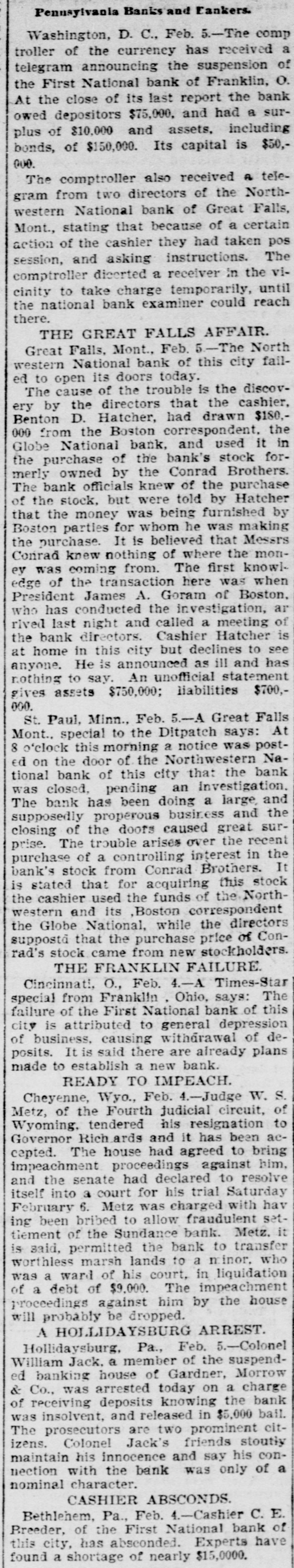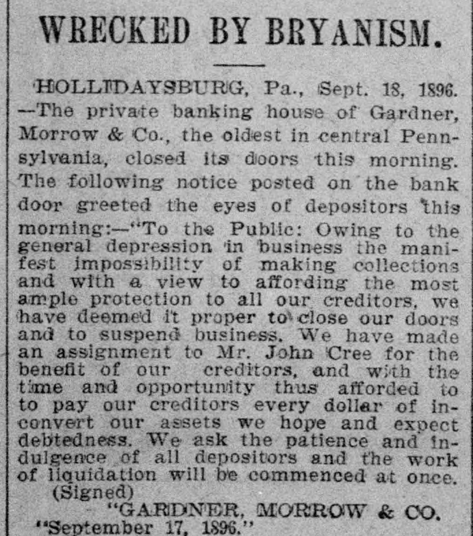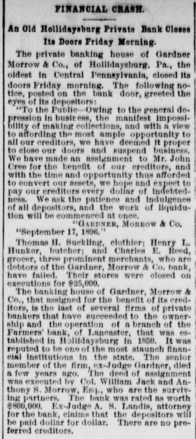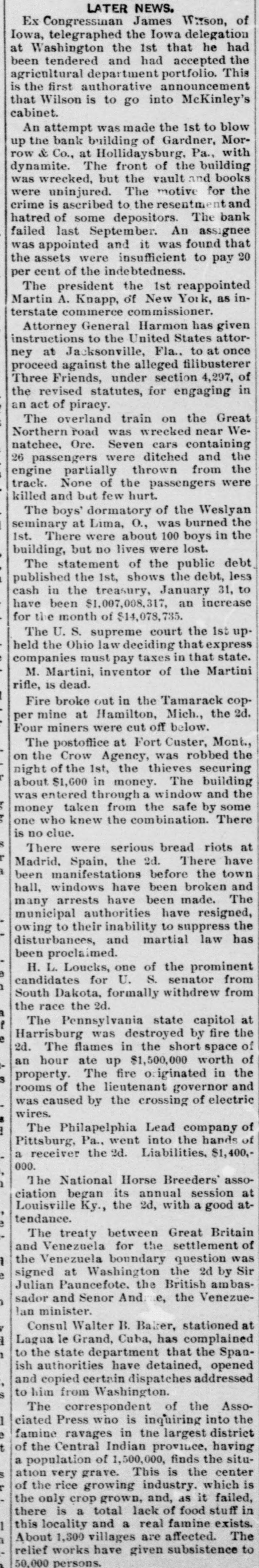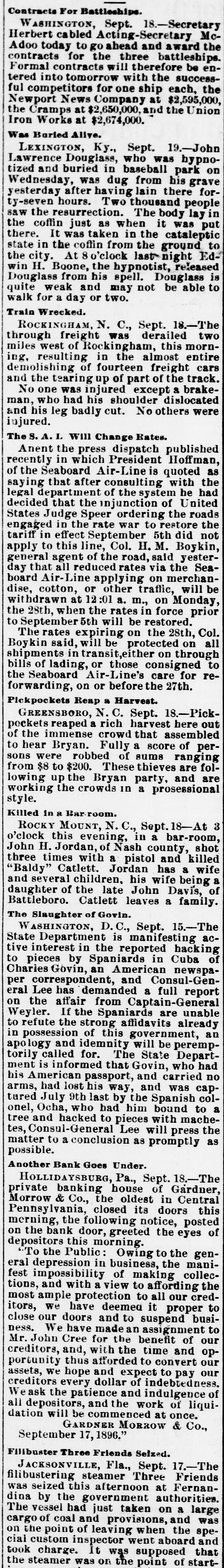 Contracts For Battleships. WASHINGTON, Sept. 18.-Secretary Herbert cabled Acting-Secretary McAdoo today to go ahead and award the contracts for the three battleships. Formal contracts will therefore be entered into tomorrow with the successful competitors for one ship each, the Newport News Company at $2,595,000, the Cramps at $2,650,000, and the Union Iron Works at $2,674,000. Was Buried Alive. uqof-'6I Sept. "Ay Lawrence Douglass, who was hypnotized and buried in baseball park on Wednesday, was dug from his grave yesterday after having lain there forty-seven hours. Two thousand people saw the resurrection. The body lay in the coffin just as when it was put there. It was taken in the cataleptic state in the coffin from the ground to the city. At 8 o'clock last night Edwin H. Boone, the hypnotist, released Douglass from his spell. Douglass is quite weak and may not be able to walk for a day or two. Train Wrecked. ROCKINGHAM, N. C., Sept. 18.-The through freight was derailed two miles west of Rockingham, this morning, resulting in the almost entire demolishing of fourteen freight cars and the tearing up of part of the track. No one was injured except a brakeman, who had his shoulder dislocated and his leg badly cut. No others were injured. Bates. Change IIIM T 'V 'S "4" Anent the press dispatch published recently in which President Hoffman, of the Seaboard Air-Line is quoted as saying that after consulting with the legal department of the system he had decided that the injunction of United States Judge Speer ordering the roads engaged in the rate war to restore the tariff in effect September 5th did not apply to this line, Col. H. M. Boykin, general agent of the road, said yesterday that all reduced rates via the Seaboard Air-Line applying on merchandise, cotton, or other traffic, will be withdrawn at 12 :01 a. m., on Monday, the 28th, when the rates in force prior to September 5th will be restored. The rates expiring on the 28th, Col. Boykin said, will be protected on all shipments in transit,either on through bills of lading, or those consigned to the Seaboard Air-Line's care for reforwarding, on or before the 27th. Pickpockets Reap a Harvest. GREENSBORO, N. C. Sept. 18.-Pickpockets reaped a rich harvest here out of the immense crowd that assembled to hear Bryan. Fully a score of persons were robbed of sums ranging -10] ere thieves Lhose $2000 04 8$ more lowing up the Bryan party, and are working the crowds in a prosessional style. Killed in a Bar-room. ROCKY MOUNT, N. C., Sept. 18-At 3 o'clock this evening, in a bar-room, John H. Jordan, of Nash county, shot three times with a pistol and killed "Baldy" Catlett. Jordan has a wife and several children, his wife being a daughter of the late John Davis, of Battleboro. Catlett leaves a family. The Slaughter of Govin. WASHINGTON, D.C., Sept. 15.-The State Department is manifesting active interest in the reported hacking to pieces by Spaniards in Cuba of Charies Govin, an American newspaper correspondent, and Consul-General Lee has demanded a full report on the affair from Captain-General Weyler. If the Spaniards are unable to refute the strong affidavits already in possession of this government, an apology and idemnity will be peremptorily called for. The State Department is informed that Govin, who had his American passport, and carried no arms, had lost his way, and was captured July 9th last by the Spanish colB 04 punoq mil bad очм onel tree and hacked to pieces with machetes, Consul-General Lee will press the SE SE E 01 matter possible. Another Bank Goes Under. HOLLIDAYSBURG, Pa., Sept. 18.-The private banking house of Gardner, Morrow & Co., the oldest in Central Pennsylvania, closed its doors this merning, the following notice, posted on the bank door, greeted the eyes of depositors this morning. "To the Public: Owing to the general depression in business, the manifest impossibility of making collections, and with a view to affording the most ample protection to all our creditors, we have deemed it proper to close our doors and to suspend business. We have made an assignment to Mr. John Cree for the benefit of our creditors, and, with the time and opportunity thus afforded to convert our uno ABD 04 capee рив bloo am assets creditors every dollar of indebtedness. Weask the patience and indulgence of all depositors, and the work of liquidation will be commenced at once. "00 y MORROM GREDNER "9681 'LL September Filibuster Three Friends Selzed. JACKSONVILLE, Fla., Sept. 17.-The filibustering steamer Three Friends was seized this afternoon at Fernandina by the government authorities. The vessel had just taken on a large cargo of coal and provisions, and was on the point of leaving when the special custom inspector went aboard and