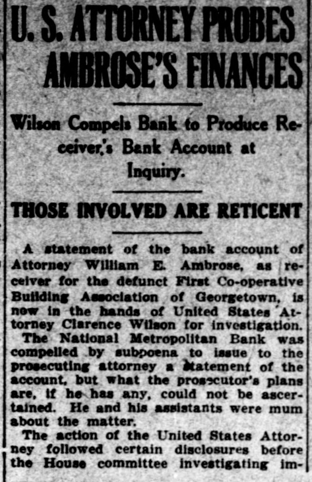 U.S. ATTORNEY PROBES PROBES AMBROSE'S FINANCES Wilson Compels Bank to Produce Receiver's Bank Account at Inquiry. THOSE INVOLVED ARE RETICENT A statement of the bank account of Attorney William E. Ambrose, as receiver for the defunct First Co-operative Building Association of Georgetown, is new in the hands of United States Attorney Clarence Wilson for investigation. The National Metropolitan Bank was compelled by subpoena to issue to the prosecuting attorney a statement of the account, but what the prosecutor's plans are, If he has any, could not be ascertained. He and his assistants were mum about the matter. The action of the United States Attorney followed certain disclosures before the House committee investigating im-