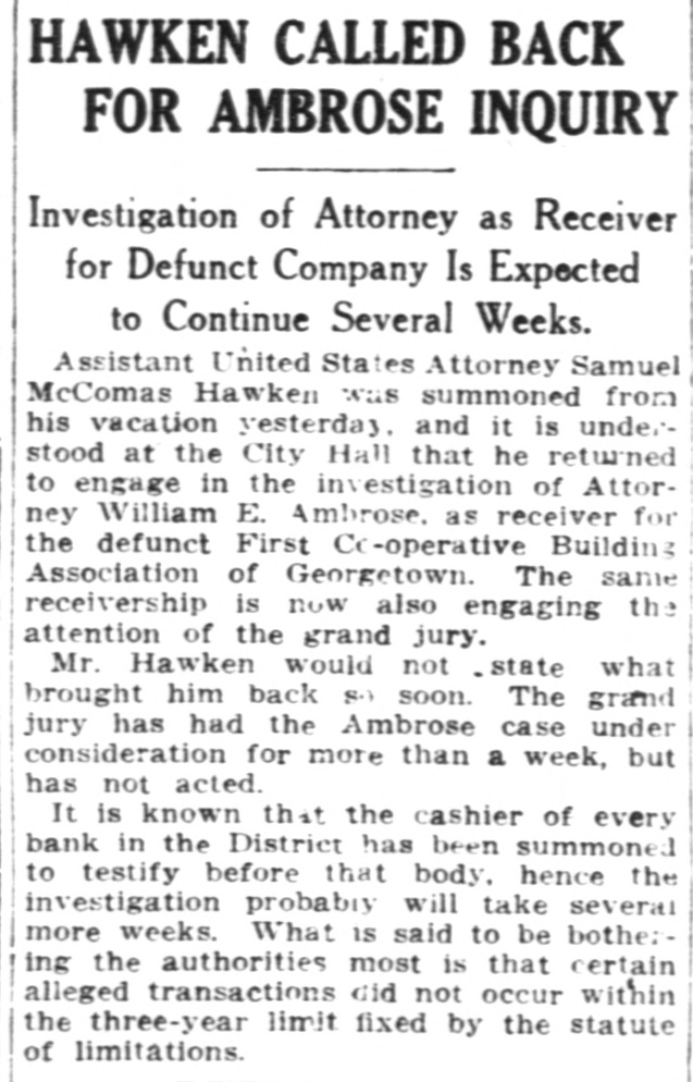 HAWKEN CALLED BACK FOR AMBROSE INQUIRY Investigation of Attorney as Receiver for Defunct Company Is Expected to Continue Several Weeks. Assistant United States Attorney Samuel McComas Hawken was summoned from his vacation yesterday, and it is understood at the City Hall that he returned to engage in the investigation of Attorney William E. Ambrose, as receiver for the defunct First Cc-operative Building Association of Georgetown. The same receivership is now also engaging the attention of the grand jury. Mr. Hawken would not .state what brought him back S0 soon. The grand jury has had the Ambrose case under consideration for more than a week, but has not acted. It is known that the cashier of every bank in the District has been summoned to testify before that body. hence the investigation probably will take several more weeks. What is said to be bothering the authorities most is that certain alleged transactions did not occur within the three-year limit fixed by the statute of limitations.