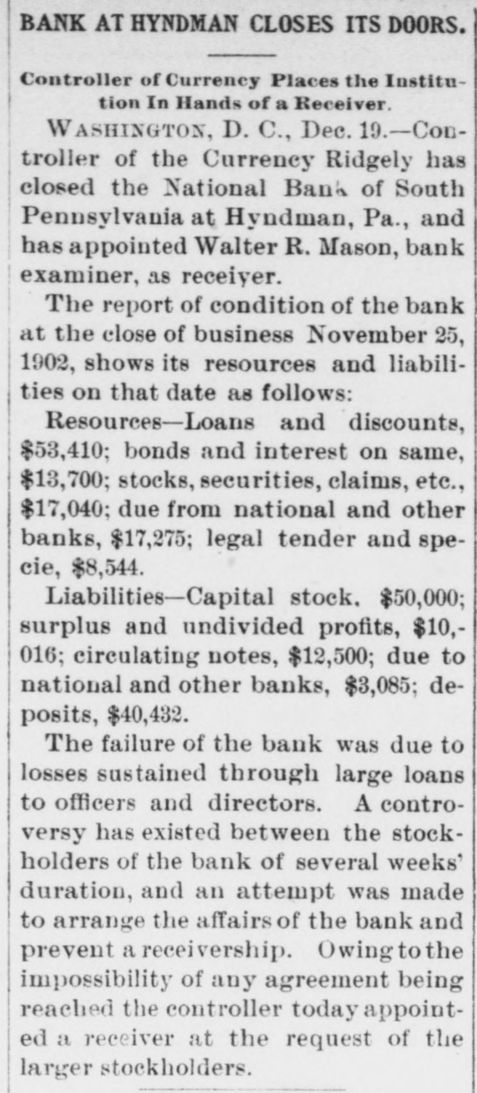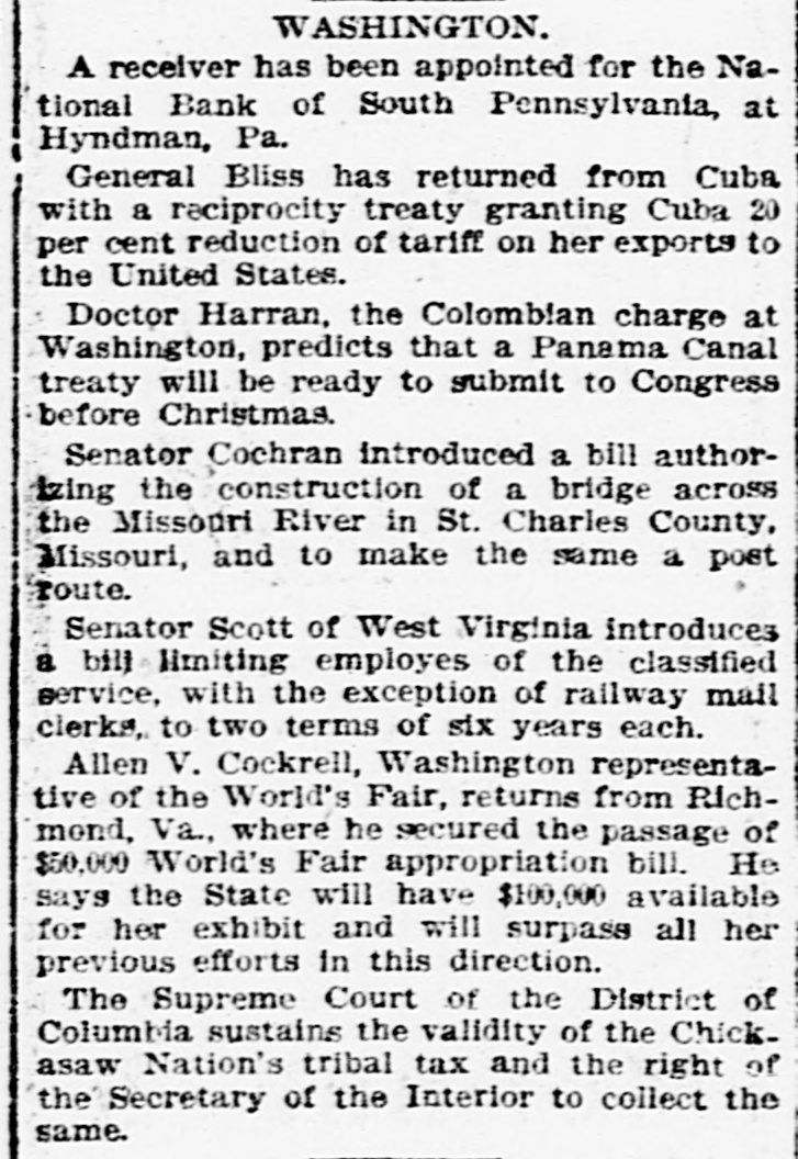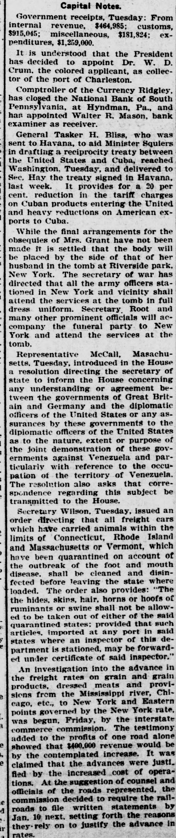 Capital Notes. Government receipts, Tuesday: From internal revenue, $464,985; customs, $915,045; miscellaneous, $181,824; expenditures, $1,259,000. It is understood that the President has decided to appoint Dr. W. D. Crum. the colored applicant, as collector of the port of Charleston. Comptroller of the Currency Ridgley, has closed the National Bank of South Pennsylvania, at Hyndman, Pa., and has appointed Walter R. Mason, bank examiner as receiver. General Tasker H. Bliss, who was sent to Havana, to aid Minister Squiers in drafting a reciprocity treaty between the United States and Cuba, reached Washington, Tuesday, and delivered to Sec. Hay the treaty signed in Havana, last week. It provides for a 20 per cent. reduction in the tariff charges on Cuban products entering the United and heavy reductions on American exports to Cuba. While the final arrangements for the obsequies of Mrs. Grant have not been made it is settled that the body will be placed by the side of that of her husband in the tomb at Riverside park, New York. The secretary of war has directed that all the army officers stationed in New York and vicinity shall attend the services at the tomb in full dress uniform. Secretary. Root and many other prominent officials will accompany the funeral party to New York and attend the services at the tomb. Representative McCall, Masachusetts. Tuesday, introduced in the House a resolution directing the secretary of state to inform the House concerning any understanding or agreement between the governments of Great Britain and Germany and the diplomatic officers of the United States or any assurances by these governments to the diplomatic officers of the United States as to the nature, extent or purpose of the joint demonstration of these governments against Venezuela and particularly with reference to the occupation of the territory of Venezuela. The resolution also asks that correspondence regarding this subject be transmitted to the House. Secretary Wilson, Tuesday, issued an order directing that all freight cars which have carried animals within the limits of Connecticut, Rhode Island and Massachusetts or Vermont, which have been quarantined on account of the outbreak of the foot and mouth disease. shall be cleaned and disinfected before leaving the state where loaded. The order also provides: "The the hides. skins, hair. horns or hoofs of ruminants or swine shall not be allowed to be taken out of either of the said quarantined states: provided that such articles. imported at any port in said states where an inspector of this department is stationed, may be forwarded under certificate of said inspector." An investigation into the advance in the freight rates on grain and grain products, dressed meats and provisions from the Mississippi river, Chicago, etc., to New York and Eastern points governed by the New York rate, was begun, Friday, by the interstate commerce commission. The testimony added to the profits of one road alone showed that $400,000 revenue would be by the contemplated increase. It was claimed that the advances were justi_ fied by the increased cost of operations. At the suggestion of counsel and officials of the roads represented, the commission decided to require the raile roads to file written statements by d Jan. 10 next. setting forth the reasons they rely on to justify the advance in r rates.