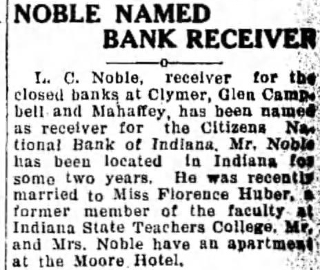 L. C. Noble, receiver for the closed banks Clymer, Glen Camps bell and Mahaffey, has been named receiver for the Citizens Na. tional Bank of Indiana. Mr. Noble has been located in Indiana for some two years. He was recently married to Miss Florence Huber, former member of the faculty Indiana State Teachers College, Mr. and Mrs. Noble have apartment the Moore Hotel.