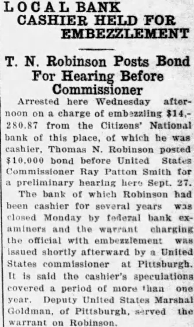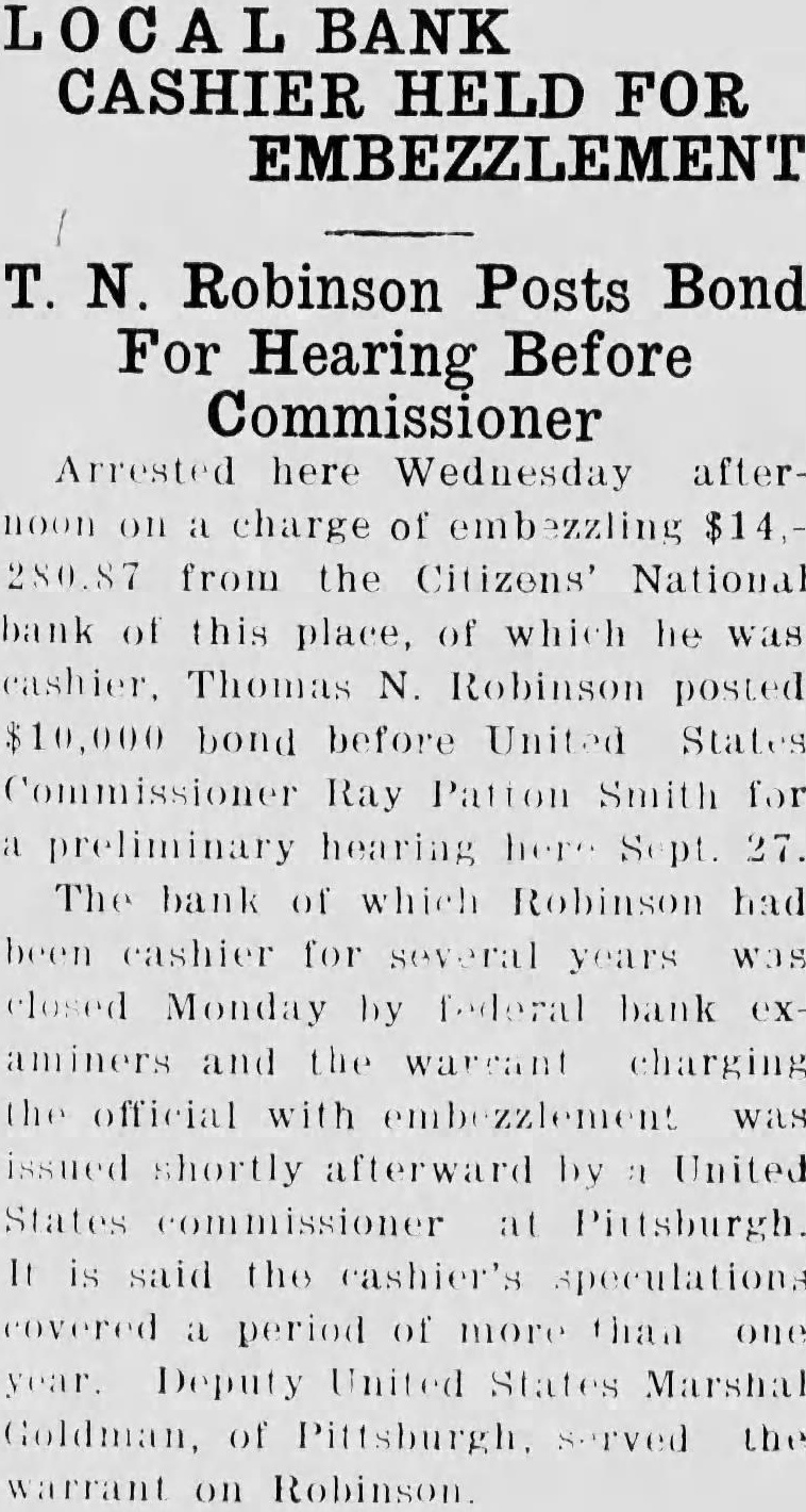 T. N. Robinson Posts Bond For Hearing Before Commissioner Arrested here Wednesday afternoon on a charge of embezzling $14,280.87 from the Citizens' National bank of this place, of which he was cashier, Thomas N. Robinson posted $10,000 bond before United States Commissioner Ray Patton Smith for a preliminary hearing here Sept. 27. The bank of which Robinson had been cashier for several years was closed Monday by federal bank examiners and the warrant charging the official with embezzlement was issued shortly afterward by a United States commissioner at Pittsburgh. It is said the cashier's speculations covered a period of more than one year. Deputy United States Marshal Goldman, of Pittsburgh, served the warrant on Robinson.