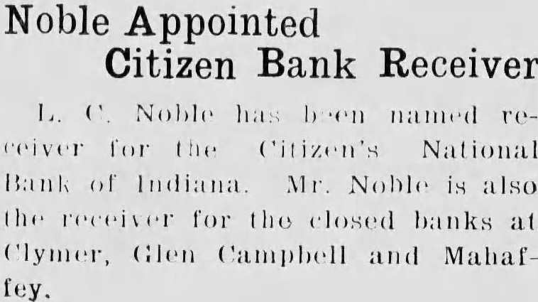 L. C. Noble has been named receiver for the Citizen's National Bank of Indiana. Mr. Noble is also the receiver for the closed banks at Clymer, Glen Campbell and Mahaffey.