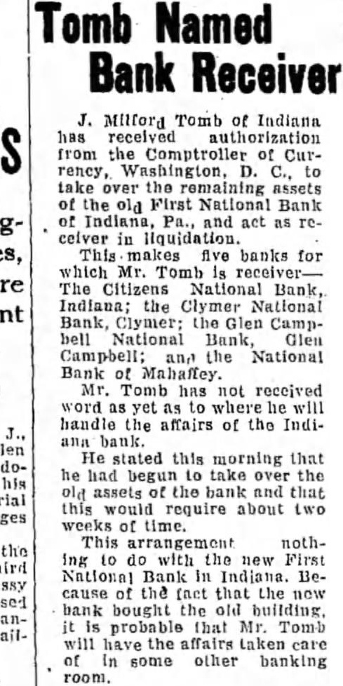 Milford Tomb of Indiana received from the Comptroller of Currency, to take over the remaining assets the First National Bank and act as ceiver in This five banks for which Mr. Tomb The Citizens National Bank, Indiana; the Clymer National Bank, Clymer; Glen CampNational Bank, Glen Campbell; and National Bank of Mahaffey. Mr. Tomb has not received word as where will handle the affairs of the Indibank. He stated this morning that he had begun take over the assets the bank and that would require about two weeks time. This arrangement nothing with the new First National Bank in Indiana. Because the fact that the bank bought old building. probable that Mr. Tomb will have the affairs taken care some other banking room.
