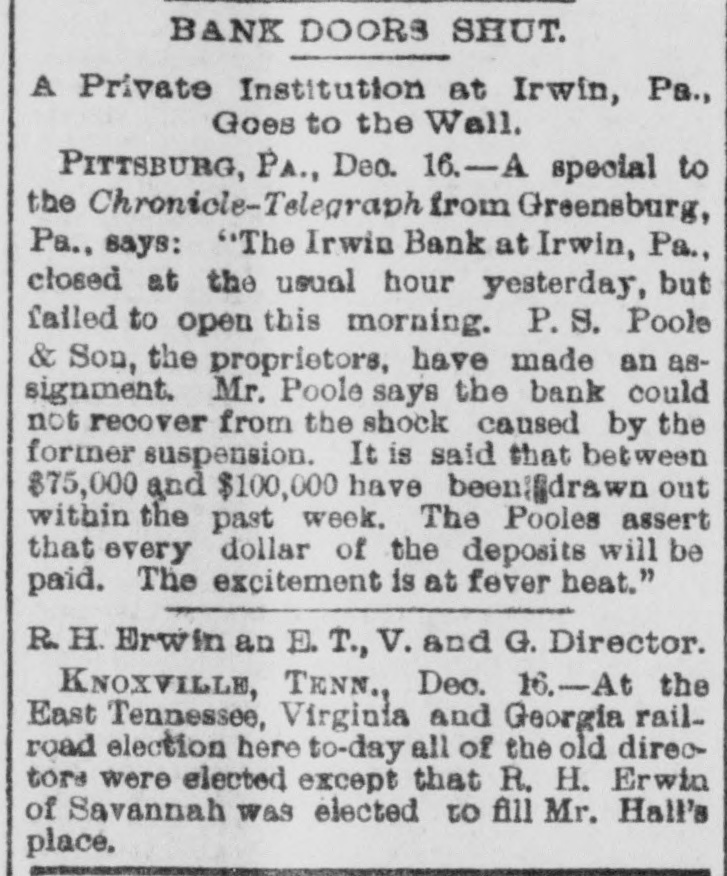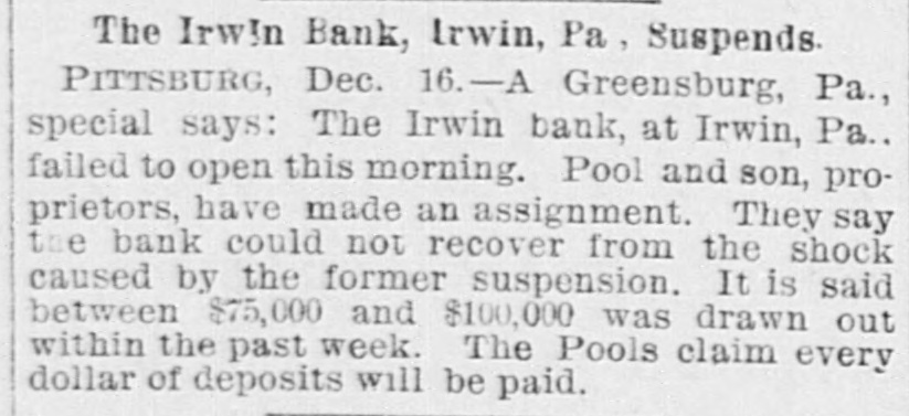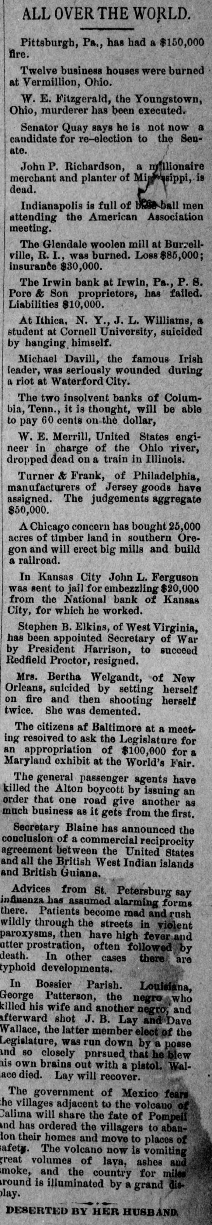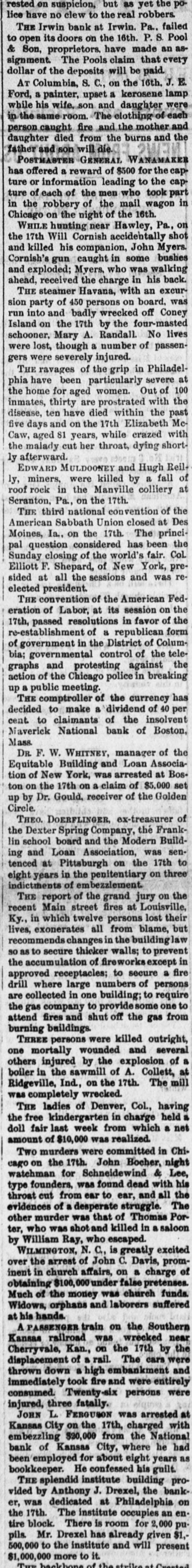 -od the tea se and uo rested lice have no clew to the real robbers. THE Irwin bank at Irwin. Pa.. failed to open its doors on the 16th. P. S. Pool -se uu греш have 'uog z signment. The Pools claim that every dollar of the deposits will be paid. AT Columbia, S. C., on the 16th. J. E. Ford, a painter, upset a kerosene lamp while his wife,son and daughter were in the same room. The clothing of each person caught fire and the mother and daughter died from the burns and the air IIIM uos pas POSTMASTER GENERAL WANAMAKER has offered a reward of $500 for the capture or information leading to the capture of each of the men who took part in the robbery of the mail wagon in Chicago on the night of the 16th. WHILE hunting near Hawley, Pa., on the 17th Will Cornish accidentally shot and killed his companion, John Myers. Cornish's gun caught in some bushes and exploded; Mvers. who was walking ahead, received the charge in his back. THE steamer Havana, with an excurSEAL board uo suossed 450 JO party sion run into and badly wrecked off Coney Island on the 17th by the four-masted schooner. Mary A. Randall. No lives were lost, though a number of passengers were severely injured. THE ravages of the grip in Philadelphia have been particularly severe at the home for aged women. Out of 100 inmates, thirty are prostrated with the disease, ten have died within the past OW Elizabeth 4721 the uo pue days events Caw, aged 81 years, while crazed with the malady cut her throat, dying short& EDWARD MULDOONEY and Hugh Reilly, miners, were killed by a fall of roof rock in the Manville colliery at Scranton, Pa., on the 17th. THE third national convention of the American Sabbath Union closed at Des Moines, Ia., on the 17th. The principal question considered has been the Sunday closing of the world's fair. Col. Elliott F. Shepard, of New York, presided at all the sessions and was reelected president. THE convention of the American Federation of Labor, at its session on the 17th, passed resolutions in favor of the re-establishment of a republican form of government in the District of Columbia; governmental control of the telegraphs and protesting against the action of the Chicago police in breaking meeting. public B dn THE comptroller of the currency has per of JO pueplaip B male of cent. to claimants of the insolvent Maverick National bank of Boston, Mass. DR. F. W. WHITNEY, manager of the Equitable Building and Loan Association of New York, was arrested at Bos405 $5.000 JO chaim e uo 4721 the uo not up by Dr. Gould, receiver of the Golden Circle. THEO. DOERFLINGER, ex-treasurer of the Dexter Spring Company, the Franklin school board and the Modern Building and Loan Association, was sen07 4721 the uo 18 tenecd eight years in the penitentiary on three indictments of embezzlement. the no Ind puers the JO report THE recent Main street fires at Louisville, Ky., in which twelve persons lost their lives, exonerates all from blame, but recommends changes in the building law so as to secure thicker walls; to prevent the accumulation of fireworks except in ere e e.moes of drill where large numbers of persons are collected in one building; to require 04 euo 04 Ausdunos sed the more suB the No anys pus serve attend quilding THREE persons were killed outright, one mortally wounded and several B Jo exploising the 4q pern[u] others to Collett 'V JO sawaii the up boller IIIᵐ eqL 1234 the no 'puI was completely wrecked. THE ladies of Denver, Col., having the free kindergarten in charge held a doll fair last week from which a net realized SEM 000'018 jo aunome Two murders were committed in Chi14210 Booher's uqof 1734 the uo ozen watchman for Schneidewind & Lee, type founders, was found dead with his throat cut from ear to ear, and all the evidences of a desperate struggle. The other murder was that of Thomas Porter, who was shot and killed in a saloon by William Ray, who escaped. WILMINGTON, N. C., is greatly excited over the arrest of John C. Davis, promJO charge B uo chunch up them obtaining $100, 000 under false pretenses. spuny church SEAL Денот equal to Manh Widows, orphans and laborers suffered spruq and to A PASSENGER train on the Southern Kansas railroad was wrecked near Cherryvale, Kan, on the 17th by the displacement of a rail. The cars were thrown down a high embankment and immediately took fire and were entirely ФЛЭМ persons injured, three fatally. JOHN L. FERGUSON was arrested at Kansas City on the 17th, charged with embezzling $20,000 from the National bank of Kansas City, where he had been employed for about eight years as bookkeeper. He confessed his guilt.
