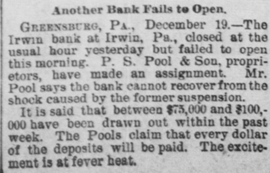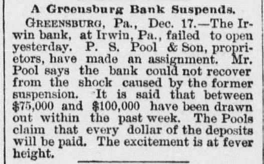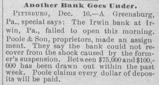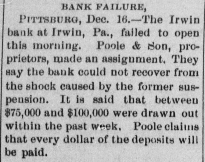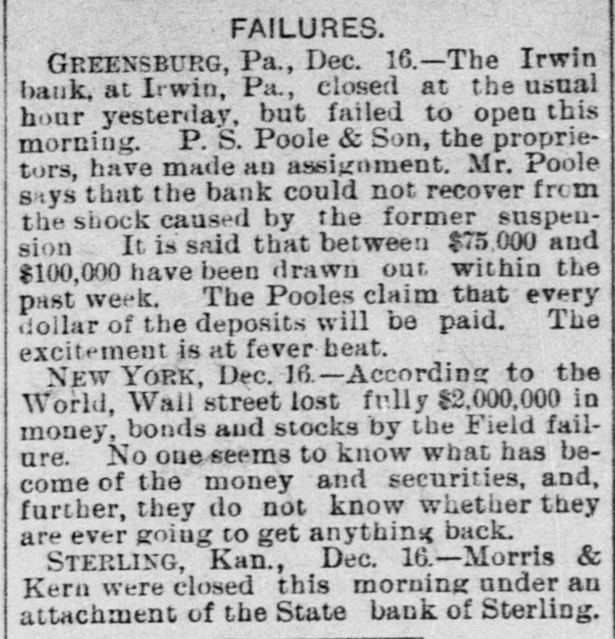 FAILURES. GREENSBURG, Pa., Dec. 16.-The Irwin bank, at Irwin, Pa., closed at the usual hour yesterday, but failed to open this morning. P. S. Poole & Son, the proprietors, have made an assignment. Mr. Poole says that the bank could not recover from the shock caused by the former suspension It is said that between $75,000 and $100,000 have been drawn out within the past week. The Pooles claim that every dollar of the deposits will be paid. The excitement is at fever heat. NEW YORK, Dec. 16.-According to the World, Wall street lost fully $2,000,000 in money, bonds and stocks by the Field failare. No one seems to know what has become of the money and securities, and, further, they do not know whether they are ever going to get anything back. STERLING, Kan., Dec. 6.-Morris & Kern were closed this morning under an attachment of the State bank of Sterling.