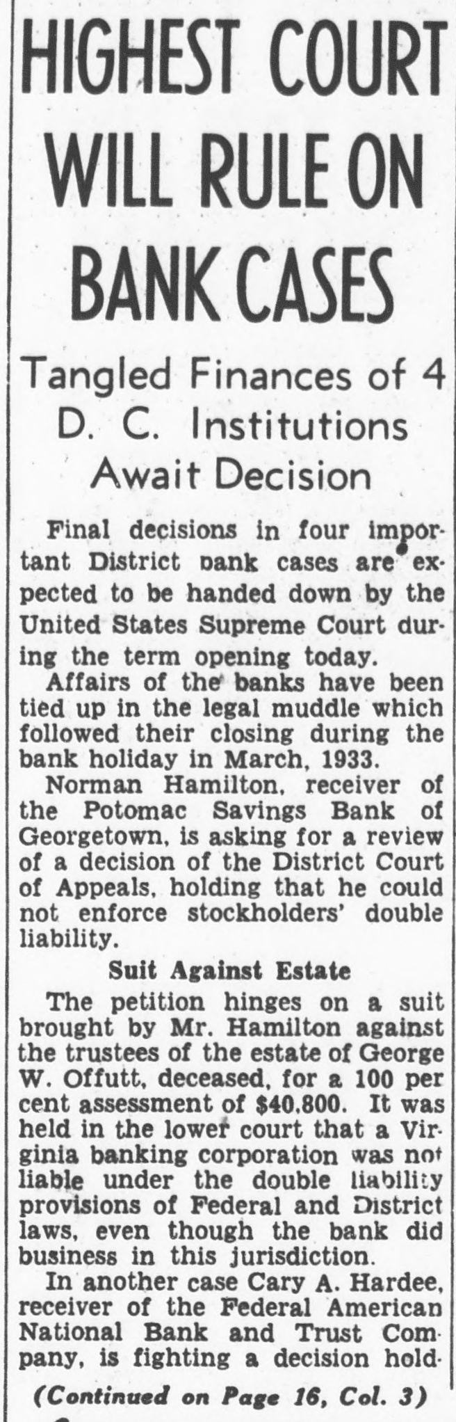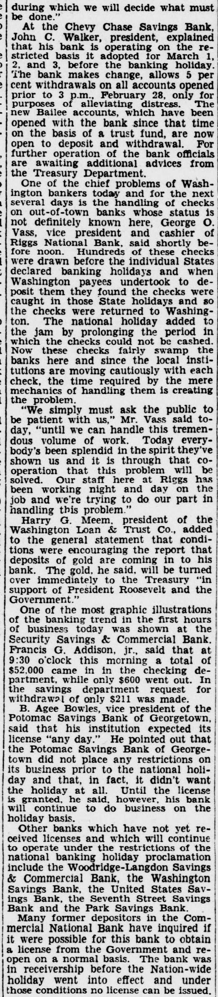 during which we will decide what must be done." At the Chevy Chase Savings Bank, John C. Walker, president, explained that his bank is operating on the restricted basis it adopted for March 1, 2, and 3, before the banking holiday. The bank makes change, allows 5 per cent withdrawals on all accounts opened prior to 3 p.m., February 28, only for purposes of alleviating distress. The new Bailee accounts, which have been opened with the bank since that time on the basis of a trust fund, are now open to deposit and withdrawal. For further operation of the bank officials are awaiting additional advices from the Treasury Department. One of the chief problems of Washington bankers today and for the next several days is the handling of checks on out-of-town banks whose status is not definitely known here, George O. Vass, vice president and cashier of Riggs National Bank, said shortly before noon. Hundreds of these checks before the individual States holidays declared were drawn banking and to when deWashington payees undertook posit them they found the checks were caught in those State holidays and so the checks were returned to Washington. The national holiday added to the jam by prolonging the period in which the checks could not be cashed. Now these checks fairly swamp the banks here and since the local institutions are moving cautiously with each check, the time required by the mere mechanics of handling them is creating the problem. "We simply must ask the public to be patient with us," Mr. Vass said today, "until we can handle this tremendous volume of work. Today everybody's been splendid in the spirit they've shown us and it is through that cooperation that this problem will be solved. Our staff here at Riggs has been working night and day on the job and we're trying to do our part in handling this problem." Harry G. Meem. president of the Washington Loan & Trust Co., added to the general statement that condithe of are coming tions deposits were encouraging gold report in to that his bank. The gold. he said. will be turned over immediately to the Treasury "in support of President Roosevelt and the Government." One of the most graphic illustrations of the banking trend in the first hours of business today was shown at the Security Savings & Commercial Bank. Francis G. Addison, jr., said that at 9:30 o'clock this morning a total of $52,000 came in in the checking department, while only $600 went out. In the savings department request for withdrawal of only $211 was made. B. Agee Bowles, vice president of the Potomac Savings Bank of Georgetown, said that his institution expected its license "any day." He pointed out that the Potomac Savings Bank of Georgetown did not place any restrictions on its business prior to the national holiday and that, in fact, it didn't want the holiday at all. Until the license is granted, he said. however, his bank will continue to do business on the holiday basis. Other banks which have not yet received licenses and which will continue to operate under the restrictions of the national banking holiday proclamation include the Woodridge-Langdon Savings & Commercial Bank, the Washington Savings Bank, the United States Savings Bank, the Seventh Street Savings Bank and the Park Savings Bank. Many former depositors in the Commercial National Bank have inquired if it were possible for this bank to obtain a license from the Government and reopen on a normal basis. The bank was in receivership before the Nation-wide holiday went into effect and under those conditions no license can be issued.
