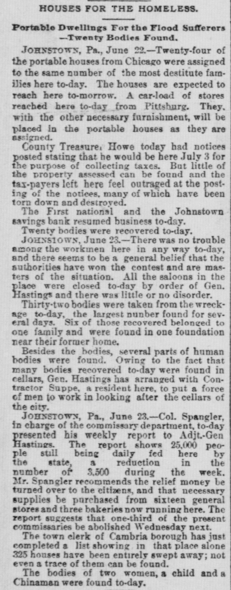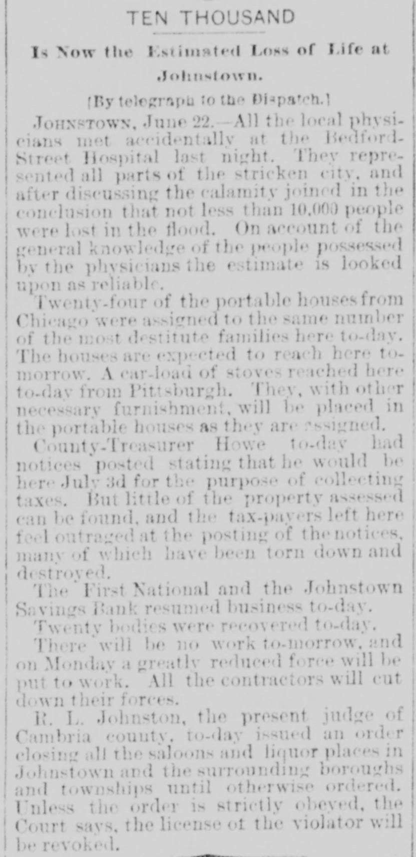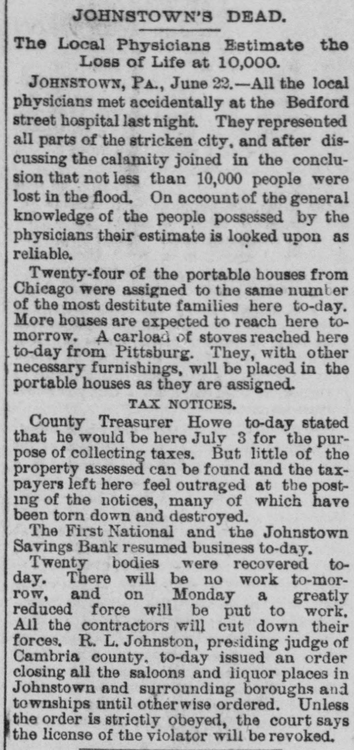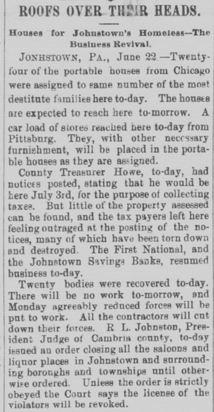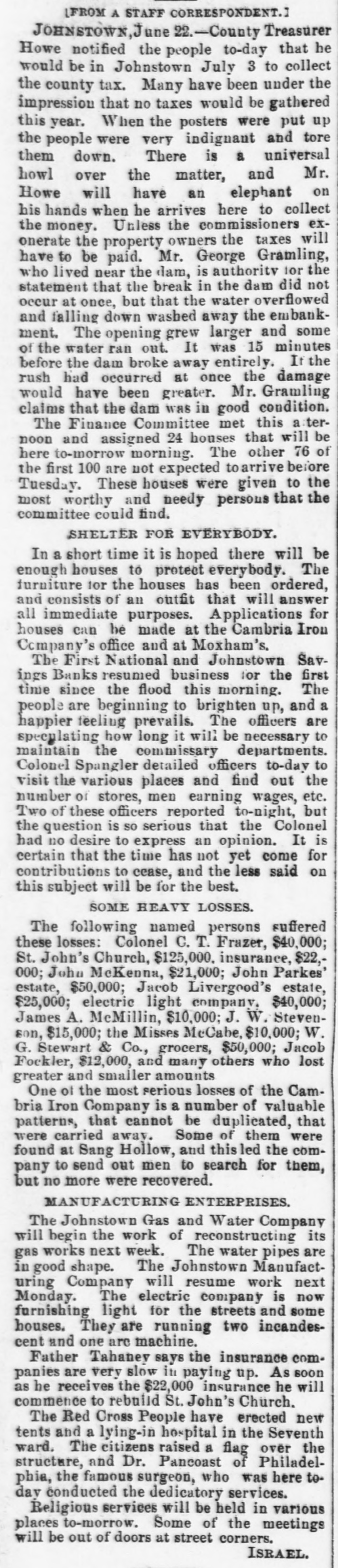 [FROM A STAFF CORRESPONDENT.I JOHNSTOWN, 22.-County Treasurer Howe notified the people to-day that he would be in Johnstown July 3 to collect the county tax. Many have been under the impression that no taxes would be gathered this year. When the posters were put up the people were very indignant and tore them down. There is a universal howl over the matter, and Mr. Howe will have an elephant on his hands when he arrives here to collect the money. Unless the commissioners exonerate the property owners the taxes will have to be paid. Mr. George Gramling, who lived near the dam, is authority for the statement that the break in the dam did not occur at once, but that the water overflowed and falling down washed away the embankment. The opening grew larger and some of the water ran out. It was 15 minutes before the dam broke away entirely. If the rush had occurred at once the damage would have been greater. Mr. Gramling claims that the dam was in good condition. The Finance Committee met this a ternoon and assigned 24 houses that will be here to-morrow morning. The other 76 of the first 100 are not expected toarrive before Tuesday. These houses were given to the most worthy and needy persons that the committee could find. SHELTER FOR EVERYBODY. In a short time it is hoped there will be enough houses to protect everybody. The furniture for the houses has been ordered, and consists of an outfit that will answer all immediate purposes. Applications for houses can be made at the Cambria Iron Company's office and at Moxham's. The First National and Johnstown Savings Banks resumed business for the first time since the flood this morning. The people are beginning to brighten up, and a happier feeling prevails. The officers are speculating how long it will be necessary to maintain the commissary departments. Colonel Spangler detailed officers to-day to visit the various places and find out the number or stores, men earning wages, etc. Two of these officers reported to-night, but the question is SO serious that the Colonel had no desire to express an opinion. It is certain that the time has not yet come for contributions to cease, and the less said on this subject will be for the best. SOME HEAVY LOSSES. The following named persons suffered these losses: Colonel C. T. Frazer, $40,000; St. John's Church, $125,000. insurance, $22,000; John McKenna, $21,000; John Parkes' estate, $50,000; Jacob Livergood's estate, $25,000; electric light company. $40,000; James A. McMillin, $10,000; J. W. Stevenson, $15,000; the Misses McCabe, $10,000; W. G. Stewart & Co., grocers, $50,000; Jacob Fockler, $12,000, and many others who lost greater and smaller amounts One of the most serious losses of the Cambria Iron Company is a number of valuable patterns, that cannot be duplicated, that were carried away. Some of them were found at Sang Hollow, and this led the company to send out men to search for them, but no more were recovered. MANUFACTURING ENTERPRISES. The Johnstown Gas and Water Company will begin the work of reconstructing its gas works next week. The water pipes are in good shape. The Johnstown Manufacturing Company will resume work next Monday. The electric company is now furnishing light for the streets and some houses. They are running two incandescent and one are machine. Father Tahanev says the insurance companies are very slow in paying up. As soon as he receives the $22,000 insurance he will commence to rebuild St. John's Church. The Red Cross People have erected new tents and a lying-in hospital in the Seventh ward. The citizens raised a flag over the structure, and Dr. Pancoast of Philadelphia, the famous surgeon, who was here today conducted the dedicatory services. Religious services will be held in various places to-morrow. Some of the meetings will be out of doors at street corners. ISRAEL.