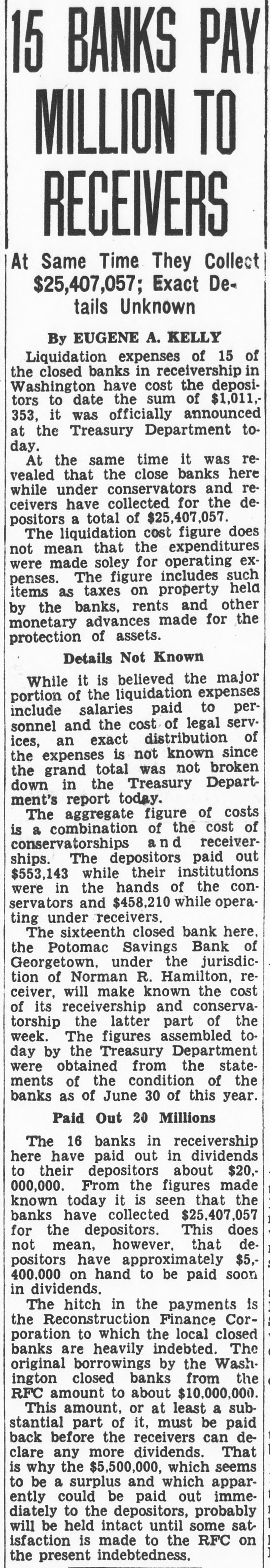 15 BANKS PAY MILLION TO RECEIVERS At Same Time They Collect $25,407,057; Exact Details Unknown By EUGENE A. KELLY Liquidation expenses of 15 of the closed banks in receivership in Washington have cost the depositors to date the sum of $1,011, 353, it was officially announced at the Treasury Department today. At the same time it was revealed that the close banks here while under conservators and receivers have collected for the depositors a total of $25,407,057. The liquidation cost figure does not mean that the expenditures were made soley for operating expenses. The figure includes such items as taxes on property held by the banks, rents and other monetary advances made for the protection of assets. Details Not Known While it is believed the major portion of the liquidation expenses include salaries paid to personnel and the cost of legal services, an exact distribution of the expenses is not known since the grand total was not broken down in the Treasury Department's report today. The aggregate figure of costs of conservatorships is a combination and the receiver- cost of ships. The depositors paid out $553,143 while their institutions were in the hands of the conservators and $458,210 while operating under receivers. The sixteenth closed bank here, the Potomac Savings Bank of Georgetown, under the jurisdiction of Norman R. Hamilton, rewill make of ceiver, its receivership known and conserva- the cost the latter week. torship The figures assembled part of the tothe Treasury were day by obtained from Department the statements of the condition of the banks as of June 30 of this year. Paid Out 20 Millions The 16 banks in receivership here have paid out in dividends to depositors about $20,From the 000,000. their figures that made the known today it is seen banks have collected $25,407,057 for the depositors. This does not mean, however, that depositors have approximately $5,400,000 on hand to be paid soon in dividends. The hitch in the payments is the Reconstruction Finance Corporation to which the local closed banks are heavily indebted. The original borrowings by the Washington closed banks from the RFC amount to about $10,000,000. This amount, or at least a substantial part of it, must be paid back before the receivers can declare any more dividends. That is why the $5,500,000, which seems to be a surplus and which apparently could be paid out immediately to the depositors, probably will be held intact until some sat isfaction is made to the RFC on the present indebtedness.
