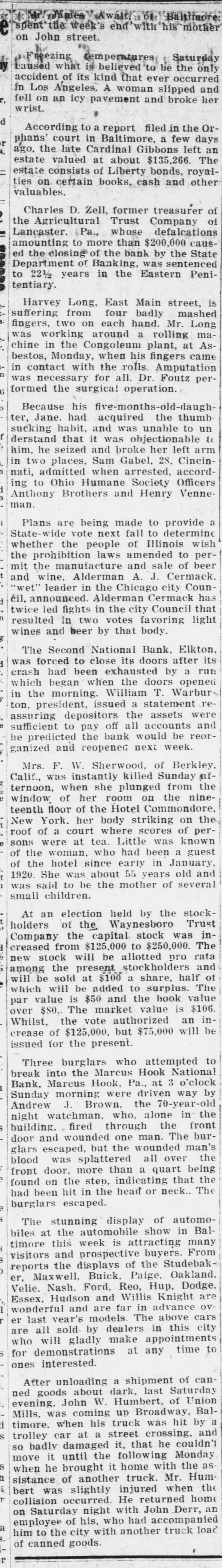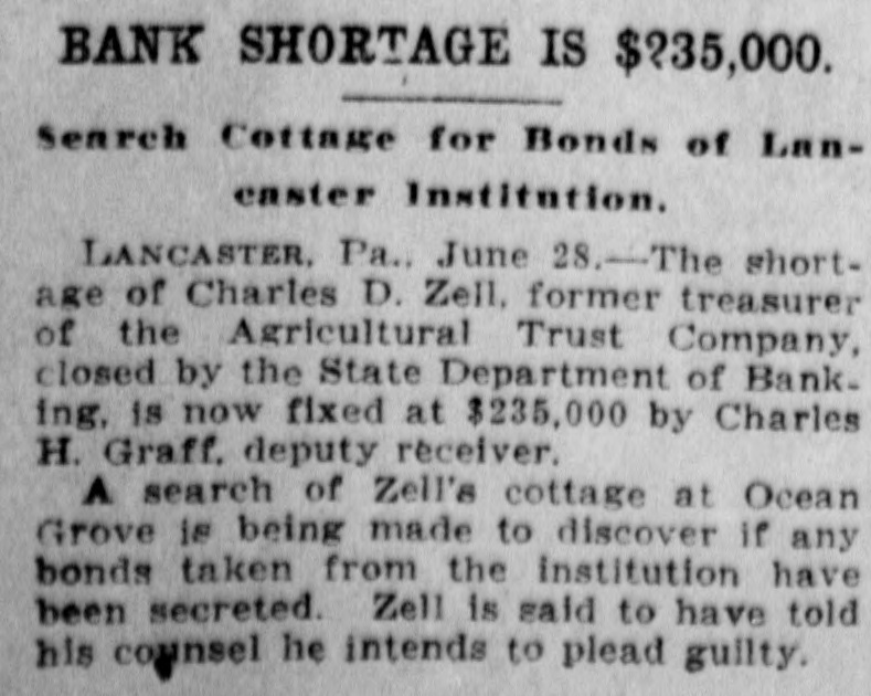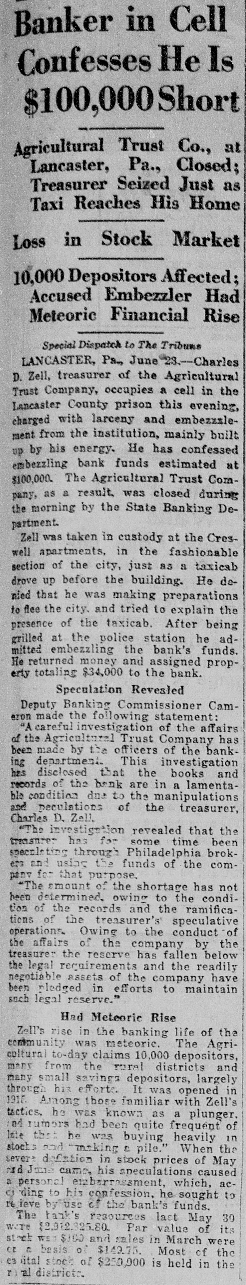 Banker in Cell Confesses He Is $100,000 Short Agricultural Trust Co., at Lancaster, Pa., Closed; Treasurer Seized Just as Taxi Reaches His Home in Stock Market Loss 10,000 Depositors Affected; Accused Embezzler Had Meteoric Financial Rise Special Dispatch to The Tribune LANCASTER, Pa., June 23.-Charles D. Zell, treasurer of the Agricultural Trust Company, occupies a cell in the Lancaster County prison this evening, charged with larceny and embezzalement from the institution, mainly built up by his energy. He has confessed embezzling bank funds estimated at $100,000. The Agricultural Trust Company, as a result, was closed during the morning by the State Banking Department. Zell was taken in custody at the Creswell apartments, in the fashionable section of the city, just as a taxicab drove up before the building. He denied that he was making preparations to flee the city, and tried to explain the presence of the taxicab. After being grilled at the police station he admitted embezzling the bank's funds. He returned money and assigned property totaling $34,000 to the bank. Speculation Revealed Deputy Banking Commissioner Cameron made the following statement: careful investigation of the affairs of the Agriculturel Trust Company has been made by the officers of the banking department. This investigation has disclosed that the books and records of the bank are in a lamentable condition due to the manipulations and peculations of the treasurer, Charles D. Zell "The investigation revealed that the treasure." has for some time been speculating through Philadelphia broke23 and usias the funds of the company for that purpose. "The amount of the shortage has not been determined, owing to the condition of the records and the ramifications of the treasurer's speculative operations. Owing to the conduct of the affairs of the company by the treasurer the reserve has fallen below the legal requirements and the readily negotiable assets of the company have been pledged in efforts to maintain such legal reserve." Had Meteoric Rise Zell's rise in the banking life of the community was meteoric. The Agricultural to-day claims 10,000 depositors, many from the rural districts and many small savings depositors, largely through his efforts. It was opened in 191F. Among those familiar with Zell's tactics. he was known as a plunger. nd rumors had been quite frequent of late that be was buying heavily in stock and "making E pile." When the sever defection in stock prices of May rd June came, his speculations caused a personal embarrassment, which, acCJ ding to his confession, he sought to re ieve by use et the bank's funds. The tank's resources last May 30 were $2,912,325.80 Par value of its street WE: $100 and sales in March were or a basis of $142.75. Most of the e3 tital stock of $250,000 is held in the al districto,