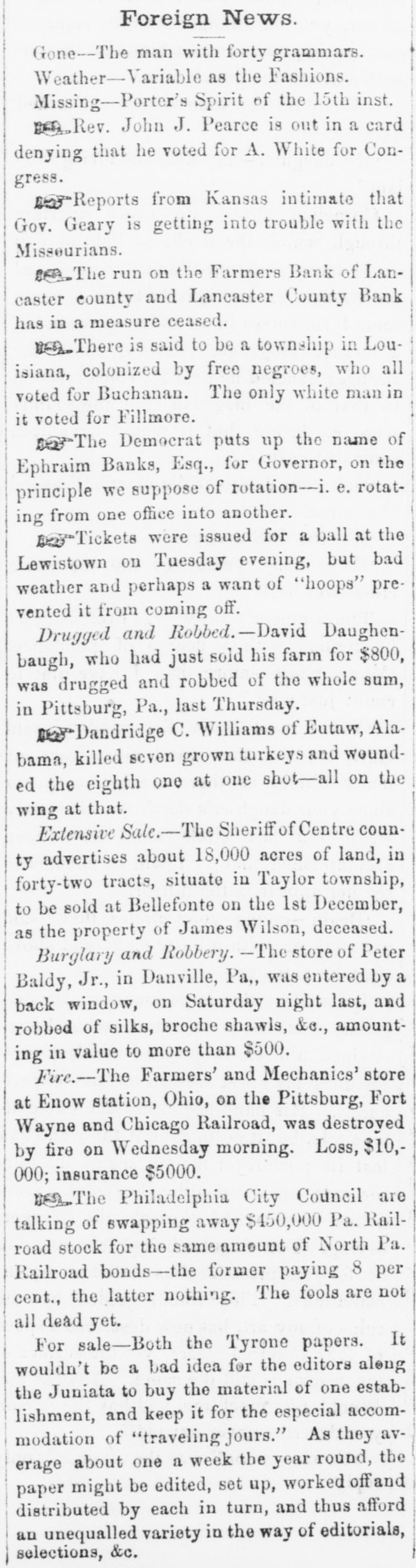 Foreign News. Gone-The man with forty grammars. Weather-Variable as the Fashions. Missing-Porter's Spirit of the 15th inst. IN Rev. John J. Pearce is out in a card denying that he voted for A. White for Congress. Reports from Kansas intimate that Gov. Geary is getting into trouble with the Missourians. The run on the Farmers Bank of Lancaster county and Lancaster County Bank has in a measure ceased. IS There is said to be a township in Louisiana, colonized by free negroes, who all voted for Buchanan. The only white man in it voted for Fillmore. The Democrat puts up the name of Ephraim Banks, Esq., for Governor, on the principle we suppose of rotation-i. e. rotating from one office into another. Tickets were issued for a ball at the Lewistown on Tuesday evening, but bad weather and perhaps a want of "hoops" prevented it from coming off. Drugged and Robbed.-David Daughenbaugh, who had just sold his farm for $800, was drugged and robbed of the whole sum, in Pittsburg, Pa., last Thursday. Dandridge C. Williams of Eutaw, Alabama, killed seven grown turkeys and wounded the eighth one at one shot-all on the wing at that. Extensive Sale.-The Sheriff of Centre county advertises about 18,000 acres of land, in forty-two tracts, situate in Taylor township, to be sold at Bellefonte on the 1st December, as the property of James Wilson, deceased. Burglary and Robbery. -The store of Peter Baldy, Jr., in Danville, Pa,, was entered by a back window, on Saturday night last, and robbed of silks, broche shawls, &c., amounting in value to more than $500. Fire.-The Farmers' and Mechanics' store at Enow station, Ohio, on the Pittsburg, Fort Wayne and Chicago Railroad, was destroyed by fire on Wednesday morning. Loss, $10,000; insurance $5000. The Philadelphia City Council are talking of swapping away $450,000 Pa. Railroad stock for the same amount of North Pa. Railroad bonds-the former paying 8 per cent., the latter nothing. The fools are not all dead yet. For sale-Both the Tyrone papers. It wouldn't be a bad idea for the editors along the Juniata to buy the material of one establishment, and keep it for the especial accommodation of "traveling jours." As they average about one a week the year round, the paper might be edited, set up, worked off and distributed by each in turn, and thus afford an unequalled variety in the way of editorials, selections, &c.