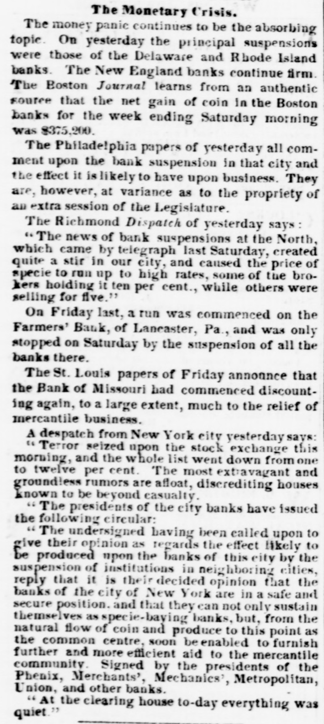 The Monetary Crisis. The money panic continues to be the absorbing topic. On yesterday the principal suspensions were those of the Delaware and Rhode Island banks. The New England banks continue firm. The Boston Journal learns from an authentic source that the net gain of coin in the Boston banks for the week ending Saturday morning was $375,200. The Philadelphia papers of yesterday all comment upon the bank suspension in that city and the effect it is likely to have upon business. They are, however, at variance as to the propriety of an extra session of the Legislature. The Richmond Dispatch of yesterday says : The news of bank suspensions at the North, which came by telegraph last Saturday, created quite a stir in our city, and caused the price of specie to run up to high rates, some of the brohers holding it ten per cent., while others were selling for five." On Friday last, a run was commenced on the Farmers' Bank, of Laneaster, Pa., and was only stopped on Saturday by the suspension of all the banks there. The St. Louis papers of Friday announce that the Bank of Missouri had commenced discounting again, to a large extent, much to the relief of mercantile business. A despatch from New York city yesterday says: Terror seized upon the stock exchange this morning, and the whole list went down from one to twelve per cent. The most extravagant and groundless rumors are affoat, discrediting houses known to be beyond casualty. The presidents of the city banks have issued the following circular: The undersigned having been called upon to give their opinion as regards the effect likely to be produced upon the banks of this city by the suspension of institutions in neighboring cities, reply that it is their decided opinion that the banks of the city of New York are in a safe and secure position. and that they can not only sustain themselves as specie-baying banks, but, from the natural flow of coin and produce to this point as the common centre, soon be enabled to furnish further and more efficient aid to the mercantile community. Signed by the presidents of the Phenix, Merchants', Mechanics', Metropolitan, Union, and other banks. quiet." At the clearing house to-day everything was