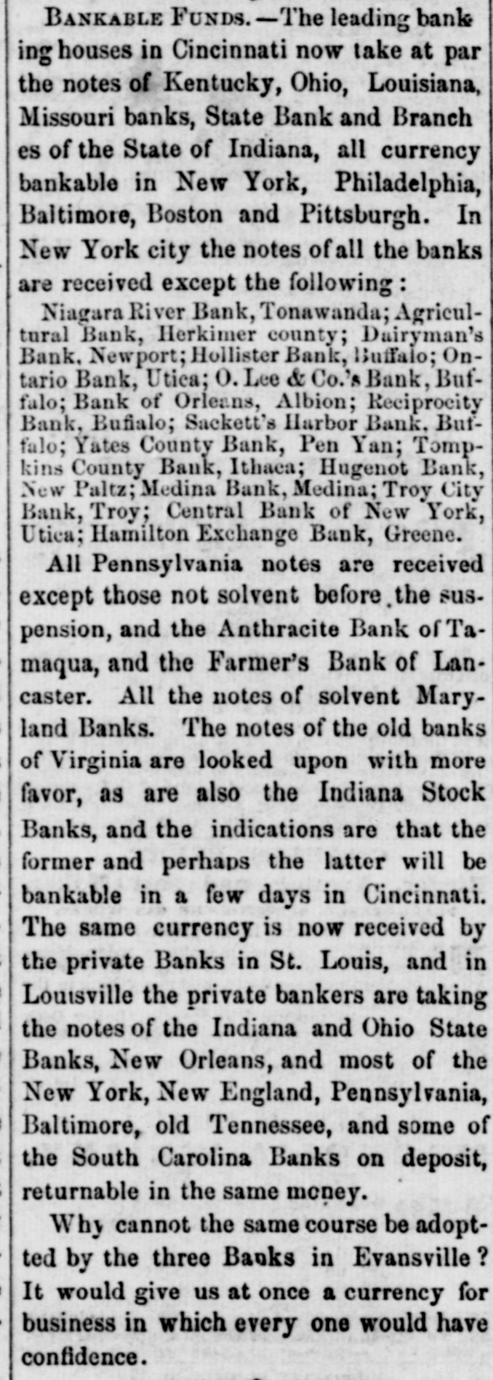 BANKABLE FUNDS. -The leading bank ing houses in Cincinnati now take at par the notes of Kentucky, Ohio, Louisiana, Missouri banks, State Bank and Branch es of the State of Indiana, all currency bankable in New York, Philadelphia, Baltimore, Boston and Pittsburgh. In New York city the notes of all the banks are received except the following Niagara River Bank, Tonawanda; Agricultural Bank, Herkimer county; Dairyman's Bank, Newport; Hollister Bank, Buffalo; Ontario Bank, Utica; O. Lee & Co.'s Bank, Buffalo; Bank of Orleans, Albion; Reciprocity Bank, Bufialo; Sackett's Harbor Bank, Buffalo; Yates County Bank, Pen Yan; Tompkins County Bank, Ithaca; Hugenot Bank, New Paltz; Medina Bank, Medina; Troy City Bank, Troy; Central Bank of New York, Utica; Hamilton Exchange Bank, Greene. All Pennsylvania notes are received except those not solvent before. the suspension, and the Anthracite Bank of Tamaqua, and the Farmer's Bank of Lancaster. All the notes of solvent Maryland Banks. The notes of the old banks of Virginia are looked upon with more favor, as are also the Indiana Stock Banks, and the indications are that the former and perhaps the latter will be bankable in a few days in Cincinnati. The same currency is now received by the private Banks in St. Louis, and in Louisville the private bankers are taking the notes of the Indiana and Ohio State Banks, New Orleans, and most of the New York, New England, Pennsylvania, Baltimore, old Tennessee, and some of the South Carolina Banks on deposit, returnable in the same money. Why cannot the same course be adoptted by the three Banks in Evansville ? It would give us at once a currency for business in which every one would have confidence.