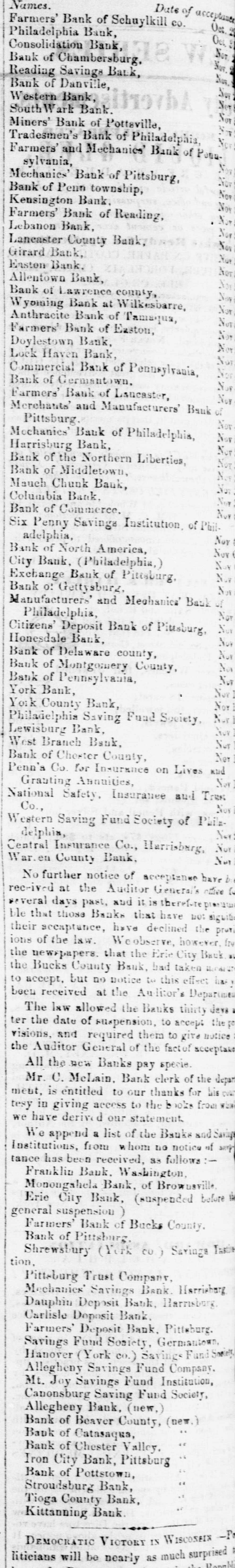 Consolidation Bank, Nov. Bank of Chambersburg, Nov. Reading Savings Bank, Bank of Danville, Nov.1 Western Bank, ,Nove South Wark Bank Nov. Miners' Bank of Pottaville, WE Tradesmen's Bank of Philadelphia, Nov, Farmers' and Mechanics' Bank of Ponasylvania, Nov: Mechanics' Bank of Pittsburg, AGA Bank of Penn township, Nov: Kensington Bank, Nov, Farmers' Bank of Reading, Nov. Lebanon Bank, Nor: Laneaster County Bank, Nov Girard Bank, Nor Easton Bank, Nov, Allentown Bank, Nov, Bank of Lawrence county, Novi Wyoming Bank at Wilkesbarre, Nor, Anthracite Bank of Tamaqua, Nov, Farmers' Bank of Easton, Nov. Doylestown Bank, Nov. Lock Haven Bank, Nor Commercial Bank of Pennsylvania, Nov. Bank of Germantown, Nov. Farmers' Bank of Lancaster, Nov. Merchants' and Manufacturers' Bank of Pittsburg. Nov. Mochanies' Bank of Philadelphia, Nov Harrisburg Bank, Nov. Bank of the Northern Liberties, Nov, Bank of Middletown, Nov. Mauch Chunk Bank, Nov. Columbia Bank, ,Now, Bank of Commerce. Nov Six Penny Savings Institution, of Philadelphia, Nov / Bank of North America, Nov City Bank, (Philadelphia,) Nov Nov Exchange Bank of Pittsburg, Bank 0: Gettysburg, Nov Manufacturers' and Mechanica' Bank of Philadelphia, Nov Nov Citizens' Deposit Bank of Pittsburg, Honesdale Bank, No Bank of Delaware county, Nov. Nov Bank of Montgomery County, Bank of Pennsylvania, NW York Bank, Nov1 York County Bank, Nor] Nor] Philadelphia Saving Fund Society, Lewisburg Bank, Nov West Branch Bank, Nor Not Bank of Choster County, Penn'a Co. for Insurance on Lives and Granting Annuities, Nov.] National Safety, Insurance and Trust Co., Nov Western Saving Fund Society of Philadelphia, Nov. Central Insurance Co., Harrisbarg, Nov War. en County Bank, Not No further notice of acceptance have be received at the Auditor General's office (4 several days past, and it is therefore preus ble that those Banks that have not signition their accaptance, have declined the provi ions of the law. Woobserve, however. fre the newspapers. that the Erie City Back au the Bucks County Bank, bad taken to accept, but no notice to this effect has : been received at the Author's Department The law allowed the Banks thirty days ter the date of suspension, to accept the pr visions, and required them to give notice the Auditor General of the factor acceptant All the new Banks pay specie. Mr. C. McLain, Bank clerk of the depart ment, is entitled to our thanks for his tesy in giving access to the books from which we have derive di our statement We append a list of the Banks and Savings Institutions, from hom no notice of servy tance has been received, as follows :-