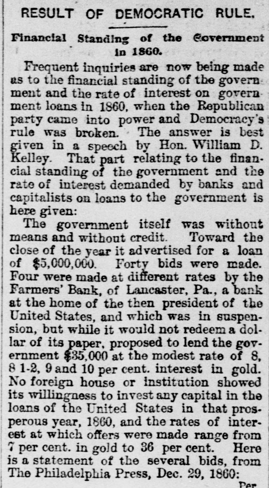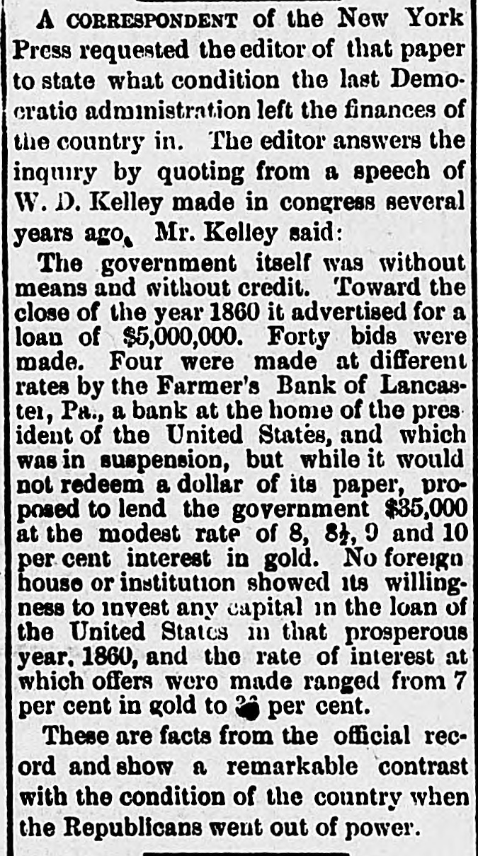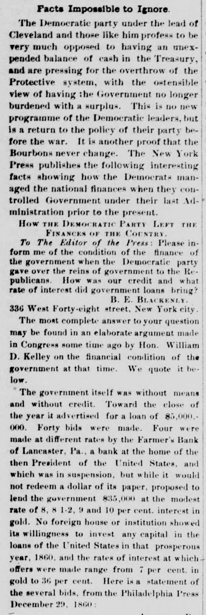 Facts Impossible to Ignore. The Democratic party under the lead of Cleveland and those like him profess to be very much opposed to having an treepended balance of cash in the Treasury, and are pressing for the overthrow of the Protective system, with the ostensible view of having the Government no longer burdened with a surplus. This is no new programme of the Democratic leaders, but is a return to the policy of their party before the war. It is another proof that the Bourbons never change. The New York Press publishes the following interesting facts showing how the Democrats managed the national finances when they controlled Government under their last Administration prior to the present. How THE DEMOCRATIC PARTY LEFT THE FINANCES OF THE COUNTRY. To The Editor of the Press: Please inform me of the condition of the finance of the government when the Democratic party gave over the reins of government to the Republicans. How was our credit and what rate of interest did government loans bring? B. E. BLACKENLY. 336 West Forty-eight street, New York city. The most complete answer to your question may be found in an elaborate argument made in Congress some time ago by Hon. William D. Kelley on the financial condition of the government at that time. We quote it below. The government itself was without means and without credit. Toward the close of the year it advertised for a loan of 85,000,000. Forty bids were made. Four were made at different rates by the Farmer's Bank of Lancaster, Pa., a bank at the home of the then President of the United States, and which was in suspension, but while it would not redeem a dollar of its paper, proposed to lend the government 835,000 at the modest rate of 8, 8 1-2, 9 and 10 per cent. interest in gold. No foreign house or institution showed its willingness to invest any capital in the loans of the United States in that prosperous year, 1860, and the rates of interest at which offers were made range from 7 per cent. in gold to 36 per cent. Here is a statement of the several bids, from the Philadelphia Press December 29, 1860: