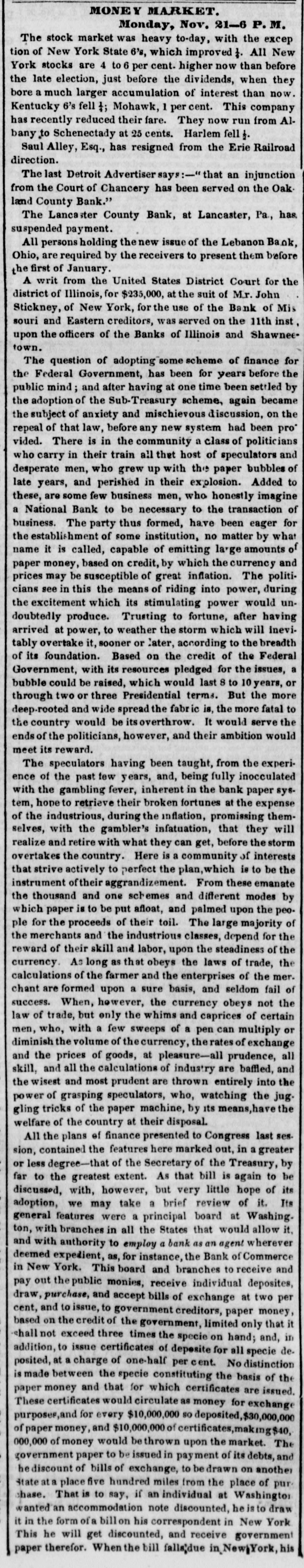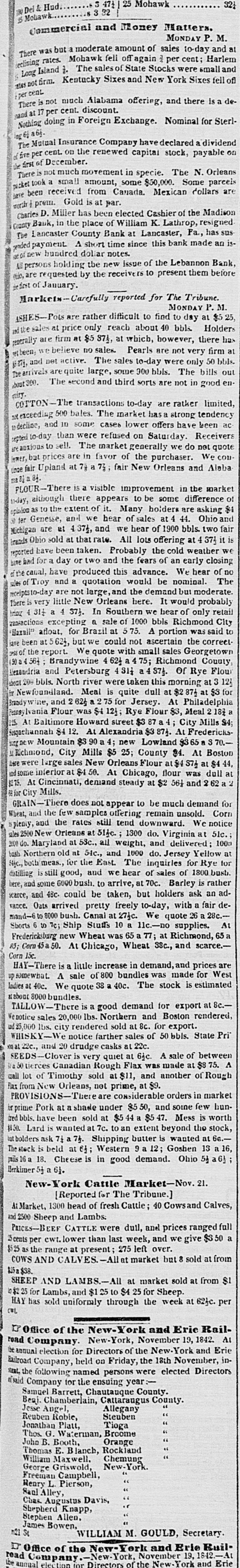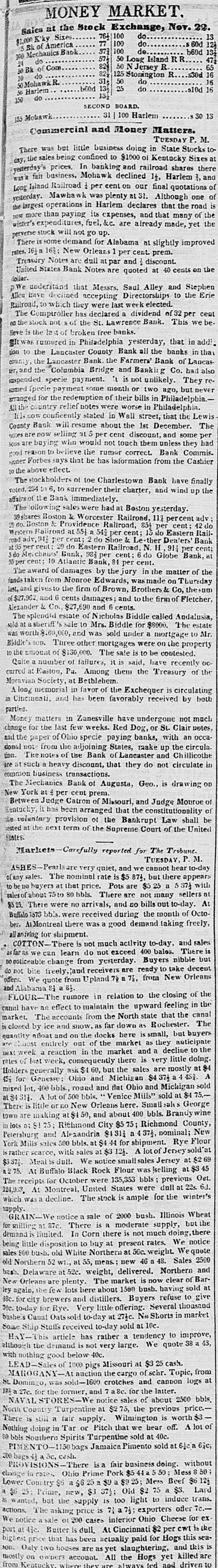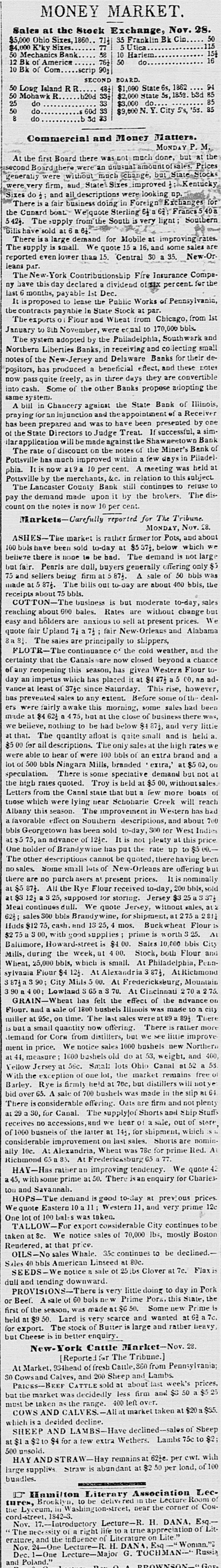 25 Mohawk Commercial and Toney Matters. MONDAY P. M. was but a moderate amount of sales to day and at eclining There rates. Mohawk fell off again 23 per cent: Harlem Long Island 3. The sales of State Stocks were small and firm. Kentucky Sixes and New York Sixes fell of percent There is not much Alabama offering, and there is deand a 17 per cent. discount. Nothing doing in Foreign Exchange. Nominal for SterlThe Mutual Insurance Company have declared a dividend drave per cent. OD the renewed capital stock, payable on first of December. There is not much movement in specie. The N. Orleans tucket 100 a small amount, some $50,000. Some parceis have been received from Canada. Mexican dollars are worth prem. Gold is at par. Charles D. Milier has been elected Cashier of the Madison County Bauk, in the place of William K. Lathrop, resigned The Lancaster County Bank at Lancaster, Fa., has sus sended payment A short time since this bank made an isseo: new hundred dollar notes. All persons holding the new issue of the Lebannon Bank, aje,are requested by the receivers to present them before refirst of January. Markets-Carefully reported for The Tribune. MONDAY P.M. ASHES-Pots are rather difficult to find to day at $5 5 25, the sales at price only reach about 40 bbls. Holders federally are firm at $5 871, at which, however, there has at been, we believe no salex. Pearls are not very firm $5.875, and not active. The sales to-day were only 50 bbls. Treamivals are quite large, some 300 bbls. The bills out boat 300. The second and third sorts are not in good enairy COTTON-The transactions to-day are ratker limited, or exceeding 500 bales. The market has strong tendency decline, and in some cases lower offers have been ac epted to-day than were refused on Saturday. Receivers reactions to sell. The market generally we do not quote leaves, but prices are in favor of the purchaser. We COD tinge fair Upland at 7g 73; fair New Orleans and Alaba FLOUR-There is a visible improvement in the market to-day, although there appears to be some difference of opinion to the extent of it. Many holders are asking $4 0 ter Genesse, and we hear of sales at 44. Ohio and Michigan are at 437, and we hear of 1900 bbls. two fair brands Ohio sold at that rate. All lots offering at 4 374 it is reported have been taken. Probably the cold weather we have had for a day or two and the fears of an early closing of the canal, have produced this advance. We hear of no ules of Troy and a quotation would be nominal. The receiptsto-day are not large, and the demand but moderate There very little New Orleans here. It would probably brioz 311 a 4 37). In Southern we hear of only retail transactions excepting a sale of 1000 bbls Richmond City Haxali" afloat, for Brazil at 575. A portion was said to are been at 562, but we could not ascertain the correctless of the report. We quote with small sales Georgetown Brandywine 4 624 475; Richmond County Alexandria and Petersburg 4311 478 Of Rye Flour bbls. North river were taken this morning at 12) for Newfoundland. Meal is quite dull at $2 871 at $3 for Brandywine, and 2 62/ 75 for Jersey. At Philadelphia Pennsylvania Flour was $4 12}; Rye Flour $3, Meal 2187 a 125. A: Baltimore Howard street $3 87 44; City Mills S4; Sugnehannah $412. At Alexandria $3 874. At Fredericksbug new Mountain $3.90 a 4; new Lowland $365 S 70.it Richmond, City Mills $5 25; County 34. At Boston tere were large sales New Orleans Flour at $4 571 at 444, and some inferior at $4.50. At Chicago, flour was dull at $275. At Cincinnati, demand steady at $2 561 and 262 2 58 for City Mills. GRAIN-There does not appear to be much demand for Wheat, and the few samples offering remain unsold. Corn splenty, and the rates still tend downward. We notice sales 2500 New Orleans at 514c. 1300 do. Virginia at 51c. 2000 do. Maryland at 53c. all weight, and delivered 100: bash Northern old at 54c., and 1000 do. Jersey Yellow at 54fc., both meas., for the East. The inquiries for Rye for distilling is still good, and we hear of sales of 1800 busb. here, and some 6000 bush to arrive, at 70c. Barley is rather scarce, and 48c. could be taken, but holders ask an advacce. Oats arrived pretty freely to-day, with a fair demand-6 to 8000 bush. Canal at 27tc. We quote 26 a 28c.-At Sborts to 7c; Ship Stutt's 10 a 11c.-Do supplies. Fredericksburg new Wheat was 65 77; at Richmond, 65 85; Corn 45a50. At Chicago, Wheat SSc., and scaree.Corn HAY-There is a little increase in demand, and prices are upsomewhat. A sale of 800 bundles was made for West ladies 40c. We quote 38 40c. The stock is estimated about 8000 bundles. TALLOW-There is a good demand for export at 8c.We notice sales 20,000 lbs. Northern and Boston rendered, ud 25,000 lbs. city rendered sold at 8c. for export. WHISKY-We notice farther sales of 50 bbls. State Pri was 22c., and 20 drudge casks at 22c. SEEDS-Clover is very quiet at 6AC. A sale of between a50tierces Canadian Rough Flax was made at $8 75. A call lot of Timothy sold at $11, and another of Rough fax from New Orleans, not prime, at $9. PROVISIONS-There are considerable orders in market ir prime Pork at shade under $5.50, and soine few huntred bbls. have been sold at $544a $5 47. Mess is worth #50. Lard is wanted at 7c. to an extent beyond the stock, bulberders ask 7 a 7g. Shipping butter is wanted at 6c.The stock is beld at 61; Western 9 12; Goshen 13 a 16, pails 16 a 18. Cheese is in good demand. Ohio 51 a6} Herkimer New-York Cattle Market-Nov. 21. Reported for The Tribune.] i Market, 1300 head of fresh Cattle; 40 Cows and Calves, and 2500 Sheep and Lambs PRICES-BEEF CATTLE were dull, anel prices ranged full a 25 cents per cwt.lower than last week, and we give $8.50 $5.25 as the range at present; 275 left over. COWS AND CALVES. -All at market but 8 sold at from 5a$38. SHEEP AND LAMBS.- All at market sold at from $1 25 for Lambs, and $12 to $4 4 25 for Sheep. HAY has sold uniformly through the week at 623c. per cwt, D Office of the New-York a