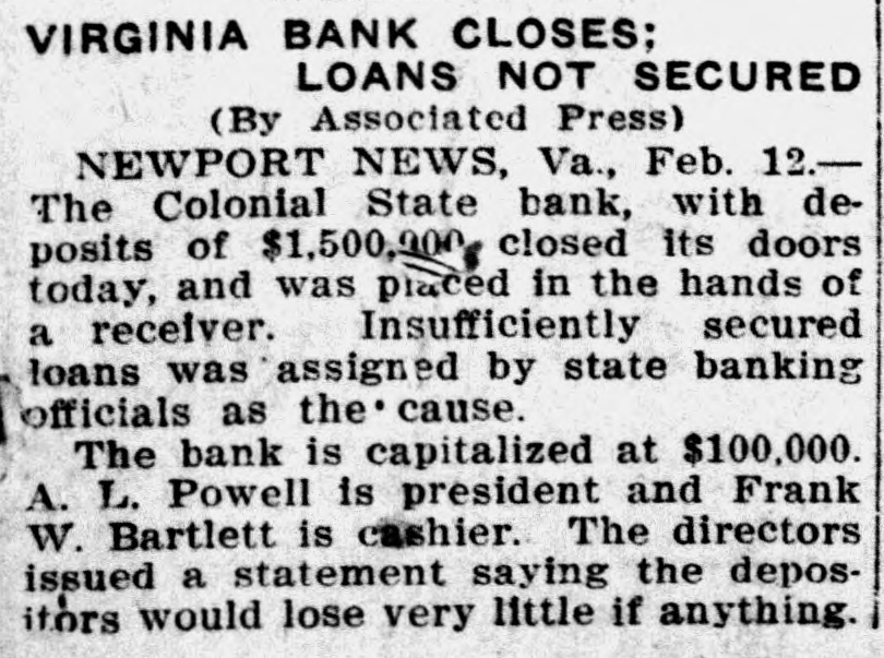 VIRGINIA BANK CLOSES; LOANS NOT SECURED (By Associated Press) NEWPORT NEWS, Va., Feb. 12.The Colonial State bank, with deposits of $1,500,000 closed its doors today, and was placed in the hands of a receiver. Insufficiently secured loans was assigned by state banking officials as the'cause. The bank is capitalized at $100,000. A. L. Powell is president and Frank W. Bartlett is cashier. The directors issued a statement saying the depositors would lose very little if anything.