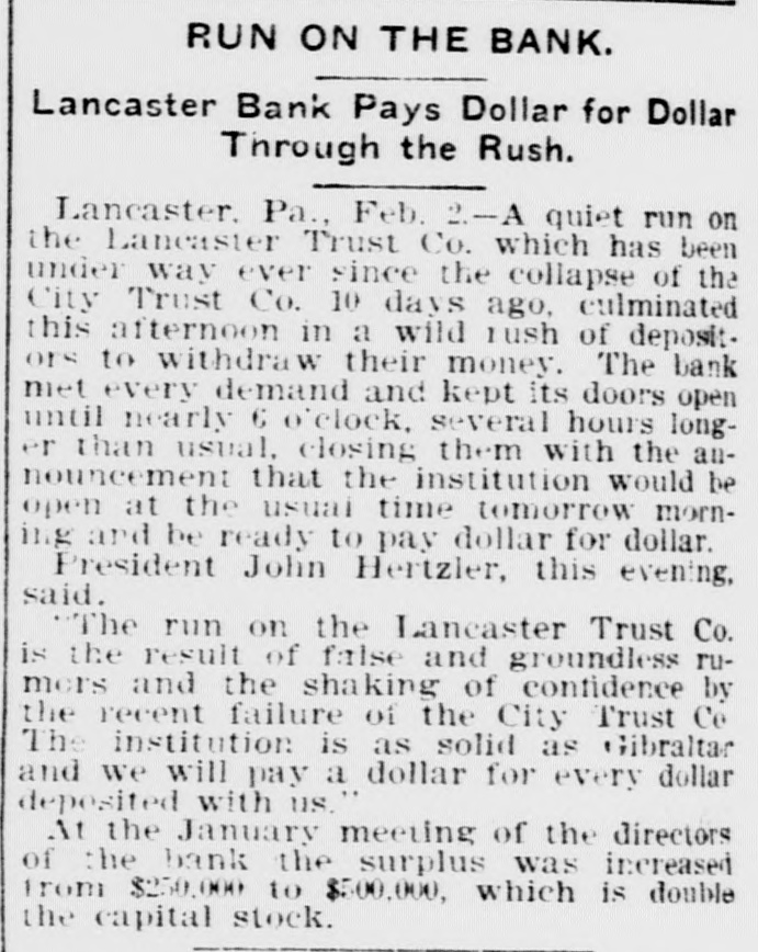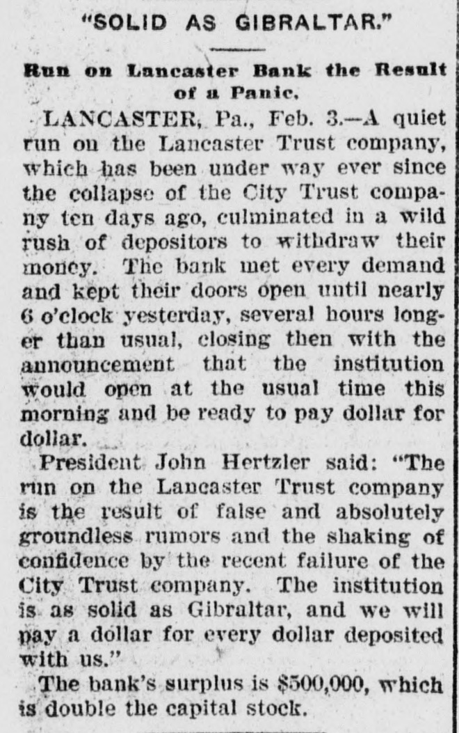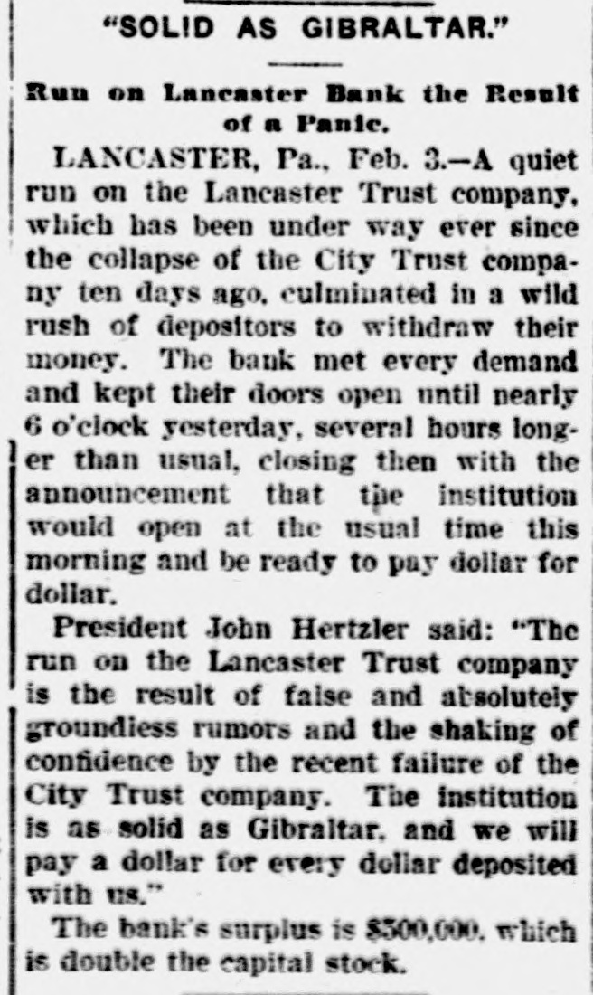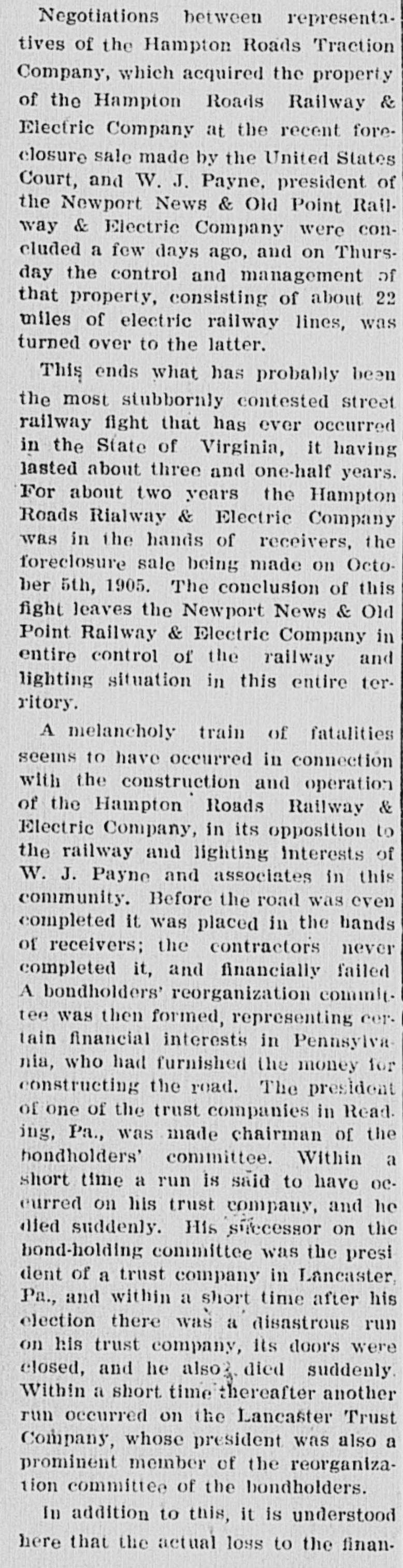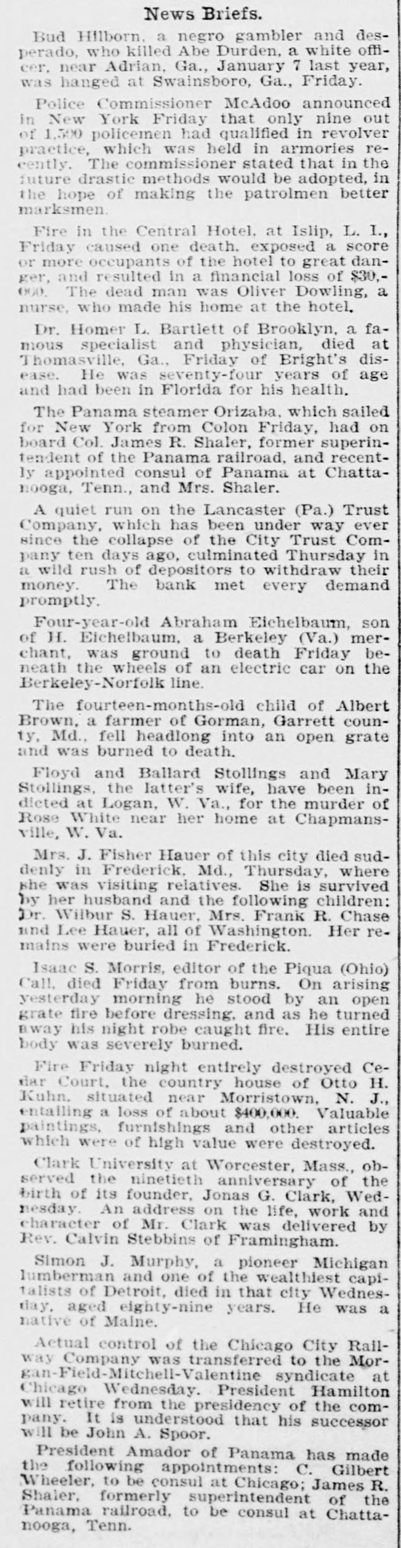 News Briefs. Bud Hilborn. a negro gambler and desperado, who killed Abe Durden, a white officer, near Adrian, Ga., January 7 last year, was hanged at Swainsboro, Ga., Friday. Police Commissioner McAdoo announced in New York Friday that only nine out of 1,500 policemen had qualified in revolver practice, which was held in armories recently. The commissioner stated that in the future drastic methods would be adopted, in the hope of making the patrolmen better marksmen. Fire in the Central Hotel, at Islip, L. I., Friday caused one death. exposed a score or more occupants of the hotel to great danger, and resulted in a financial loss of $30,000. The dead man was Oliver Dowling, a nurse, who made his home at the hotel. Dr. Homer L. Bartlett of Brooklyn, a famous specialist and physician, died at Thomasville, Ga., Friday of Bright's disease. He was seventy-four years of age and had been in Florida for his health. The Panama steamer Orizaba, which sailed for New York from Colon Friday, had on board Col. James R. Shaler, former superintendent of the Panama railroad, and recently appointed consul of Panama at Chattanooga, Tenn., and Mrs. Shaler. A quiet run on the Lancaster (Pa.) Trust Company, which has been under way ever since the collapse of the City Trust Company ten days ago, culminated Thursday in a wild rush of depositors to withdraw their money. The bank met every demand promptly. Four-year-old Abraham Eichelbaum, son of H. Eichelbaum, a Berkeley (Va.) merchant, was ground to death Friday beneath the wheels of an electric car on the Berkeley-Norfolk line. The fourteen-months-old child of Albert Brown, a farmer of Gorman, Garrett county, Md., fell headlong into an open grate and was burned to death. Floyd and Ballard Stollings and Mary Stollings, the latter's wife, have been indicted at Logan, W. Va., for the murder of Rose White near her home at Chapmansville, W. Va. Mrs. J. Fisher Hauer of this city died suddenly in Frederick. Md., Thursday, where she was visiting relatives. She is survived by her husband and the following children: Dr. Wilbur S. Hauer, Mrs. Frank R. Chase and Lee Hauer, all of Washington. Her remains were buried in Frederick. Isaac S. Morris, editor of the Piqua (Ohio) Call, died Friday from burns. On arising yesterday morning he stood by an open grate fire before dressing. and as he turned away his night robe caught fire. His entire body was severely burned. Fire Friday night entirely destroyed Cedar Court, the country house of Otto H. Kuhn, situated near Morristown, N. J., entailing a loss of about $400,000. Valuable paintings, furnishings and other articles which were of high value were destroyed. Clark University at Worcester, Mass., observed the ninetieth anniversary of the birth of its founder, Jonas G. Clark, Wednesday. An address on the life, work and character of Mr. Clark was delivered by Rev. Calvin Stebbins of Framingham. Simon J. Murphy, a pioneer Michigan lumberman and one of the wealthiest capitalists of Detroit, died in that city Wednesday, aged eighty-nine years. He was a native of Maine. Actual control of the Chicago City Railway Company was transferred to the Morgan-Field-Mitchell-Valentine syndicate at Chicago Wednesday. President Hamilton will retire from the presidency of the company. It is understood that his successor will be John A. Spoor. President Amador of Panama has made the following appointments: C. Gilbert Wheeler, to be consul at Chicago; James R. Shaler, formerly superintendent of the Panama railroad. to be consul at Chattanooga, Tenn.