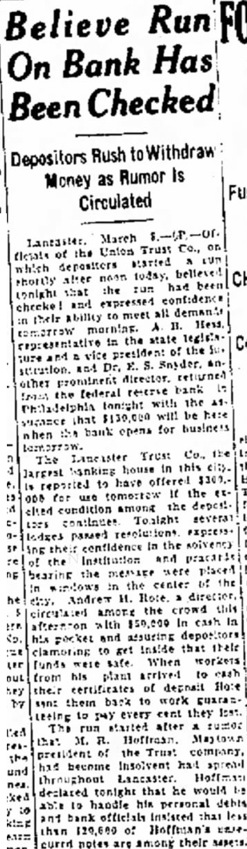 START Depositors of a Lancaster tution Withdraw Deposits OTHER BANKS COME TO RESCUE Lancaster, March of the Trust on started lieved night that the run had checked, in their ability meet all demands in the State Legislature and vice or the and another director, the Federal Reserve Bank tonight when the bank opens for Lancaster Trust Co., the larghouse in ported to offered $200,000 for several passed their confidence in the stitution and message were placed in windows in the centre the city. Andrew Rote, director, circuamong the this $50,000 cash, his pocket and assuring get inside that their funds were workers from his plant arrived cash their certificates deposit, Rote sent them back to pay every cent they The run started after rumor that the trust become insolvent, spread Hoffman declared night that he would be able bandle debts and officials insisted that than $20,000 among their assets.