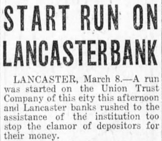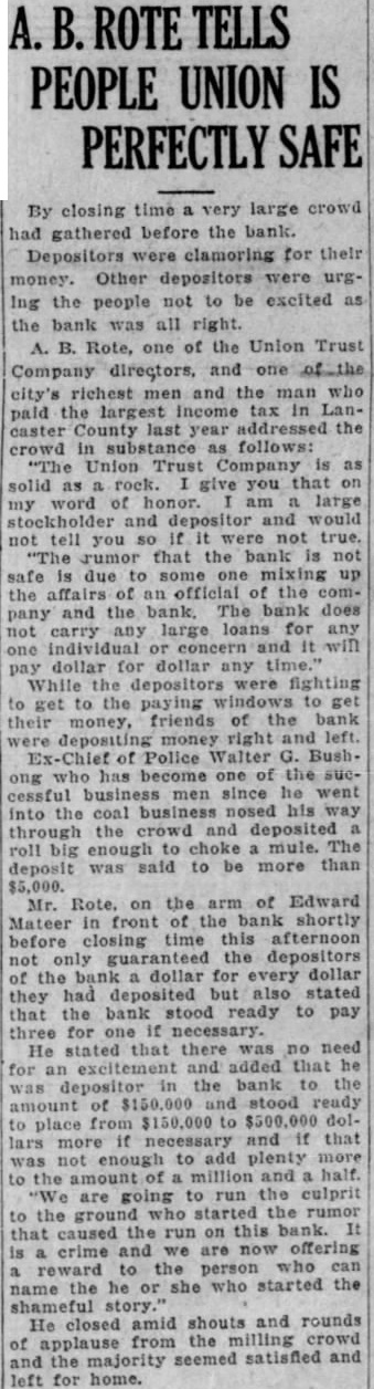 By closing time very large crowd had gathered before the bank. Depositors were clamoring for their money. Other depositors were urgIng the people not to be excited as the bank was all right. A. B. Rote, one of the Union Trust Company directors, and one city's richest and the man who paid the Income tax In Lancaster County year the crowd in : follows: Union Trust Company solid rock. give you that word of honor. am large my stockholder and depositor and would not tell you were not true. rumor that the bank is not safe due one the official the company and the The does not carry any large loans for individual and will pay dollar for dollar any While the depositors were fighting to get to the windows to get their friends of the bank right and left. of Police Walter ong has the men since he went into the business nosed his way through the crowd and deposited roll enough choke mule. The big was said to be more than $5,000. Mr. Rote. on the of Edward Mateer the bank shortly before closing time this afternoon not the depositors of the dollar for every dollar they deposited but also stated that the bank stood ready to pay three for one necessary. He stated that there no need for excitement and added that he the bank the amount of and stood ready to place $150,000 dollars necessary and that enough to add plenty million and half. to the amount of are going to run the culprit the ground started the rumor the this It that caused on and we are offering is reward the he or she who started the name the shameful story." closed amid shouts and rounds He from the milling crowd of applause seemed satisfied and majority left for home.