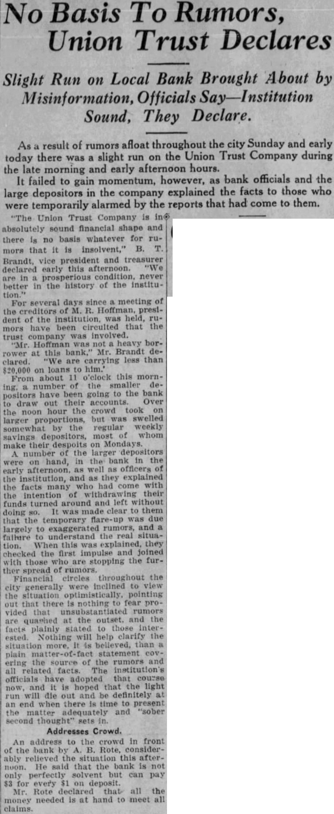 As result of rumors afloat throughout the city Sunday and early slight the Union Trust Company during today there was a run on the late morning and early afternoon hours. It failed to gain momentum, however, as bank officials and the large depositors in the company explained the facts to those who were temporarily alarmed by the reports that had come to them. Union Trust Company is in absolutely sound financial shape and there no basis whatever for rumors that it is insolvent," B. Brandt, vice president and treasurer declared early this afternoon. "We prosperious never better in the history of the institu-