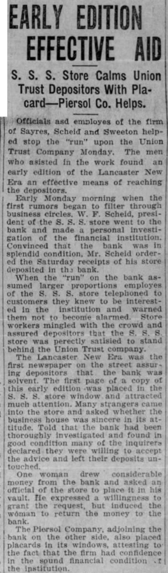 Officials asd employes of the firm of Sayres, Scheld and Sweeton helped stop "run" upon the Union Trust Company Monday. The who asisted In the work found early edition of the Lancaster New Era an effective means of reaching the depositors. Early Monday morning when the first rumors began filter through business circles. president store went the and investigation the Convinced was splendid Mr. the receipts of his store in bank. the the bank assumed store they knew the institution warned become Store mingled with the crowd and assured depositors store perectly to behind Trust company The New the solvent. The page copy this edition was placed the store much Many the store the titude. the bank had found good many the declared they willing to the and left their deposits One woman money from and asked the store to place his vault. He expressed willingness grant request, but induced woman to return the money the Piersol Company, adjoining the the also to the fact that the firm had the sound financial condition the