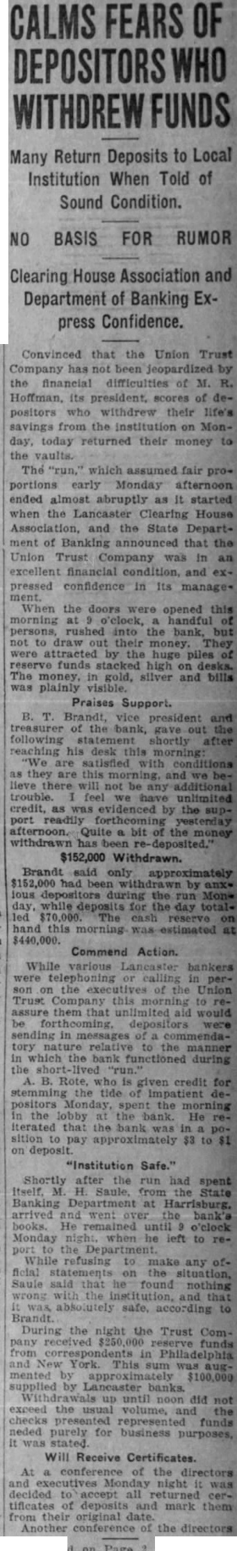 Combined with this reassuring paper which said to have the ability "talk" the depositors of the institution have the assurance of W. H. Soule, state bank examiner that conditions at the bank are "excellent." the situation Is the relterated action of the Lancuster Clearing House association last night that they endorse the solid condition of the Union Trust company and guarantee that said trust is perfectly solvent, The bank officials preparing today readjust their official organization through which the misunderstanding regarding the bank's status was begun. The run on the bank yesterday begun following or unsubrumors spread innocently by the "grapevine" which usually gossip fast. The rumors out of personal financial difficulties of M. R. Hoffman of Maytown, president of the Union Trust company. Mr. Hoffman's financial affairs have been mored for the past two weeks and on Friday he was takover by his creditors the gossips unfortunately connected his personal affairs with the affairs of the bank. (Continued on Page Seventeen)