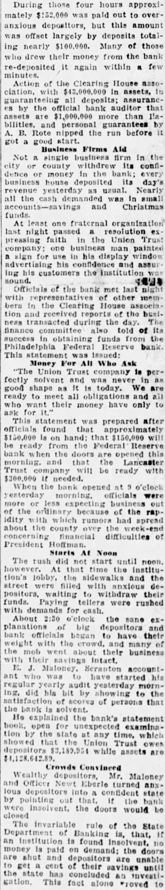 During those four hours approximately $152,000 was paid out to overanxious depositors, but this amount offset largely deposits totaling nearly $100,000. Many of those drew their money from the bank re-deposited again within few minutes. Action of the Clearing House the official bank auditor that $1,000,000 more than bilities, and guarantees nipped the run before good Firms Aid Not single business firm the county its confimoney business house deposited its day's Nearly the and Christmas funds. least one fraternal organization night passed resolution pressing faith the Union Trust one painted display assur ing his sound. Officials of the bank other Clearing House tion busithe finance obtaining funds the Philadelphia Federal bank. This issued: Money Ask Union perfectly good shape We ready and their money only prepared after officials found that $150,000 hand: Federal Lancaster Trust be ready needed. When opened yesterday were expecting the about county difficulties President Hoffman. Starts Noon The rush not tion's street filled positors, their funds. tellers were rushed for About o'clock the planations big depositors have the business accountstarted regular audit yesterday his showing of persons the Ho the bank's statement examinathe time, showed Union Trust depositors $3,189,954 while assets