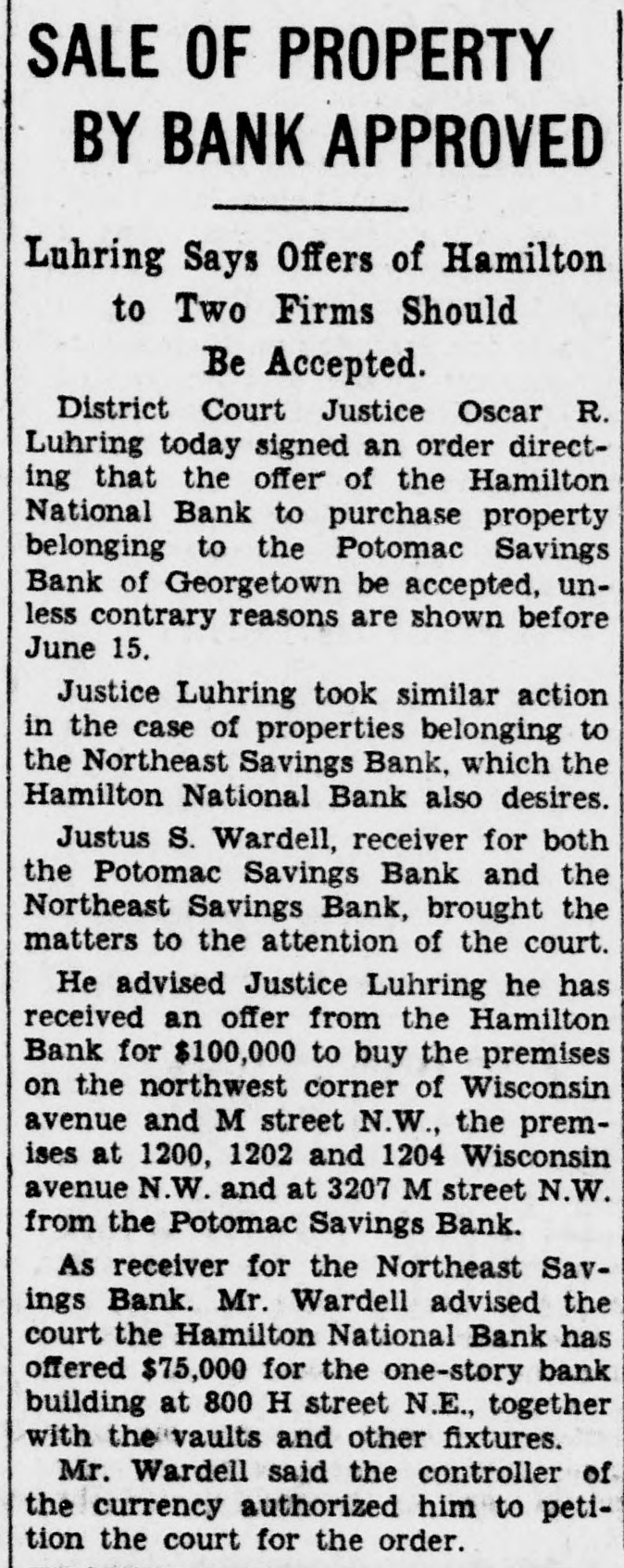 SALE OF PROPERTY BY BANK APPROVED Luhring Says Offers of Hamilton to Two Firms Should Be Accepted. District Court Justice Oscar R. Luhring today signed an order directing that the offer of the Hamilton National Bank to purchase property belonging to the Potomac Savings Bank of Georgetown be accepted, unless contrary reasons are shown before June 15. Justice Luhring took similar action in the case of properties belonging to the Northeast Savings Bank, which the Hamilton National Bank also desires. Justus S. Wardell, receiver for both the Potomac Savings Bank and the Northeast Savings Bank, brought the matters to the attention of the court. He advised Justice Luhring he has received an offer from the Hamilton Bank for $100,000 to buy the premises on the northwest corner of Wisconsin avenue and M street N.W., the premises at 1200, 1202 and 1204 Wisconsin avenue N.W. and at 3207 M street N.W. from the Potomac Savings Bank. As receiver for the Northeast Savings Bank. Mr. Wardell advised the court the Hamilton National Bank has offered $75,000 for the one-story bank building at 800 H street N.E., together with the vaults and other fixtures. Mr. Wardell said the controller of the currency authorized him to petition the court for the order.