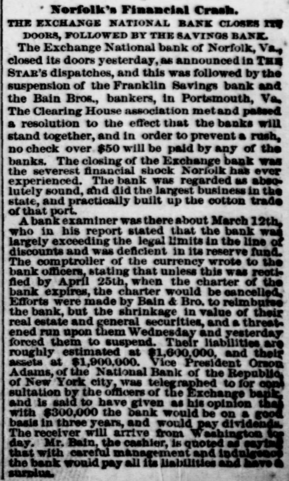 MISCELLANEOUS The grain in sight in the United States and Canada according to reports received by the secretary of the Chicago board of trade was wheat, 47,567,318 bushels, a decrease of 521,669 bushels as compared with the preceding Saturday; corn, 8,885,963, an increase of 994, 757; oats, 2,664,498, a decrease of 135,433; rye, 357,941, a decrease of 7,361; barley, 856.434, a decrease of 16,070. The stocks of grain in storein Chicago at the same were: Wheat, 15,881,150; corn, 207,385; oats, 533,163; rye, 135,353; barley, 5,038. At the stock-growers' convention at Cheyenne the secretary reported that the Wyoming association holds property valued at $100,000,000: that cattle from Texas are dangerous only for sixty days from the time of leaving their native ranges; that the reduction in freight rates secured from the Union and Northern Pacific roads benefits the association to the amount of $72,000 per annum, and that grain can never be raised on about SO per cent of the public lands now grazed upon. Death has clain.ed another member of the Illinois legislature, the victim this time being J. Henry Shaw, of Beardstown, Cass county. The deceased had been ailing during the whole session, but not 80 that he could not attend to his duties most of the time. He was over 60 years of age, and had served in the Thirtysecond general assembly, this being his second term. He had been an unswerving democrat, and thus there occurs another break in the ranks of that party. The estimated loss by fires during March was $9,000,000 in the United States and Canada. This is in excess of any previous entries during the corresponding month for the past ten years, the average fire loss reported for March having been less than $7, 000,000. The total loss by fire in the first three months of 1885 was $275,000,000, at which rate if kept up the result will be $110,000,000 for the year even if no extraordinary conflagrations occur. t At the Church of the Holy Trinity, in New York, Mrs. Tom Thumb was Monday married S to Count Primo Magis. Thousands of people gathered about the street corners, and there were many leaders of society who witnessed 0 the ceremony. The count presented his wife with a valuab'e estate in Italy, and they will y cross the Atlantic next month. h d The Exchange National bank of Norfolk, Virginia, owes its depositors over $3,000,000. , The examiner makes a gloomy report of its n condition. A committee of depositors has f gone to Washington to request the appoint1. ment of a resident of Norfolk as receiver. g General Dent was recently permitted by , Ithe physicians to see a reflection from General Grant's throat. He says no one can imagine n the progress made by the cancer, and that y n death at an early date is certain to result from the giving way of an artery. e Thomas Butterworth, an old and influential citizen of Rockford, Illinois, died in North d Carolina of heart disease. Judge John D. of Robertson, 94 years of age, a relative of Genh, eral Winfield Scott, passed away at South e Bend, Indiana. n e. The new police commissioners of Cincinnati have ordered the immediate closing of gambling houses, the expulsion of confidence men, h, be and the arrest of street-walkers for vagrancy and of sidewalk loafers for loitering. ris The Colombus Coal company has posted e notices at all its mines in the Hocking valley that it will issue no more orders for mery is chandise, but will pay its employes in cash e every Tuesday. Reports come from the mountain counties , of West Virginia that the suffering among the 8 people has been greatly exaggerated, but some animals have perished for lack of food. , e The commission appointed by the legislature 0 of Wisconsin to puachase a residence for the n governor secured the house and grounds forh merly owned by Ole Bull. for $20,000.