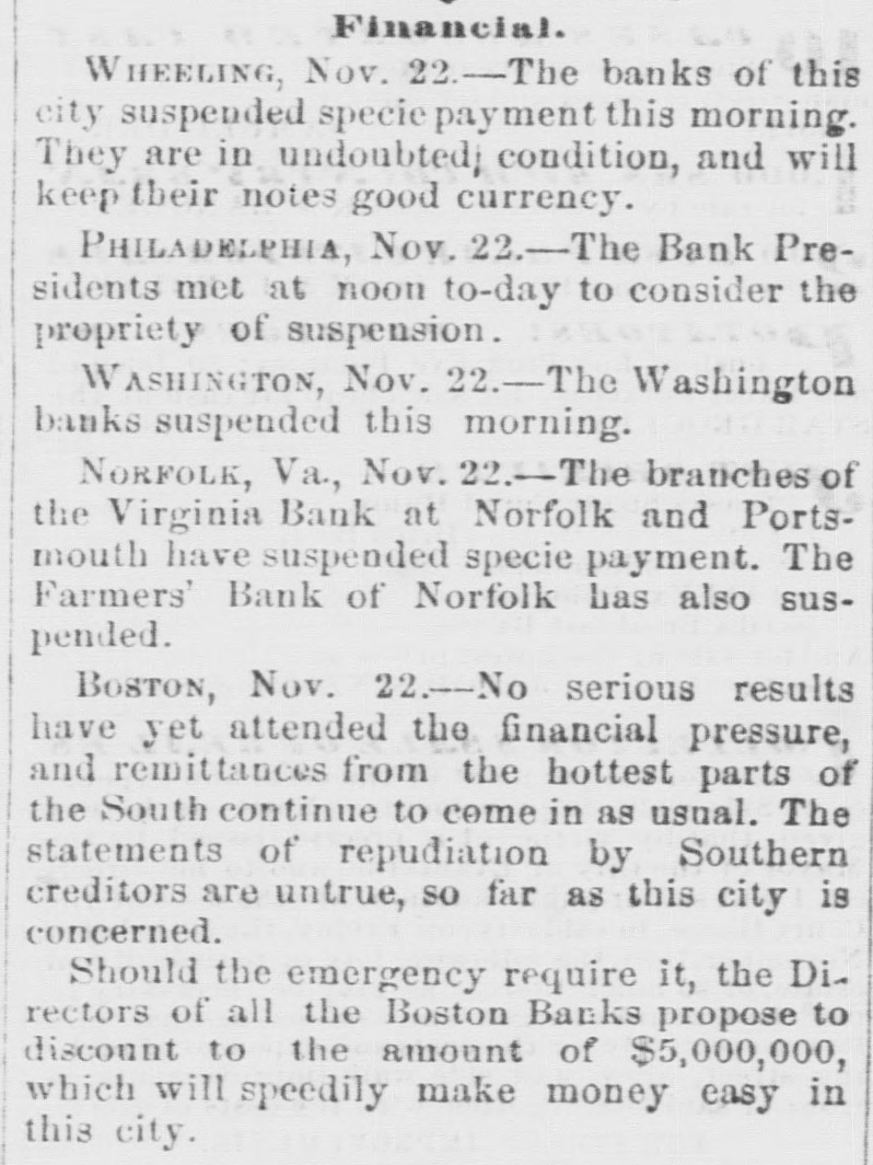 Suspension amid widespread financial pressure related to the secession movement and regional banking suspensions (Nov 1860).