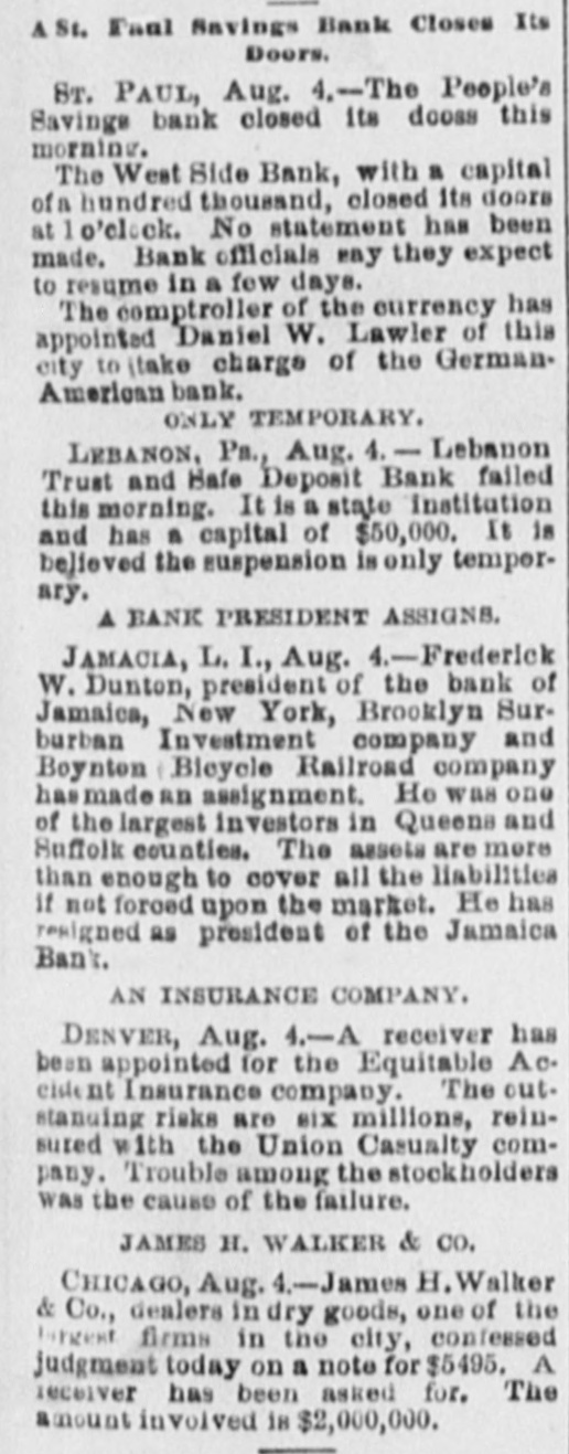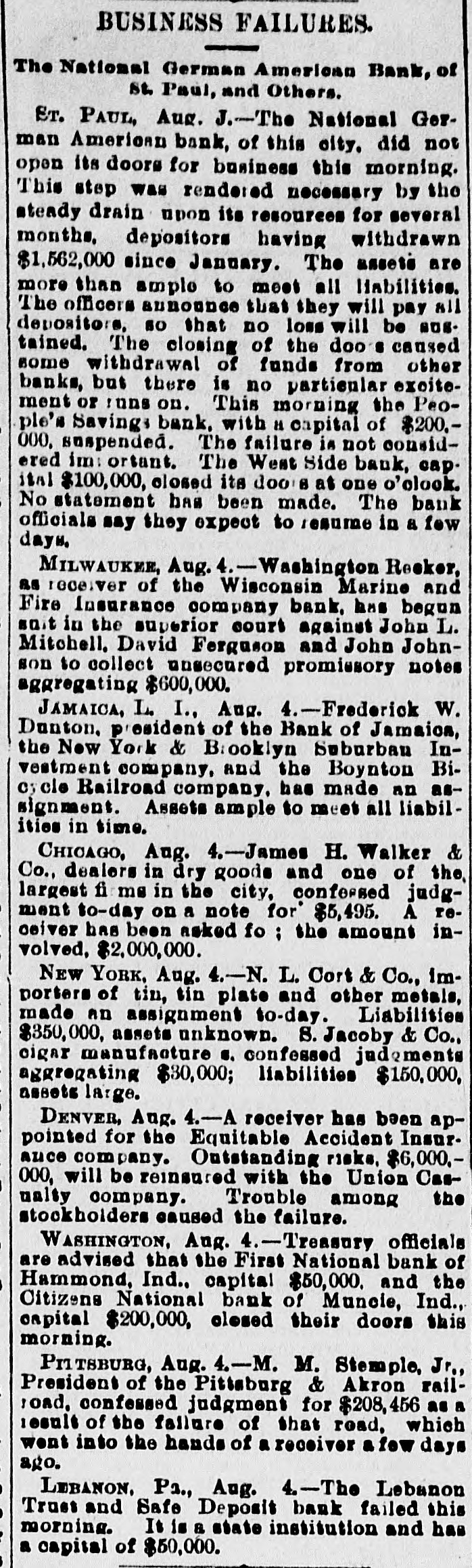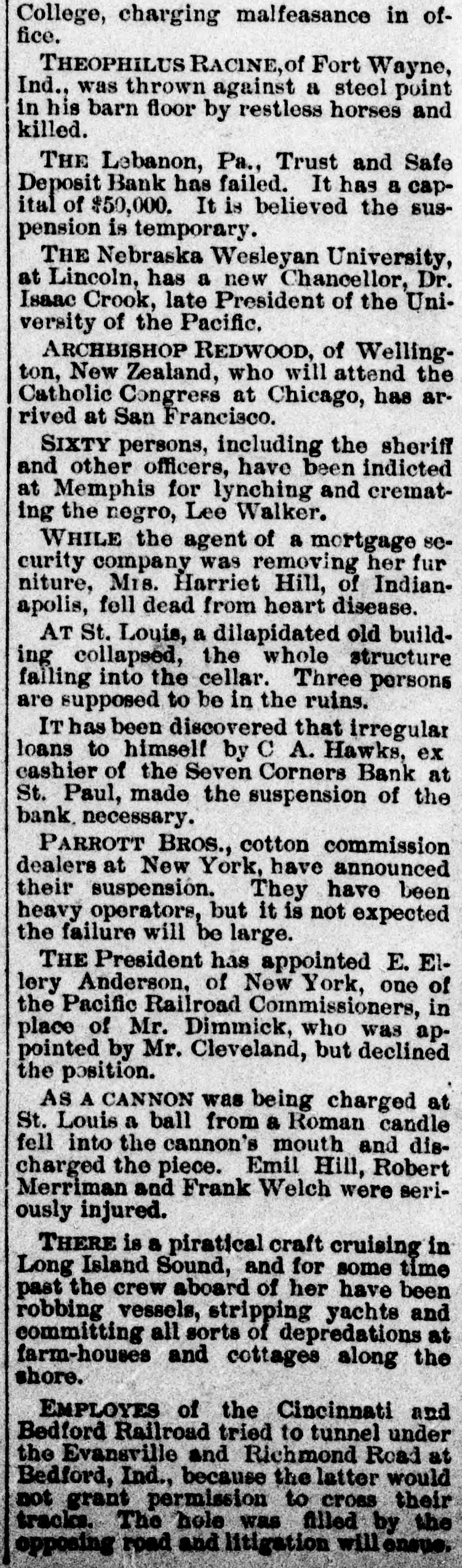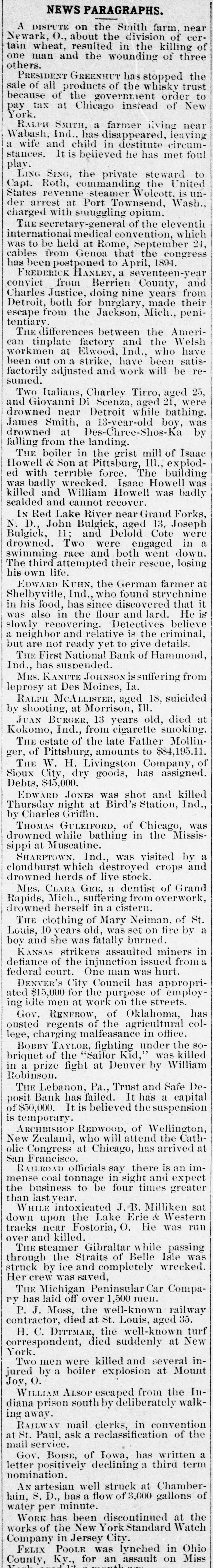 NEWS PARAGRAPHS. A DISPUTE on the Smith farm, near Newark, O., about the division of cer wheat, resulted in the killing of man and the wounding of three others. PRESIDENT GREENHUT has stopped the of all products of the whisky trust because of the government order to tax at Chicago instead of New York. RALPH SMITH, a farmer living near Wabash, Ind., has disappeared, leaving wife and child in destitute circumstances. It is believed he has met foul play. LING SING, the private steward to Capt. Roth, commanding the United States revenue steamer Wolcott, is un der arrest at Port Townsend, Wash. charged with sunggling opium. THE secretary-general of the eleventh international medical convention, which to be held at Rome, September 24 cables from Genoa that the congress been postponed to April, 1894. FREDERICK HANLEY, a seventeen-year convict from Berrien County, and Charles Justice, doing nine years from Detroit, both for burglary, made their escape from the Jackson, Mich., penitentiary. THE differences between the Ameritinplate factory and the Welsh workmen at Elwood, Ind., who have been out on a strike, have been satisfactorily adjusted and work will be resumed. Two Italians, Charley Tirro, aged 25, and Giovanni Di Scenza, aged 21, were drowned near Detroit while bathing James Smith, a 13-vear-old boy, was drowned at Des-Chree-Shos-Ka by falling from the landing. THE boiler in the grist mill of Isaac Howell & Son at Pittsburg, III., explod with terrible force. The building badly wrecked. Isaac Howell was killed and William Howell was badly scalded and cannot recover. IN Red Lake River near Grand Forks D., John Bulgick, aged 13, Joseph Bulgick, 11; and Delold Cote were drowned. Two were engaged in a swimming race and both went down The third attempted their rescue, losing own life. EDWARD KUHN, the German farmer ai Shelbyville, Ind., who found strvehnine his food, has since discovered that it also in the flour and lard. He is slowly recovering. Detectives believe neighbor and relative is the criminal are not ready yet to give details. THE First National Bank of Hammond Ind., has suspended. MRS. KANUTE JOHNSON issuffering from leprosy at Des Moines, Ia. RALPH MCALLISTER, aged 18, suicided by shooting, at Morrison, III. JUAN BURGER, 13 years old, died a Kokomo, Ind., from cigarette smoking THE estate of the late Father Mollinof Pittsburg, amounts to $84,195.11 THE W. H. Livingston Company, of Sioux City, dry goods, has assigned Debts, $45,000. EDWARD JONES was shot and killed Thursday night at Bird's Station, Ind. by Charles Griffin. THOMAS GULEIFORD, of Chicago, was drowned while bathing in the Missis sippi at Muscatine. SHARPTOWN, Ind., was visited by a cloudburst which destroyed crops and drowned herds of live stock. MRS. CLARA GEE, a dentist of Grand Rapids, Mich., suffering from overwork drowned herself in a cistern. THE clothing of Mary Neiman, of St. Louis, 10 years old, was set on fire by a boy and she was fatally burned. KANSAS strikers assaulted miners in defiance of the injunction issued from: federal court. One man was hurt. DENVER'S City Council has appropri $15,000 for the purpose of employ idle men at work on the streets. Gov. RENFROW, of Oklahoma, has ousted regents of the agricultural college, charging malfeasance in office. BOBBY TAYLOR, fighting under the so briquet of the "Sailor Kid,' was killed a prize fight at Denver by William Robinson. THE Lebanon, Pa., Trust and Safe Deposit Bank has failed. It has a capita of $50,000. It is believed the suspension temporary. ARCHBISHOP REDWOOD, of Wellington New Zealand, who will attend the Cath Congress at Chicago, has arrived at San Francisco. RAILROAD officials say there is an immense coal tonnage in sight and expect the business to be four times greater than last year. WHILE intoxicated J.B. Milliken sat down upon the Lake Erie & Western tracks near Fostoria, O. He was run and killed. THE steamer Gibraltar while passing through the Straits of Belle Isle was struck by ice and completely wrecked Her crew was saved, THE Michigan Peninsular Car Compahas laid off over 1,500 men. P. J. Moss, the well-known railway contractor, died at St. Louis, aged 35. H. C. DITTMAR, the well-known turi correspondent, died suddenly at New York. Two men were killed and several injured by a boiler explosion at Mount Joy, O. WILLIAM ALSOP escaped from the Indiana prison south by deliberately walkaway.