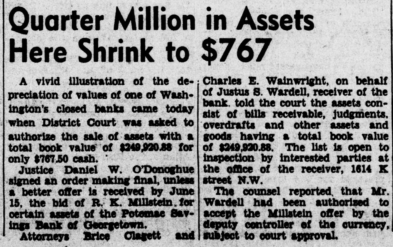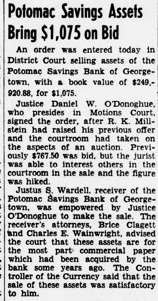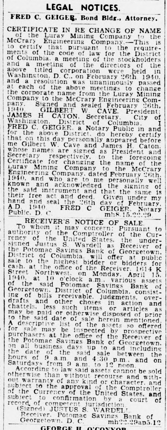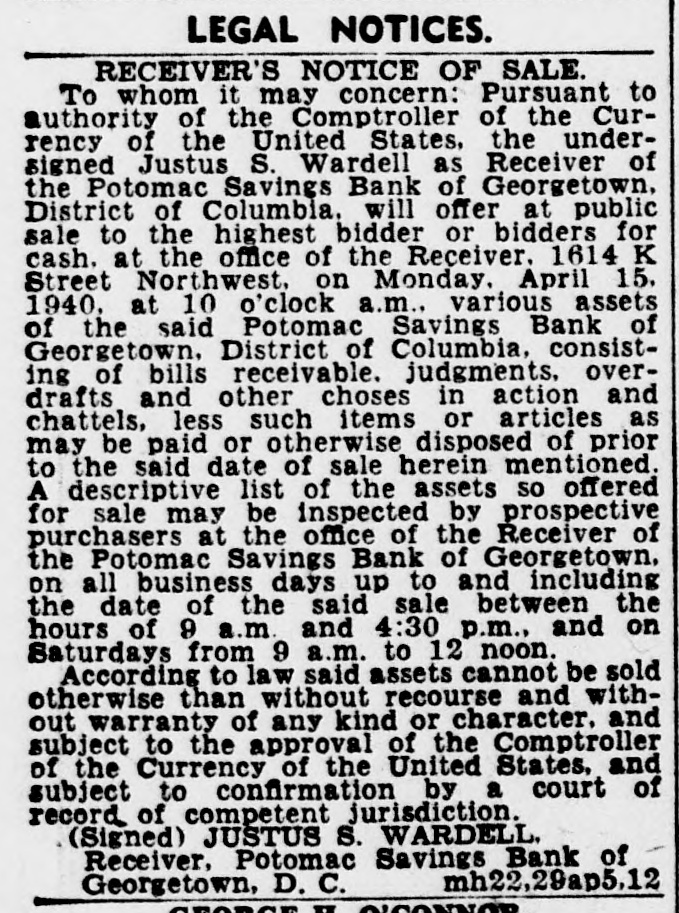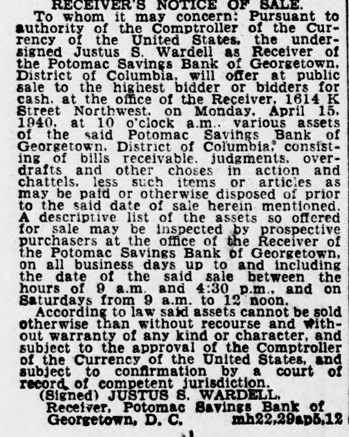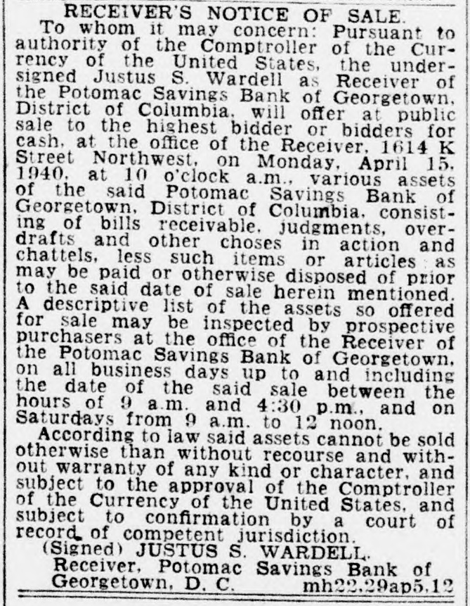 RECEIVER'S NOTICE OF SALE To whom it may concern: Pursuant to authority of the Comptroller of the Currency of the United States, the undersigned Justus S. Wardell as Receiver of the Potomac Savings Bank of Georgetown. District of Columbia. will offer at public sale to the highest bidder or bidders for cash. at the office of the Receiver. 1614 K Street Northwest. on Monday. April 15. 1940. at 10 o'clock a.m., various assets of the said Potomac Savings Bank of Georgetown. District of Columbia. consisting of bills receivable. judgments, overdrafts and other choses in action and chattels. less such items or articles as may be paid or otherwise disposed of prior to the said date of sale herein mentioned. A descriptive list of the assets so offered for sale may be inspected by prospective purchasers at the office of the Receiver of the Potomac Savings Bank of Georgetown. on all business days up to and including the date of the said sale between the hours of 9 a.m. and 4:30 p.m., and on Saturdays from 9 a.m. to 12 noon. According to law said assets cannot be sold otherwise than without recourse and without warranty of any kind or character, and subject to the approval of the Comptroller of the Currency of the United States, and subject to confirmation by a court of record of competent jurisdiction. (Signed) JUSTUS S. WARDELL Receiver. Potomac Savings Bank of Georgetown. D. C. mh22.29ap5.12