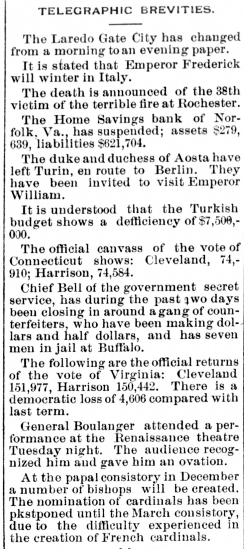 THE SOUTH FIFTY women converts to Mormonism were shipped from Birmingam, Ala., for Salt Lake City under escort of two elders. It was reported that nearly 500 similarly deluded women from East Tennessee and North Georgia will go the same way in a week or two, starting from Chattanooga. THE Kansas City & Southern has issued a notice that it will be opened for business on and after December 1. THE family of William Morgan, a white farmer, were poisoned at Summerfield, Ala., recently, some of them probably fatally. They ate food for dinner prepared by a negro servant, and immediately all fell ill. The negro was arrested. SOME excitement was caused at Canadian, Tex, by the returns from Denver, Col., of a piece of gold quartz found forty miles south of Canadian, the rock turning out to be nearly pure gold. THE house of Jack Gregg, at Leesville, Ky., was burned the other night and all the family, consisting of five persons, perished, except Gregg, who was away from his house on business. JUDGE RUCKER on the 21st sent a letter to Senator Blackburn, of Kentucky, to fight a duel. The quarrel grew out of some statements made by Rucker with reference to the late election, for which Blackburn said he would like to kick him. INTER-STATE military drill closed at Columbus, Ga., on the 21st. Prizes were awarded as follows: Southern cadets, Macon, first prize, $1,000; second prize, Witt rifles, Columbus, Tenn, $500; Columbus guards, Columbus, Ga., third prize, $200. O. F. ADAMS, city treasurer of Macon, Ga., is reported as being about $20,000 short in his accounts. He has been suspended from office. THE Home Savings Bauk, of Norfolk, Va., has suspended. THE fourth annual convention of the National Editorial Association was held in San Antonio, Tex, on the 21st. Delegates were present from almost every State in the Union. President M. B. White, of West Virginia, delivered the address. THE official returns of the vote of Virginia are as follows: Cleveland, 151,977; Harrison, 150,442; Cleveland's majority, 1,535. The vote in 1884 was: Cleveland, 145,597; Blaine, 139,356; total, 284,853; Democratic loss, 4,406. DETECTIVES think that General R. H. Biggar, of Atlanta, Ga., was first murdered in the hotel at Chatianooga, Tenn., by a negro, who then set the building on five. The negro has been arrested with Biggar's money and property in his posssesion.