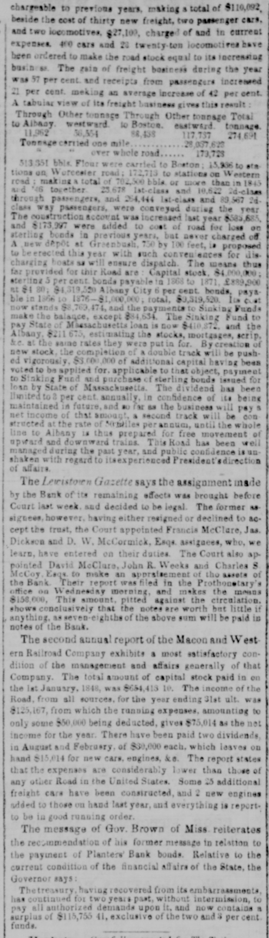 chargeable to previous years, making a total of $110,092, beside the cost of thirty new freight, two passenger cars, and two locomotives, $27,100, charged of and in current expenses. 400 cars and 23 twenty-ton locomotives have been ordered to make the road stock equal to its increasing business. The gain of freight business during the year was 57 per cent. and receipts from passengers increased 21 per cent. making an average increase of 42 per cent. A tabular view of its freight business gives this result: Through Other tonnage Through Other tonnage Total to Albany, westward to Boston. eastward. tonnage. 11,962 58,554 88,438 117,737 274.691 Tonnage carried one mile.... 28,037,623 over whole road. 173,728 513.351 bbls. Flour were carried to Boston; 15,936 to stations on Worcester road; 172,713 to stations on Western road; making a total of 702,500 bbls, or more than in 1845 and '46 together. 25.678 1st-class and 10,622 2d-class through passengers, and 254,444 1st-class and 89,567 2d-class way passengers, were conveyed during the year. The construction account was increased last year $585,685, and $173,997 were added to cost of road for loss on sterling bonds in previous years, but never charged off. A new dépôt at Greenbush, 750 by 100 feet, is proposed to be erected this year with such conveniences for discharging boats as will ensure dispatch. The means thus far provided for thir Road are: Capital stock, $4,000,000; sterling 5 per cent. bonds payable in 1868 to 1871, £889,900 at $4 80, $4,319,520 Albany City 6 per cent. bonds, payable in 1866 to 1876-$1,000,000; total, $3,319,520. Its cost now stands $8,769,474, and the payments to Sinking Funds make the balance, except $84,634. The Sinking Fund to pay State of Massachusetts loan is now $410,872, and the Albany, $211 675, estimating the stocks, mortgages, scrip, &c. at the same rates they were put in for. By creation of new stock, the completion of a double track will be pushed vigorously, $3,000,000 of additional capital having been voted to be applied for, applicable to that object, payment to Sinking Fund and purchase of sterling bonds issued for loan by State of Massachusetts. The dividend has been limited to 8 per cent. annually, in confidence of its being maintained in future, and so far as the business will pay a net income of that amount, a second track will be constructed at the rate of 50 miles per annum, until the whole line to Albany is thus prepared for free movement of upward and downward trains. This Road has been well managed during the past year, and public confidence is unshaken with regard to its experienced President's direction of affairs. The Lewistown Gazette says the assignment made by the Bank of its remaining effects was brought before Court last week, and decided to be legal. The former assignees, however, having either resigned or declined to accept the trust, the Court appointed Francis McClure, Jas. Dickson and D. W. McCormick, Esqs. assignees, who, we learn, have entered on their duties. The Court also appointed David McClure, John R. Weeks and Charles S. McCoy. Eaqs. to make an appraisement of the assets of the Bank. Their report was filed in the Prothonotary's office on Wednesday morning, and makes the means $158,000, This amount, pitted against the circulation, shows conclusively that the notes are worth but little if anything, as seven-eighths of the above sum will be paid in notes of the Bank. The second annual report of the Macon and Western Railroad Company exhibits a most satisfactory condition of the management and affairs generally of that Company. The total amount of capital stock paid in on the 1st January, 1848, was $654,413 10. The income of the Road, from all sources, for the year ending 31st ult. was $125,167, from which the running expenses, amounting to only some $50,000 being deducted, gives $75,014 as the net income for the year. There have been paid two dividends, in August and February, of $30,000 each, which leaves on hand $15,014 for new cars, engines, &c. The report states that the expenses are considerably lower than those of any other Road in the United States. Some 25 additional freight cars have been constructed, and 2 new engines added to those on hand last year, and everything is reported to be in good running order. The message of Gov. Brown of Miss. reiterates the recommendation of his former message in relation to the payment of Planters' Bank bonds. Relative to the current condition of the financial affairs of the State, the Governor says: The treasury, having recovered from its embarrassments, has continued for two years past, without intermission, to pay all authorized demands upon it, and now contains a surplus of $115,755 41, exclusive of the two and 3 per cent. funds.