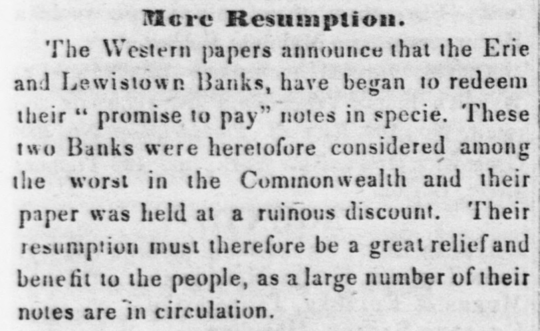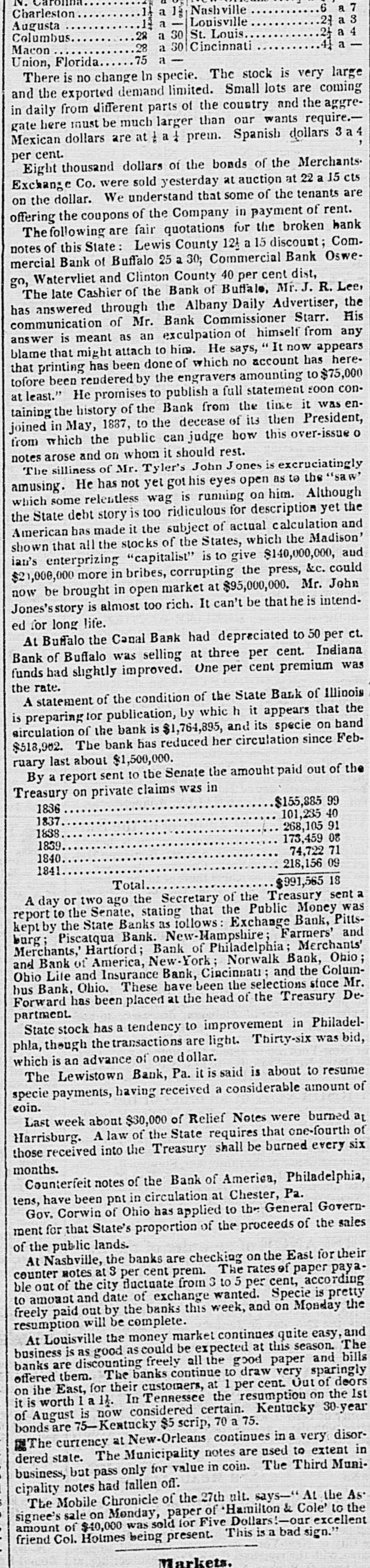 N. 6 Nashville a 1 Charleston 23 3 Louisville a Augusta 2 4 St. Louis 28 a 30 Columbus a 4 Cincinnati 28 a 30 Macon a 75 Union, Florida There is no change In specie. The stock is very large and the exported demand limited. Small lots are coming in daily from different parts of the country and the aggregate here must be much larger than our wants require.Mexican dollars are at a 1 prem. Spanish dollars a per cent. Eight thousand dollars of the bonds of the MerchantsExchange Co. were sold yesterday at auction at 22 a 15 cts on the dollar. We understand that some of the tenants are offering the coupons of the Company in payment of rent. The following are fair quotations for the broken bank notes of this State: Lewis County 12 a 15 discount; Commercial Bank of Buffalo 25 a 30; Commercial Bank Oswego, Watervliet and Clinton County 40 per cent dist, The late Cashier of the Bank of Buffale, Mr. J. R. Lee, has answered through the Albany Daily Advertiser, the communication of Mr. Bank Commissioner Starr. His answer is meant as an exculpation of himself from any blame that might attach to him. He says, It now appears that printing has been done of which no account has here. tofore been rendered by the engravers amounting to $75,000 at least." He promises to publish a full statement soon containing the history of the Bank from the time it was enjoined in May, 1887, to the decease of its then President, from which the public can judge how this over-issue o notes arose and on whom it should rest. The silliness of Mr. Tyler's John Jones is excruciatingly amusing. He has not yet gothis eyes open as to the "saw' which some relentless wag is running on him. Although the State debt story is too ridiculous for description yet the American has made it the subject of actual calculation and shown that all the stocks of the States, which the Madison' ian's enterprizing "capitalist" is to give $140,000,000, aud $21,000,000 more in bribes, corrupting the press, &c. could now be brought in open market at $95,000,000. Mr. John Jones's story is almost too rich. It can't be that he is intended for long life. At Buffalo the Canal Bank had depreciated to 50 per ct. Bank of Buffalo was selling at three per cent. Indiana funds had slightly improved. One per cent premium was the rate. A statement of the condition of the State Bank of Illinois is preparing for publication, by whic h it appears that the circulation of the bank is $1,764,895, and its specie on band $518,902. The bank has reduced her circulation since February last about $1,500,000. By a report sent to the Senate the amouht paid out of the Treasury on private claims was in $155,885 99 1836 101,235 40 1837 268,105 9 91 1838 173,459 08 1839 74,722 71 1840 218,156 09 1841 $991,565 18 Total A day or two ago the Secretary of the Treasury sent a report to the Senate, stating that the Public Money was kept by the State Banks as follows Exchange Bank, Pittsburg; Piscatqua Bank. New-Hampshire; Farmers' and Merchants,' Hartford; Bank of Philadelphia; Merchants' and Bank of America, New-York; Norwalk Bank, Ohio Ohio Life and Insurance Bank, Cincinuati : and the Columbus Bank, Ohio. These have been the selections since Mr. Forward has been placed at the head of the Treasury Department. State stock has a tendency to improvement in Philadelphla, though the transactions are light. Thirty-six was bid, which is an advance of one dollar. The Lewistown Bank, Pa. it is said is about to resume specie payments, having received a considerable amount of coin. Last week about $30,000 of Relief Notes were burned at Harrisburg. A law of the State requires that one-fourth of those received into the Treasury shall be burned every six months. Counterfeit notes of the Bank of America, Philadelphia, tens, have been pnt in circulation at Chester, Pa. Gov. Corwin of Ohio has applied to the General Government for that State's proportion of the proceeds of the sales of the public lands. At Nashville, the banks are checking on the East for their counter notes at S per cent prem. The rates of paper paya ble out of the city fluctuate from 3 to 5 per cent, according to amount and date of exchange wanted. Specie is pretty freely paid out by the banks this week, and on Monday the resumption will be complete. At Louisville the money market continues quite easy, and business is as good as could be expected at this season. The banks are discounting freely all the good paper and bills offered them. The banks continue to draw very sparingly on the East, for their customers, at 1 per cent. Out of deors it is worth 1 a 14. In Tennessee the resumption on the 1st of August is now considered certain. Kentucky 30-year bonds are 75-Kentucky $5 scrip, 70 a 75. The currency at New-Orleans continues in a very disordered state. The Municipality notes are used to extent in business, but pass only for value in coin. The Third Municipality notes had fallen off. The Mobile Chronicle of the 27th ult. says-" At the As signee's sale on Monday, paper of Hamilton & Cole' to the amount of $40,000 was sold for Five Dollars:-ourexcellent friend Col. Holmes being present. This is a bad sign.' Markets.