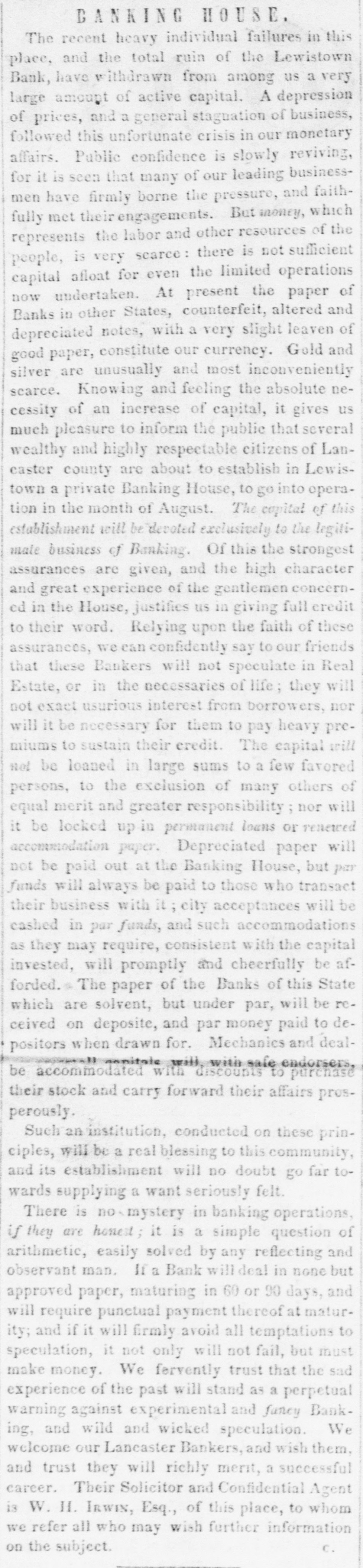 BANKING HOUSE. The recent heavy individual failures in this place, and the total ruin of the Lewistown Bank, have withdrawn from among us a very large amount of active capital. A depression of prices, and a general stagnation of business, followed this unfortunate crisis in our monetary affairs. Public confidence is slowly reviving, is that of our leading businessmen have borne the pressure, for it seen firmly many and which faithfully met their engagements. But money, represents the labor and other resources of the people, is very scarce: there is not sufficient capital afloat for even the limited operations now undertaken. At present the paper of Banks in other States, counterfeit, altered and depreciated notes, with a very slight leaven of good paper, constitute our currency. Gold and silver are unusually and most inconveniently scarce. Knowing and feeling the absolute Decessity of an increase of capital, it gives us much pleasure to inform the public that several wealthy and highly respectable citizens of Laneaster county are about to establish in Lewistown a private Banking House, to go into operation in the month of August. The capital of this establishment will be devoted exclusively to the legilimale business of Banking. Of this the strongest assurances are given, and the high character and great experience of the gentlemen concerned in the House, justifies us in giving full credit to their word. Relying upon the faith of these assurances, we can confidently say to our friends that these Bankers will not speculate in Real Estate, or in the necessaries of life; they will not exact usurious interest from borrowers, nor will it be necessary for them to pay heavy premiums to sustain their credit. The capital will not be loaned in large sums to a few favored persons, to the exclusion of many others of equal merit and greater responsibility; nor will it be locked up in permanent loans or renewed accommodation paper. Depreciated paper will not be paid out at the Banking House, but per funds will always be paid to those who transact their business with it; city acceptances will be cashed in par funds, and such accommodations as they may require, consistent with the capital invested, will promptly and cheerfully be afforded. a The paper of the Banks of this State which are solvent, but under par, will be received on deposite, and par money paid to depositors when drawn for. Mechanics and dealannitate will with safe endorsers, be accommodated with discounts to purchase their stock and carry forward their affairs presperously Such an institution, conducted on these principles, will be a real blessing to this community, and its establishment will no doubt go far towards supplying a want seriously felt. There is no mystery in banking operations, if they are honest; it is a simple question of arithmetic, easily solved by any reflecting and observant man. If a Bank will deal in none but approved paper, maturing in 60 or 90 days, and will require punctual payment thereof at maturity; and if it will firmly avoid all temptations to speculation, it not only will not fail, but must make money. We fervently trust that the sad experience of the past will stand as a perpetual warning against experimental and fancy Banking, and wild and wicked speculation. We welcome our Lancaster Bankers, and wish them, and trust they will richly merit, a successful career. Their Solicitor and Confidential Agent is W. H. IRWIN, Esq., of this place, to whom we refer all who may wish further information C. on the subject.