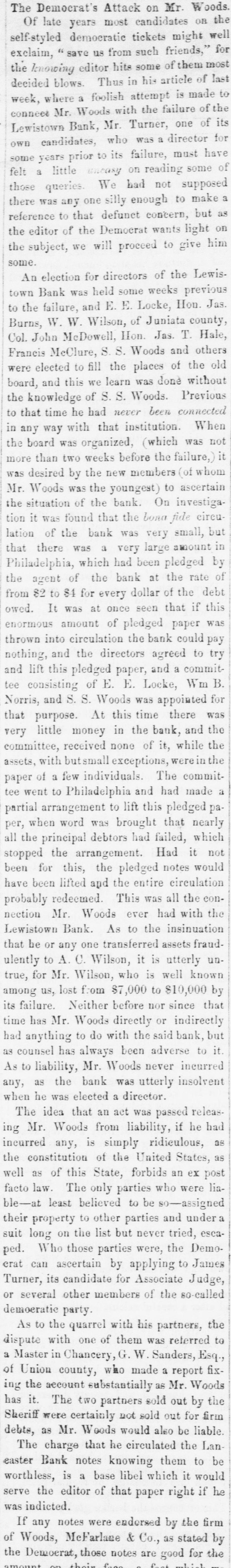 The Democrat's Attack on Mr. Woods. the Of late years most candidates OR well self-styled democratic tickets might for exclaim, save us from such friends," most the knowing editor hits some of them of last decided blows. Thus in his article where a foolish attempt is made of the to week, Mr. Woods with the failure of its Lewistown conneet Bank, Mr. Turner, one for candidates, who was a director have OWD prior to its failure, must of little uneasy on some We had not a was any one silly enough to as there those some felt a years queries. reading supposed make but reference to that defunct concern, on the editor of the Democrat wants light him the subject, we will proceed to give some. An election for directors of the LewisBank was held some weeks previous Jas to town the failure, and E. E. Locke, Hou. Burns, W. W. Wilson, of Juniata county, Hale, Col. John McDowell, Hon. Jas. T. others Francis McClure, S.S. Woods and old were elected to fill the places of the board, and this we learn was done without the knowledge of S.S. Woods. Previous time he had never been connected with that institution. was organized, was the in to that any board way (which When not it more than two weeks before the failure,) desired by the new members (of whom was the youngest) to of the bank. On the was Mr. situation Woods investiga- ascertain circution it was found that the bona fide but lation of the bank was very small, in that there was a very large amount Philadelphia, which had been pledged by the agent of the bank at the rate of from $2 to $4 for every dollar of the debt owed. It was at once seen that if this enormous amount of pledged paper was thrown into circulation the bank could pay nothing, and the directors agreed to try lift this pledged paper, and a commitof E. E. and tee consisting Locke, appointed Wm for B. Norris, and S. S. Woods was that purpose. At this time there was very little money in the bank, and the the committee, received none of it, while assets, with butsmall exceptions, werein the paper of a few individuals. The committee went to Philadelphia and had made a partial arrangement to lift this pledged pawhen word was brought that nearly all per, the principal debtors had failed, which stopped the arrangement. Had it not been for this, the pledged notes would have been lifted and the entire circulation probably redeemed. This was all the connection Mr. Woods ever had with the Lewistown Bank. As to the insinuation that be or any one transferred assets fraudulently to A. C. Wilson, it is utterly untrue, for Mr. Wilson, who is well known among us, lost from $7,000 to $10,000 that by its failure. Neither before nor since time has Mr. Woods directly or indirectly had anything to do with the said bank, but it. as counsel has always been adverse to to Mr. Woods never as the bank was utterly any, As liability, insolvent incurred when he was elected a director. The idea that an act was passed releasing Mr. Woods from liability, if he had incurred any, is simply ridiculous, as constitution of the United States, as as of this State, an ex law. The only parties were the well facto forbids who post liable-at least believed to be so-assigned their property to other parties and undera suit long on the list but never tried, escaped. Who those parties were, the Demoerat can ascertain by applying to James Turner, its candidate for Associate Judge, or several other members of the 80-called demoeratic party. As to the quarrel with his partners, the dispute with one of them was referred to a Master in Chancery, G. W. Sanders, Esq., of Union county, who made a report fixing the account substantially as Mr. Woods has it. The two partners sold out by the Sheriff were certainly not sold out for firm debts, as Mr. Woods would also be liable. The charge that he circulated the Laneaster Bank notes knowing them to be worthless, is a base libel which it would serve the editor of that paper right if he was indicted. If any notes were endersed by the firm of Woods, McFarlane & Co., as stated by their the Demoerat, those notes are good for the amount