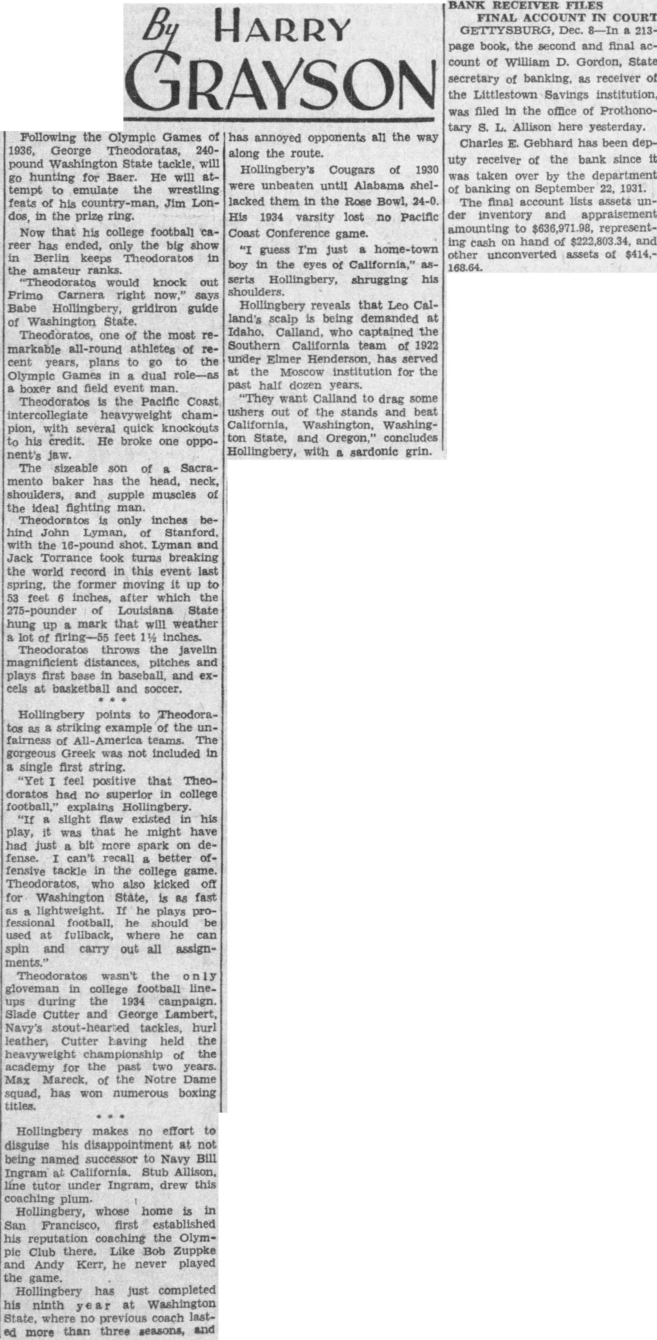 Following the Olympic Games George 240pound Washington State tackle, will hunting for Baer. tempt to emulate wrestling feats his country-man, Jim dos, in the prize ring. Now that his college football has ended, only the big show Berlin keeps Theodoratos in amateur ranks. would knock out Primo Carnera right Babe Hollingbery, gridiron guide Washington State. Theodoratos, one of the most markable athletes of cent plans to the Olympic Games dual boxer and field event man. Theodoratos the Pacific Coast intercollegiate heavyweight chamwith several quick credit. He broke one opponent's jaw. The sizeable son Sacramento baker has the head, neck, shoulders, and supple muscles the ideal fighting man. Theodoratos only inches behind John Lyman, the 16-pound shot. Lyman Jack Torrance took turns breaking the world record in this last spring, the former moving up inches, after which the Louisiana State hung mark that will weather inches. Theodoratos throws the javelin magnificient distances, pitches and plays first base in baseball, and at basketball and Hollingbery points to Theodorastriking example the fairness teams. The gorgeous Greek was not included single first string. feel positive that Theodoratos had superior college football," explains Hollingbery. slight flaw existed play, was that he might have had more spark fense. can't recall better fensive tackle the college Theodoratos, who also kicked off Washington State, fast lightweight. he plays football, should used fullback, where he can spin and carry out all assignTheodoratos wasn't the gloveman in college football during the 1934 campaign. Slade Cutter and George Lambert, Navy's tackles, hurl leather, Cutter having held the heavyweight of the academy for past Max of the Notre Dame squad, has won numerous boxing titles. Hollingbery makes no effort disguise his disappointment at being named successor to Navy Bill Ingram California. Stub Allison, tutor under Ingram, drew this coaching plum. Hollingbery, whose home Francisco, first established the OlymClub there. Like Bob Zuppke Andy Kerr, he never played the game. Hollingbery has just completed ninth Washington where no coach than three annoyed opponents all the along the route. Hollingbery's Cougars of 1930 were unbeaten until Alabama shellacked them in the Rose Bowl, His 1934 varsity lost no Pacific Coast Conference game. guess I'm home-town boy in the eyes of California," Hollingbery, shrugging shoulders. Hollingbery reveals that Calland's scalp being demanded Idaho. Calland, who captained the Southern California team under Elmer Henderson, has served Moscow institution for the half dozen years. want Calland to drag some ushers out the stands and beat California, Washington, WashingState, and Oregon," concludes Hollingbery, with sardonic BANK RECEIVER FINAL ACCOUNT IN COURT Dec. page book, the second and final count of William D. Gordon, State secretary of receiver of the Littlestown Savings institution, was filed in the office of ProthonoAllison here yesterday. Charles Gebhard has been deputy receiver of the bank since taken over by the department banking September 1931. The final account lists assets der inventory and appraisement amounting to representhand and cash other unconverted assets $414,168.64.