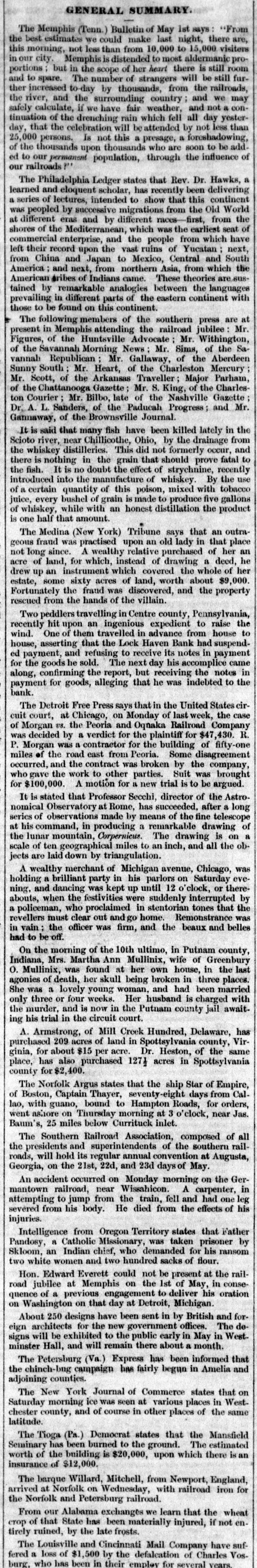 GENERAL SUMMARY. Memphis (Tenn.) Bulletin make of last May night, 1st says there visitors the The best estimates not we less could than from 10,000 to most to aldermanic 15,000 room proportions number this in our morning, city but Memphis in the scope is distended of of her strangers heart there will the is be still railroads, still further increased to day surrounding country and not a conthe river, and the have fair weather, all day of the drenching be attended by not and safely tinuation to calculate, spare. celebration The if we by will thousands, rain which fell from a forcshadowing, and less we yester- than add may day, that the Is not this a presage, who are soon to be ed to our permanent our railroads of 25,000 the thousands persons. upon population, thousands through the influence of a Dr. that Rev. Hawks, The Philadelphia Ledger scholar, states has recently been this delivering continent learned and of lectures, eloquent intended migrations to show from that the Old from World the a was series peopled by successive and by different races the first, earliest seat of at shores different of the enterprise, eras Mediterranean and the which people was of from Yucatan which South next, have commercial record upon the vast Mexico, ruins Central and the from left their China and Japan from to northern Asia, theories from which are.susand next, came. These languages with American by remarkable of the eastern tained America prevailing dribes in different of Indians this parts analogies continent between continent the press are at those to be found members on of the southern railroad jubilee Mr. a present The following in Memphis the Huntsville attending Advocate the Mr. Sims, Mr. Withington of the SaFigures, of Morning News of the of the Mr the Charleston vannah South Mr Heart, Traveller Major the Savannah Republican of Gallaway, Mercury Aberdeen Parham, Charles Sunny Mr. Scott, of the Gazette ; Arkansas Mr. S. King Nashville of Gazette Mr. of the Courier Chattanooga Mr. Bilbo, late Paducah of the Progress; and Gannaway, Dr, A. L. of the many Brownsville fish have been by killed the drainage lately in It is said that Chillicothe, Ohio, not formerly occur, fatal to ton river, Sanders, near of the did Journal from and the Scioto the whiskey is nothing distilleries. in the the This grain effect that of should strychnine, prove By recently the use there fish. It is no doubt manufacture of whiskey mixed with the into the of this poison, five of a certain every bushel of grain an honest is distillation the of half that amount juice, introduced whiskey, while quantity with made to produce that an product tobacco gallons outra is one Medina (New York) upon Tribune an old says lady in of that her place an geous The fraud since. was practised A wealthy instead relative of purchased drawing the whole a deed, of her he acre not long of land, for which, which covered worth about $9,000. drew up some an instrument sixty acres was of discovered, land, and the property estate, Fortunately the the fraud hands of the villain. Pennsylvania, rescued peddlers from travelling ingenious in Centre expedient county, to raise house the to recently Two hit upon of them an travelled in Haven advance Bank from had suspend- payment wind. house, asserting One that refusing the Lock to receive its his notes accomplice in came in ed along, for payment payment, the confirming goods for and goods, he sold. the alleging report, The next that but day in he receiving the was United indebted the States notes to case cir the bank. The Detroit at Free Chicago, Press on says and Monday Oqnaka that of Railroad last week, $47,430. Company the R of cuit Morgan vs. the a Peoria verdict for the plaintiff building for of fifty was decided by contractor for the Some of the road the contract was broken Suit was miles P. Morgan court, was a east from Peoria. by the disagreement company, brought occurred, and work to other new trial is to be who for gave the A motion for parties. director of the argued. Astro- long $100,000. that Professor Secchi, succeeded, after a It is stated at Rome, means of the fine drawing nomical observations a is on series of command, Observatory in producing made by has remarkable The drawing all telescope the ob of a the at his lunar mountain, Corpernicus miles to an inch, and scale of ten laid geographics langulation. down by was Chicago, A wealthy merchant party in his parlors 12 on clock, or a brilliant was kept up until interrupted holding jects are dancing of Michigan were suddenly avenue, tones Saturday that there- eve was the by ning. abouts, and when the festivities proclaimed in stentorian Remonstrance a policeman, who clear out and and the beaux and had in revellers vain ; must the off. officer was firm, ultimo, home. in Putnam Greenbury county, belles to be morning of the 10th Mullinix, wife of the last Indiana, On the Mrs. was Martha found Ann at being her own broken house, in three in married places. O. Mullinix, her skull woman, and had been agonies was a lovely weeks. young Her husband county jail only She the murder, three of death, or in and four the is circuit now in court the Putnam Hundred, is Delaware, charged await- with Vir- has his trial of Mill Creek in Spottsylvania of county, the for purchas A. based for about 209 acres $15 of per acre. 127} Dr. acres Heston, in Spottsy ing place, ginia, Armstrong, has $2,400. also purchased land ship Star of Empire, Ivania same Calcounty Norfolk Argus states that seventy-eight the days for from orders, The Boston, Captain bound Thayer, to Hampton at 3 Roads, o'clock, near Jas. ashore on Thursday Currituck inlet. 8, 25 miles Association, Southern convention of the at Augusta, lao, Baum of went The with guano, and Railroad below morning annual composed southern of rail- all the presidents will hold its regular 22d, and 23d days May on occurred Wissahicon roads, Georgia, on the 21st, on Monday morning A carpenter, the Ger- in had one leg severed attempt