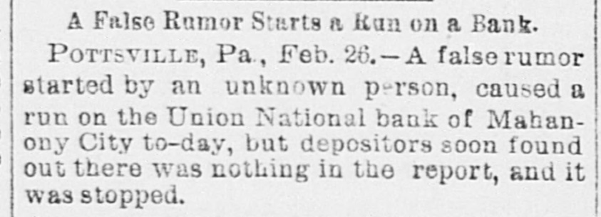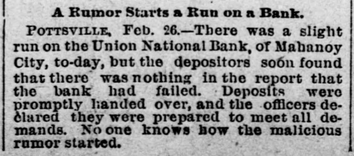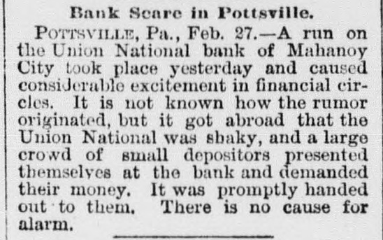 Business Embarrassments. POTTSVILLE. Pa., Feb. 26.-There was a run on the Union National Bank, of Mahonev City, to-day, but the depositors found, after a comparatively small sum had been paid ont, that there was nothing in the report which bad been circulated to the effect that the bank had failed. Deposits were promptly handed over when demanded, and the officers of the bank declared they were prepared to meet all demands. No one knows how the rumor started. The Union National Bank has a paid-up capital of $100,000, with deposits amounting to more than double that figure. PITTSBURG. Feb. 26.-W. A. Lore, a citizen of Missouri, has filed a bill in equity in the United States Court asking for the appointment of a receiver of the Saltsburg Coal Company. The plaintiff is a stockholder and claims that the capital stock is $500,000. and that no dividends have been paid since 1887. He alleges fraud. CINCINNATI, Feb. 26.-A. Spiegler & Co., tanners, in the northwestern part of the city, assigned to-day to Otto Pfleger and Jacob Hurlscher. Assets and liabilities are about equal. and are estimated at $75,000. NEW YORK, Feb. 26.-Schedules in the assignment of Joseph W. Carroll, manufactnrer of advertising novelties, to Arthur Smith. state liabilities, $119,174; nominal assets, $32,848 and actual assets, $20,259. NASHVILLE, Tenn., Feb. 26.-The Sheffield (Ala.) Savings and Trust Company has assigned. The deposits are $20,000 and the assets are said to be above liabilities.
