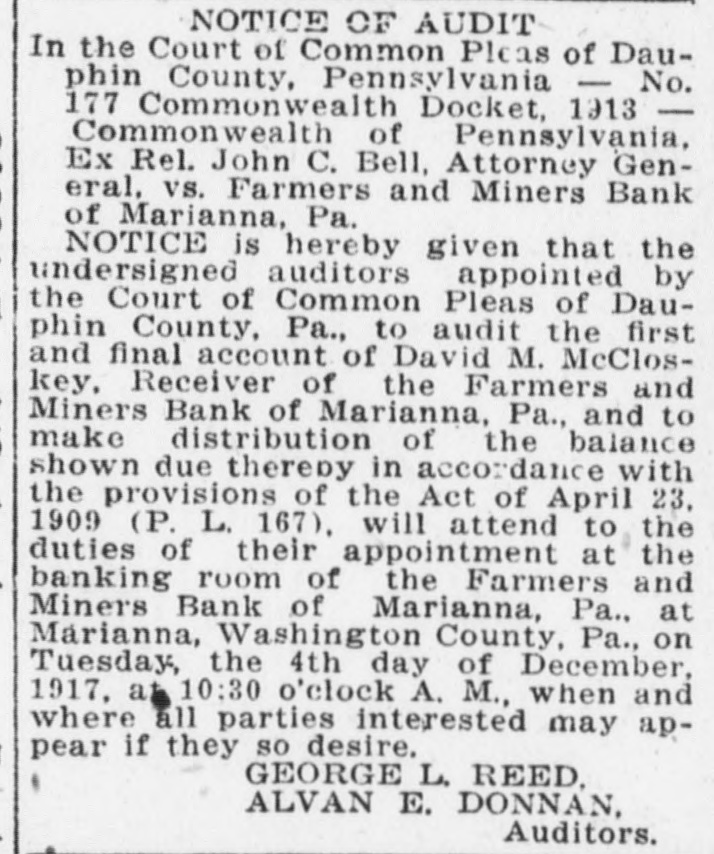 NOTICE is hereby given that the undersigned auditors appointed by the Court of Common Pleas of Dauphin County, Pa., to audit the first and final account of David M. McCloskey, Receiver of the Farmers and Miners Bank of Marianna, Pa., and to make distribution of the balance shown due thereby in accordance with the provisions of the Act of April 23, 1909 (P. L. 167), will attend to the duties of their appointment at the banking room of the Farmers and Miners Bank of Marianna, Pa., at Marianna, Washington County, Pa., on Tuesday, the 4th day of December, 1917, at 10:30 o'clock A. M., when and where all parties interested may appear if they so desire.