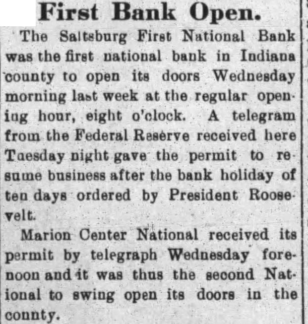 First Bank Open. The Saltsburg First National Bank was the first national bank in Indiana county to open its doors Wednesday morning last week at the regular opening hour, eight o'clock. A telegram from the Federal Reserve received here Tuesday night gave the permit to re sume business after the bank holiday of ten days ordered by President Roose velt. Marion Center National received its permit by telegraph Wednesday forenoon and was thus the second National to swing open its doors in the