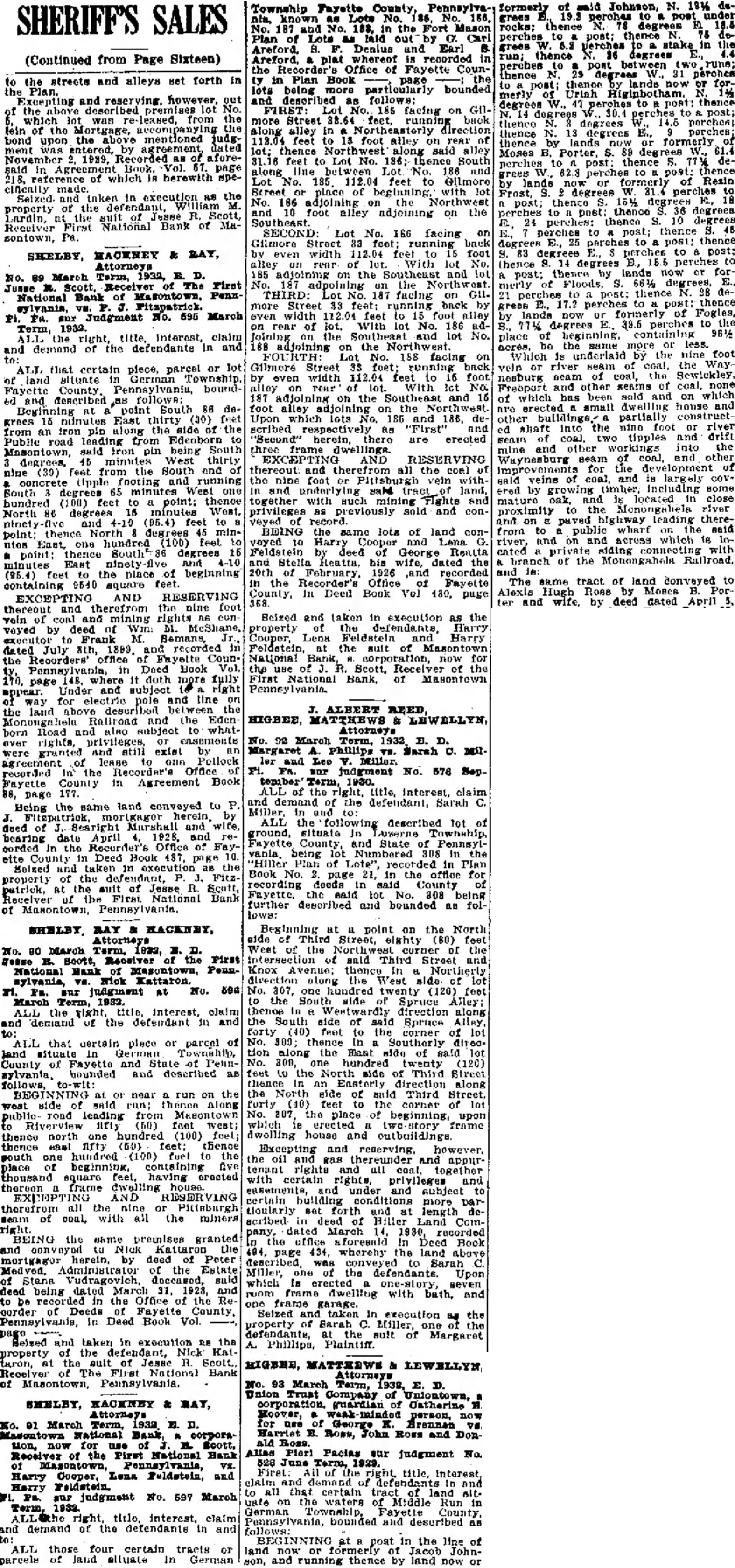 SALES (Continued from Page Sixteen) the streets and alleys set forth in Plan. and however, the lot the which from the bond upon the mentioned dated November Recorded aforereference of herewith taken execution the and property of the R. Scott, Receiver Lardin, First National Bank of sontown, SHELBY, MACENEY & RAY, Attorneys 89 March Term, 1932, First National Bank of PennMarch 1932. Term, title, Interest, claim and demand of the defendants in and parcel or lot ALL that certain piece, land German Fayette boundand described follows: Beginning at point South 86 degrees East (30) from an along of the Public leading from South said pin being 45 minutes thirty from the South and nine (39) footing running South 65 minutes North degrees minutes 4-10 (95.4) to point; thence North degrees feet minone hundred (100) minutes East ninety (95.4) the place beginning containing 9540 square feet. EXCEPTING AND RESERVING therefrom by of recorded in dated the Fayette in Deed Book doth fully page subject right appear. and line the land the and the Eden born Road and subject whatrights, or easements were granted and still exist Pollock agreement recorded Office Fayette County in Agreement Book 88, Heing the same land conveyed to P. herein, deed Searight Marshall and bearing date April and Recurder's Office eite County Deed Book 187, 10. and taken in execution the property of the Fitzpatrick, at the suit of Jesse Scott, Receiver First National Bank of Masontown, Pennsy Attorneys No. March First National Mank Pennsur judgment at No. March ALL vight, interest, claim and demand OF the defendant in and to: that certain place or parcel of Township, County of Fayette and State Pennbounded and described follows, BEGINNING at near run on the west side leading Masontown Riverview (50) feet west; thence north one hundred (100) feel; thence feet; thence south one hundred (100) the place thousand square thereon frame dwalling AND RESERVING therefrom all the Pittsburgh seam of coal, with all the minors BEING the shme premises granted mortgagor herein, deed of Poter Administrator the Estate being dated 31, the Office the oorder of County, In Deed Book Vol. page and taken in execution property of the taron, the Bank of Masontown, Attorneys March Term, National Mon, for Boott. Receiver of the Pirst National Bank Harry No. 597 March and demand of the defendants in ALL those four certain tracts or parcels Jand elluate In German said Johnson, N. 18% Township County, formerly known Lots grees the Carl perches post; Plan perches stake in the and Earl grees run; thence Areford, plat whereof recorded perches post the Office Fayette Counthence 31 in Plan Book lands lots being more bounded merly Urinh described follows: degrees 185 facing on post; more Street feet, running thence degrees along in direction thence degrees perches; 18 foot alley on rear lands formerly thence said alley Moses feet Lot No. 186; South thence perches along line between Lot No. 186 post: thence feet to lands or of Resin Street place with lot Frost, degrees 31.4 perches No. 186 adjoining post; the thence 36 degrees alley adjoining on degrees SECOND: Lot No. 166 facing on perches to thence Gilmore post; thence Street running 112.04 foot to post: even width thence 185 the and lands THIRD: 187 facing perches post: thence more Street feet: running back lands formerly of Fogles, width feet rear of With No. 186 degrees 39.6 perches on Joining Southeast place 188 the the facing underlaid nine foot Gilmore Street coal, by even width 112.04 feet to which and 187 adjoining on the and of has foot are small Upon partially construct scribed "First" shaft the foot respectively there erected tipples workings the seam and RESERVING Waynesburg and all the the nine vein veins and largely land, by together with such mining rights mature and located the river privileges previously sold and proximity and highway leading thererecord BEING the same lots land con- from public which Feldstein George Rentta ented siding and Stella wife, branch of the 20th February 1926 recorded and the Recorder's Office Fayette The same tract of land to County, Deed Book 130, page Hugh dated April Heized and taken in execution as the property Harry Cooper, Harry the suit of National for of the National Bank, Masontown ALBERT REED MATTHEWS Attorneys No. 92 March Term, B. D. Phillips and tember Term, 1930. the right, title, interest, claim of the defendant, Sarah and ALL described tot ground, situate Fayette County, and State of Pennsylvania. being lot Numbered "Hiller in Book page 21, the office recording deeds lot being further and as Beginning point on the North Street, eighty (80) West the said Third Street Knox Northerly No. 307, one twenty (120) the thenos Westwardly direction along South side Spruce forty (40) tion along Mast No. 300, hundred twenty feet to the side Third Street thence In direction along the side Third corner No. 207 beginning dwolling house outbuildings Excepting and reserving the oil thereunder and tenant rights together certain rights privileges under certain conditions more length of Hiller pany, March recorded Deed Book page wherehy land was Miller, the defendants Upon which erected seven runm dwelling bath, and one frame Selzed and taken execution the property Miller, one defendants, sult of Margaret A. Phillips, No. 93 March Term, Union Company Moover, person, now Harriet B. Ross, John ROSS and DonAllas Pierl Pacias sur judgment No. June First title, all that and certain tract on waters Middle Run in German Township, County, bounded and BEGINNING at post in the line of Johnson, and running thence by land now