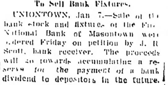 To Sell Bank Fixtures. ... National Bank Masontown of bank receiver. The proceeds accumulating payment bank dividend to depositors In the future.