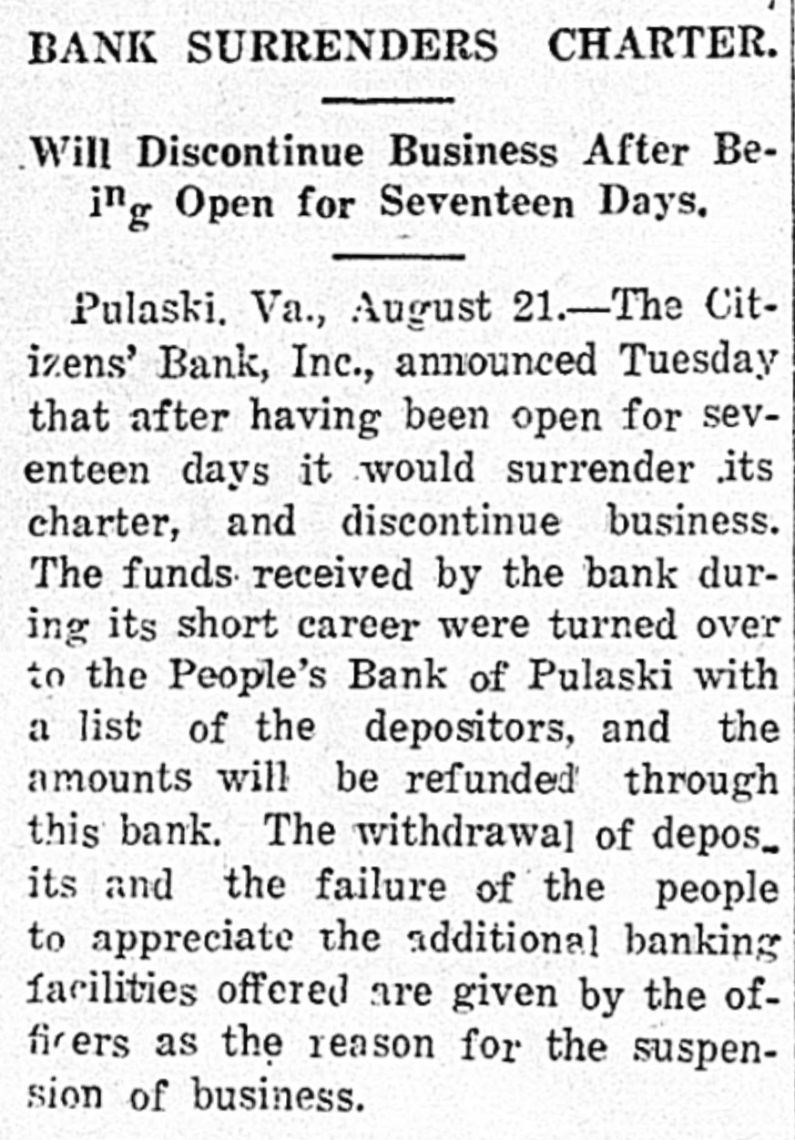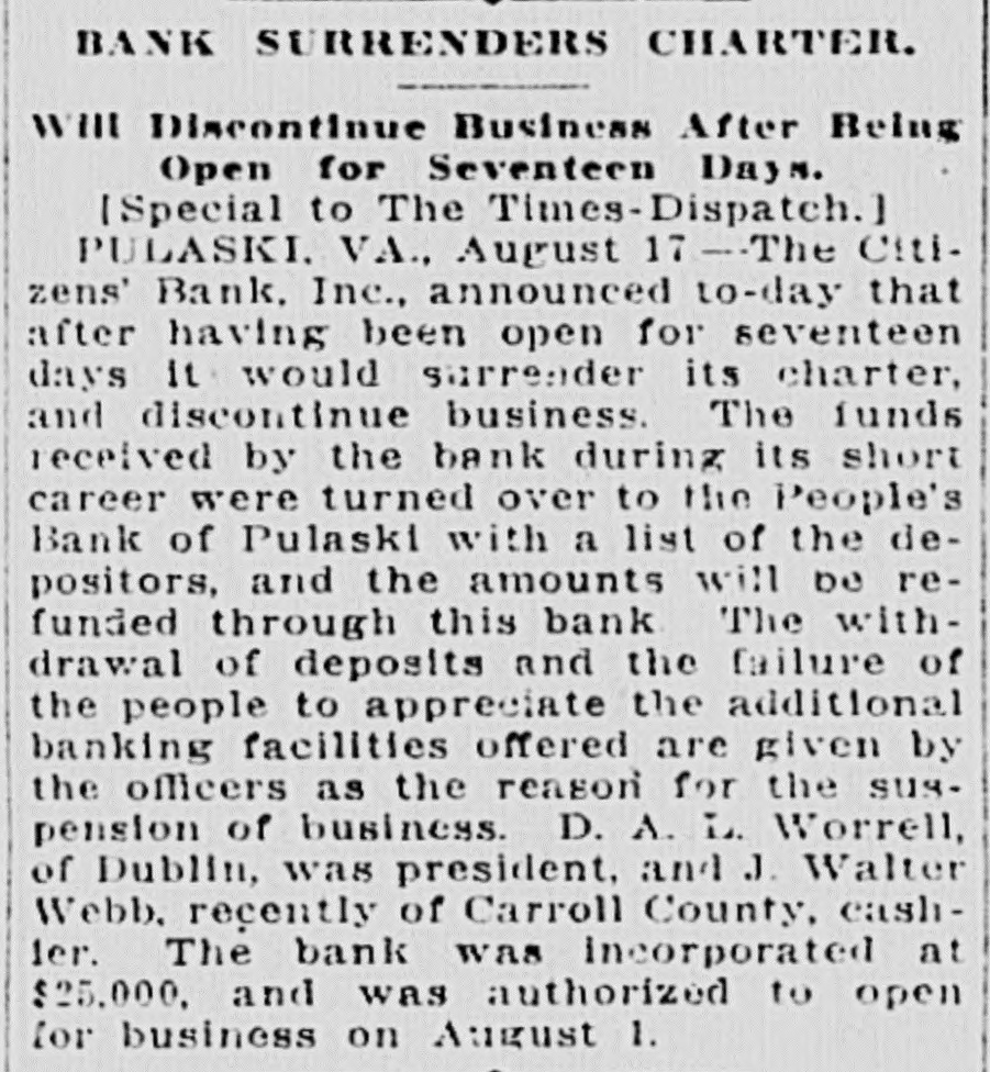 BANK SURRENDERS CHARTER. Will Discontinue Business After Being Open for Seventeen Days. [Special to The Times-Dispatch.] PULASKI. VA., August 17 - The Citizens' Bank. Inc., announced to-day that after having been open for seventeen days it would surrender its charter, and discontinue business. The funds received by the bank during its short career were turned over to the People's Bank of Pulaski with a list of the depositors, and the amounts will be refunded through this bank The withdrawal of deposits and the failure of the people to appreciate the additional banking facilities offered are given by the officers as the reason for the suspension of business. D. A. L. Worrell, of Dublin, was president, and J. Walter Webb. recently of Carroll County, cash1er. The bank was Incorporated at $25,000, and was authorized to open for business on August 1.