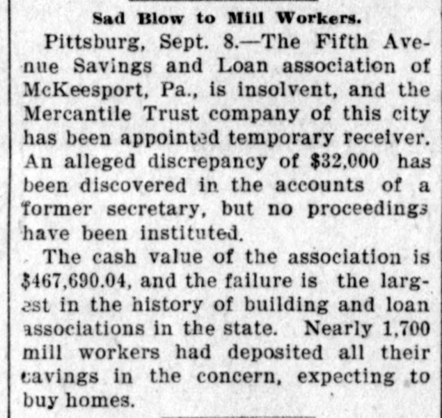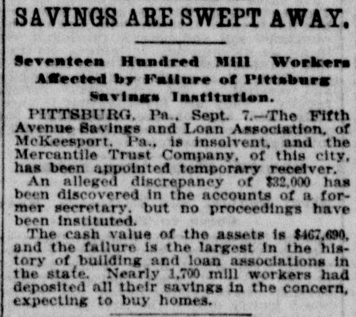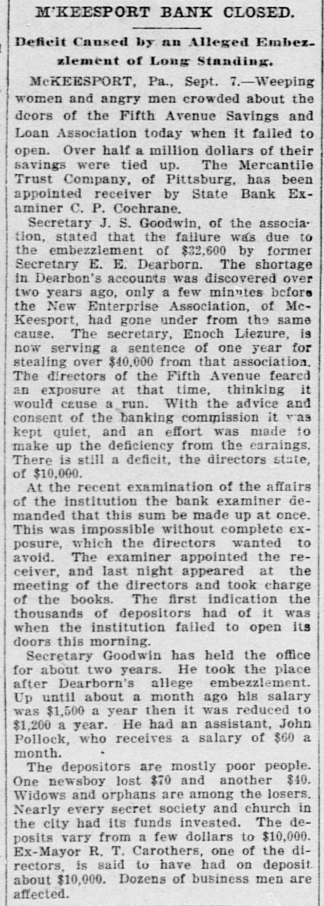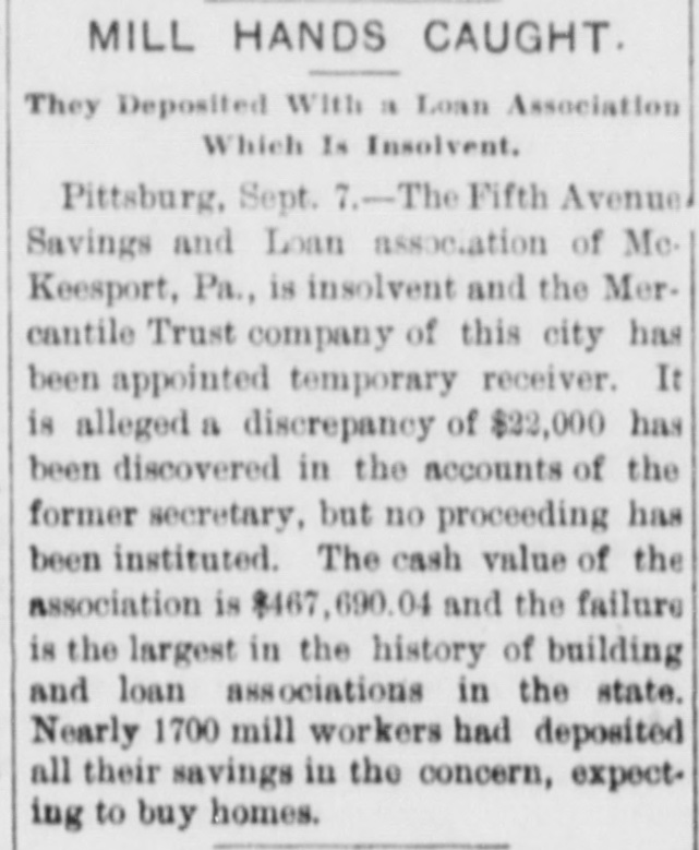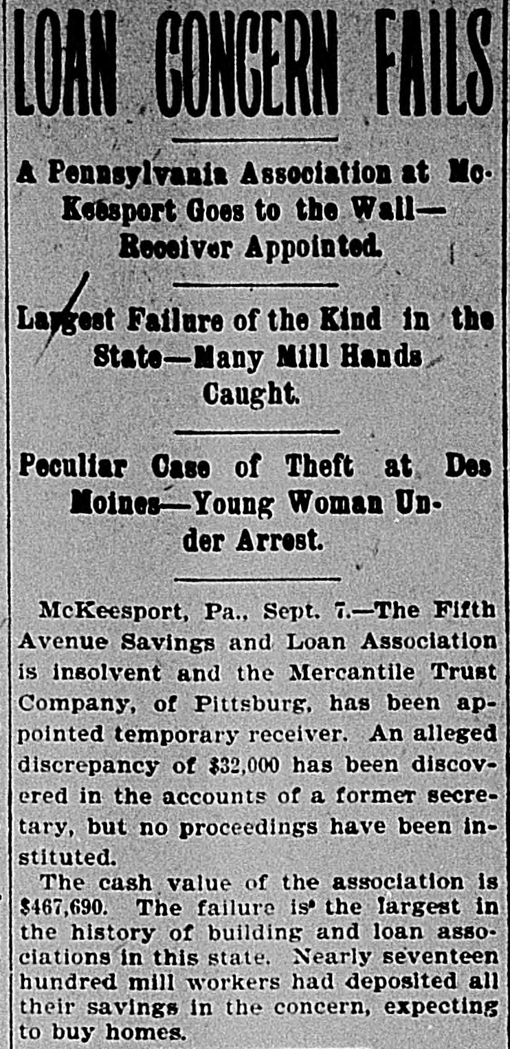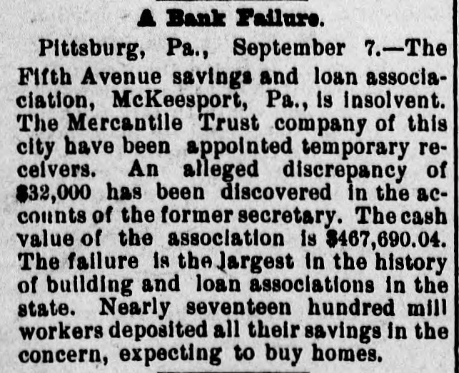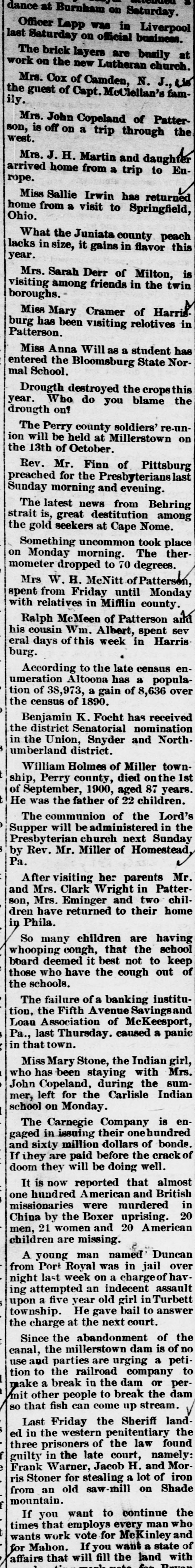 dance at Burnham on Saturday. Officer Lapp was in Liverpool last Saturday on official business. The brick layers are busily at work on the new Lutheran church. Mrs. Cox of Camden, N. J., is the ily. guest of Capt. McClellan's famMrs. John Copeland of Patterson, west. is off on a trip through the Mrs. J. H. Martin and daughter arrived home from a trip to Europe. Miss Sallie Irwin has returned home Ohio. from a visit to Springfield, What the Juniata county peach lacks in size, it gains in flavor this year. Mrs. Sarah Derr of Milton, is visiting among friends in the twin boroughs. Miss Mary Cramer of Harris burg Patterson. has been visiting relotives in Miss Anna Will as a student has entered the Bloomsburg State Normal School. Drougth destroyed the cropsthis year. Who do you blame the drougth on? The Perry county soldiers' re-union will be held at Millerstown on the 13th of October. Rev. Mr. Finn of Pittsburg preached for the Presbyterianslast Sunday morning and evening. The latest news from Behring strait is, great destitution among the gold seekers at Cape Nome. Something uncommon took place on Monday morning. The thermometer dropped to 70 degrees. Mrs W. H. McNitt of Patterson, spent from Friday until Monday with relatives in Mifflin county. Ralph McMeen of Patterson and his cousin Wm. Albert, spent sev eral days of this week in Harris burg. According to the late census enumeration Altoona has a population of 38,973, a gain of 8,636 over the census of 1890. Benjamin K. Focht has received the district Senatorial nomination in the Union, Snyder and Northumberland district. William Holmes of Miller township, Perry county, died the 1st of September, 1900, aged 87 years. He was the father of 22 children. The communion of the Lord's Supper will be administered in the Presbyterian church next Sunday by Rev. Mr. Miller of Homestead Pa. After visiting her parents Mr. and Mrs. Clark Wright in Patterson, Mrs. Eminger and two children have returned to their home in Phila. So many children are having whooping cough, that the school board deemed it best not to keep those who have the cough out of the schools. The failure of a banking institution, the Fifth Avenue Savingsand Loan Association of McKeesport, Pa., last Thursday. caused a panic in that town. Miss Mary Stone, the Indian girl, who has been staying with Mrs. John Copeland, during the summer, left for the Carlisle Indian school on Monday. The Carnegie Company is engaged in issuing their onehundred and sixty million dollars of bonds. If they are paid before the crack of doom they will be doing well. It is now reported that almost one hundred American and British missionaries were murdered in China by the Boxer uprising. 20 men, 21 women and 20 American children are missing. A young man named Duncan from Port Royal was in jail over night last week on a chargeof hav ing attempted an indecent assault upon a five year old girl in Turbett township. He gave bail to answer the charge at the next court. Since the abandonment of the canal, the millerstown dam is of no use and parties are urging a petition to the railroad company to make a break in the dam or permit other people to break the dam SO that fish can come up stream. Last Friday the Sheriff land ed in the western penitentiary the three prisoners of the law found guilty in the late court, namely: