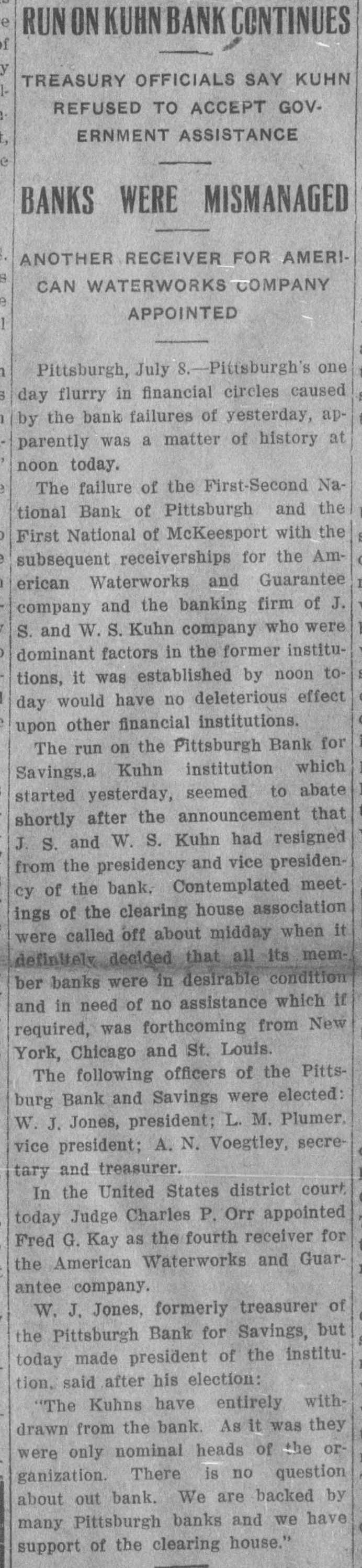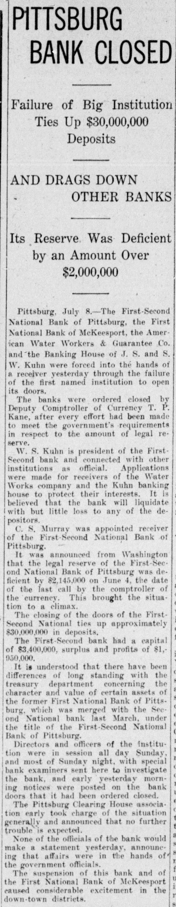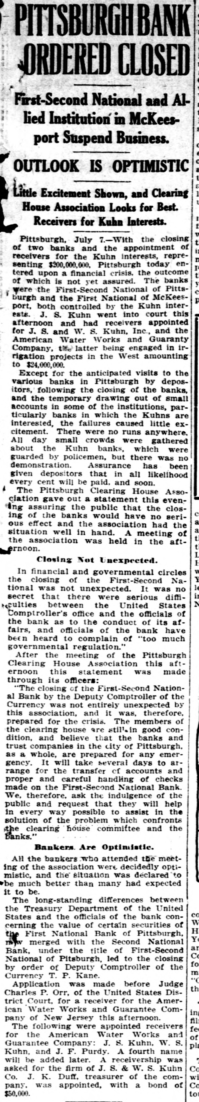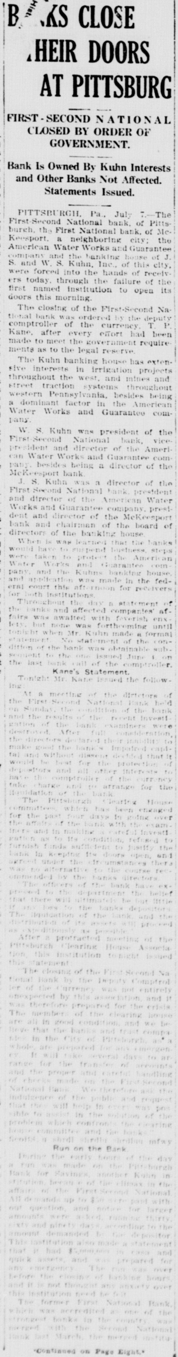 First-Second National of Pittsburgh Forced to Close Doors. SOON FOLLOWED BY TWO OTHERS First National of McKeesport and Bank of J. S. & W. S. Kuhn, Inc., Are Caught-Receiver Appointed for American Water Works and Guarantee Company. Pittsburgh, July 7.-The First-Second National Bank of Pittaburgh, the First National Bank of McKeesport, a neighboring city: the American Water Works and Guarantee Company and the banking-house of J. S. & W. S. Kuhn, Incorporated, of this city, were forced into the hands of receivers to-day through the failure of the first named institution to open its doors this morning. The closing of the First-Second National Bank was ordered by the deputy comptroller of currency, T. P. Kane, after every effort had been made to meet the government requirements as to the legal reserve. The Kuhn banking-house has extensive interests in Irrigation projects throughout the West and in mines and street traction systems throughout Western Pennsylvania, besides being a dominant figure In the American Water Works and Guarantee Company. W. S. Kuhn is president of the FirstSecond National Bank, vice-president and director in the banking-house and vice-president and director of the American Water Works and Guarantee Company, besides a director of the McKeesport bank. J. S. Kuhn is a director of the FirstSecond National Bank, president and director of the American Water Works and Guarantee Company, president and director of the McKeesport bank and chairman of the board of directors of the banking-house. Receivers Asked For. When it was learned that the banks would have to suspend business, steps were taken to protect the American Water Works and Guarantee Company and the Kuhn's banking-house, and application was made in the Federal court this afternoon for receivers for both Institutions. Throughout the day a statement of the banks and affected companies' affairs was awaited with feverish anxiety, but none was forthcoming until tonight. when Mr. Kuhn made a formal statement. No statement of the condition of the bank was obtainable subsequent to the one issued June 4 on the last bank call of the comptroller. The June 4 statement was as follows: Resources: Loans and discounts. $15,704,901.16. Overdrafts, secured and unsecured. $2,571.76. United States bonds to secure circulation, $1,900,000. United States bonds to secure United States deposits, $171,000. United States bonds on hand, $16,000. Premium of united bonds, $10,121.26. Bonds, securities, etc., $8,549,236.95. Banking furniture and lixtures, $176,755.04. Other real estate owned. $4,541,977.65. Due from national banks (not reserve agents). $1,178,987.06 Due from State banks and bankers, $1,316,820.23. Due from approved reserve agents, $4,216,447.75 Checks and other cash items. $160.076.23. Exchanges for clearing house, $693,230.42. Notes of other national banks, $360,000. Fractional paper currency, nickels and cents, $13,237.88. Lawful money reserve in bank, via.: Specie and legal tender notes, $1,S.1.023. Redemption fund with United States Treasury (5 per cent of circulation), 95 per cent. Due from United States treasurer other than 5 per cent redemption fund, $87,500. Total, $38,103,856.39. Other Side of Ledger. Liabilities: Capital stock paid in, $3,400,000. Surplus fund, $1,700,000. Undivided profits, less expenses and taxes paid, $250,068.45. National bank notes outstanding, (Continued on Second Page.)