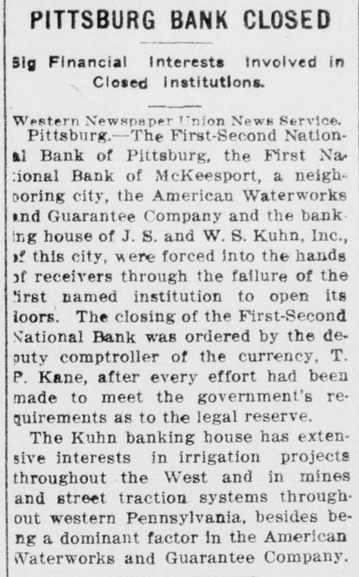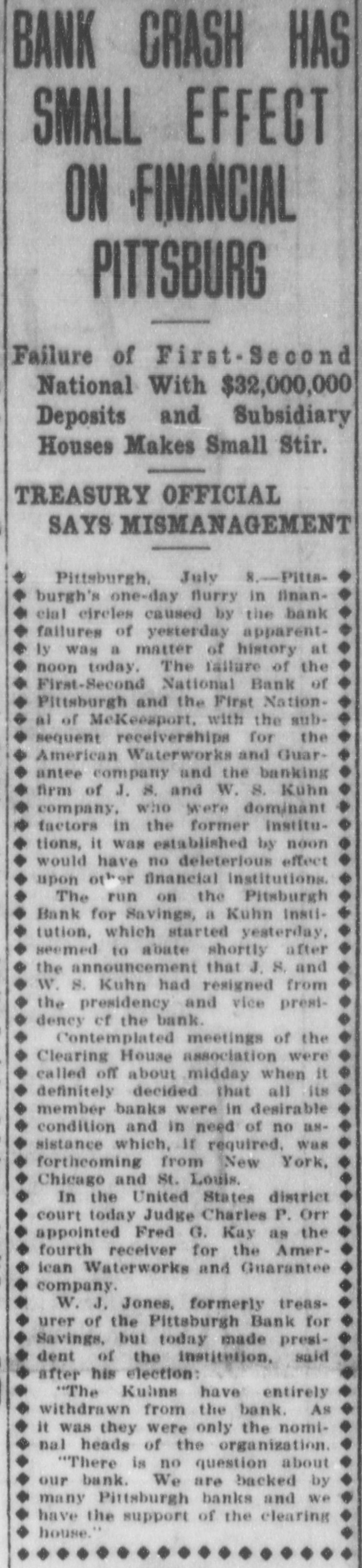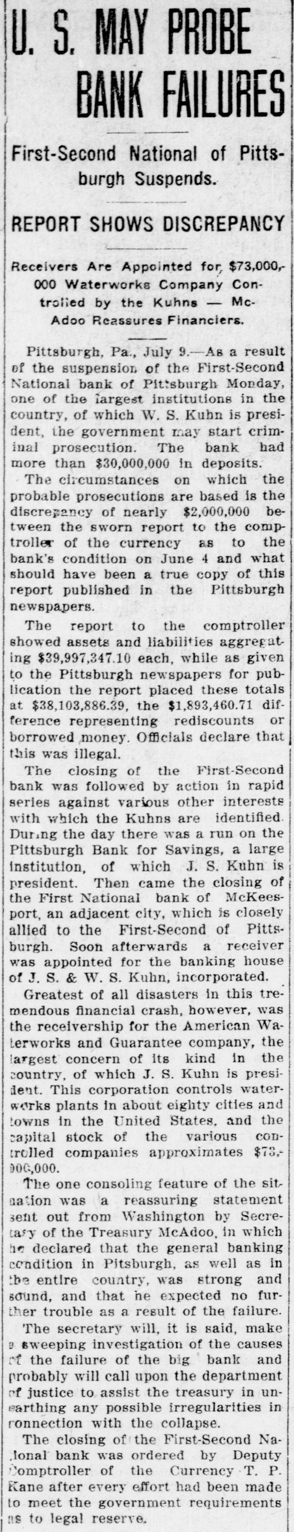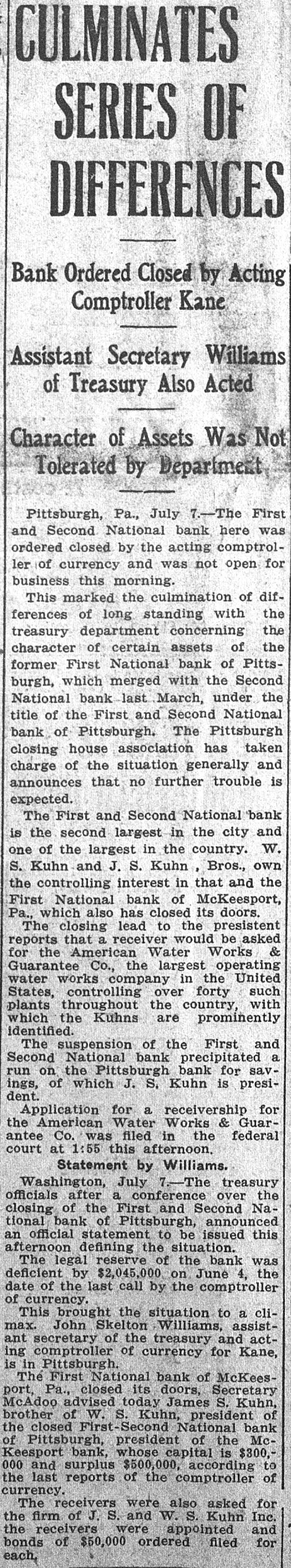 First-Second National of Pittsburgh Forced to Close Doors. SOON FOLLOWED BY TWO OTHERS First National of McKeesport and Bank of J. S. & W. S. Kuhn, Inc., Are Caught-Receiver Appointed for American Water Works and Guarantee Company. Pittsburgh, July 7.-The First-Second National Bank of Pittaburgh, the First National Bank of McKeesport, a neighboring city: the American Water Works and Guarantee Company and the banking-house of J. S. & W. S. Kuhn, Incorporated, of this city, were forced into the hands of receivers to-day through the failure of the first named institution to open its doors this morning. The closing of the First-Second National Bank was ordered by the deputy comptroller of currency, T. P. Kane, after every effort had been made to meet the government requirements as to the legal reserve. The Kuhn banking-house has extensive interests in Irrigation projects throughout the West and in mines and street traction systems throughout Western Pennsylvania, besides being a dominant figure In the American Water Works and Guarantee Company. W. S. Kuhn is president of the FirstSecond National Bank, vice-president and director in the banking-house and vice-president and director of the American Water Works and Guarantee Company, besides a director of the McKeesport bank. J. S. Kuhn is a director of the FirstSecond National Bank, president and director of the American Water Works and Guarantee Company, president and director of the McKeesport bank and chairman of the board of directors of the banking-house. Receivers Asked For. When it was learned that the banks would have to suspend business, steps were taken to protect the American Water Works and Guarantee Company and the Kuhn's banking-house, and application was made in the Federal court this afternoon for receivers for both Institutions. Throughout the day a statement of the banks and affected companies' affairs was awaited with feverish anxiety, but none was forthcoming until tonight. when Mr. Kuhn made a formal statement. No statement of the condition of the bank was obtainable subsequent to the one issued June 4 on the last bank call of the comptroller. The June 4 statement was as follows: Resources: Loans and discounts. $15,704,901.16. Overdrafts, secured and unsecured. $2,571.76. United States bonds to secure circulation, $1,900,000. United States bonds to secure United States deposits, $171,000. United States bonds on hand, $16,000. Premium of united bonds, $10,121.26. Bonds, securities, etc., $8,549,236.95. Banking furniture and lixtures, $176,755.04. Other real estate owned. $4,541,977.65. Due from national banks (not reserve agents). $1,178,987.06 Due from State banks and bankers, $1,316,820.23. Due from approved reserve agents, $4,216,447.75 Checks and other cash items. $160.076.23. Exchanges for clearing house, $693,230.42. Notes of other national banks, $360,000. Fractional paper currency, nickels and cents, $13,237.88. Lawful money reserve in bank, via.: Specie and legal tender notes, $1,S.1.023. Redemption fund with United States Treasury (5 per cent of circulation), 95 per cent. Due from United States treasurer other than 5 per cent redemption fund, $87,500. Total, $38,103,856.39. Other Side of Ledger. Liabilities: Capital stock paid in, $3,400,000. Surplus fund, $1,700,000. Undivided profits, less expenses and taxes paid, $250,068.45. National bank notes outstanding, (Continued on Second Page.)
