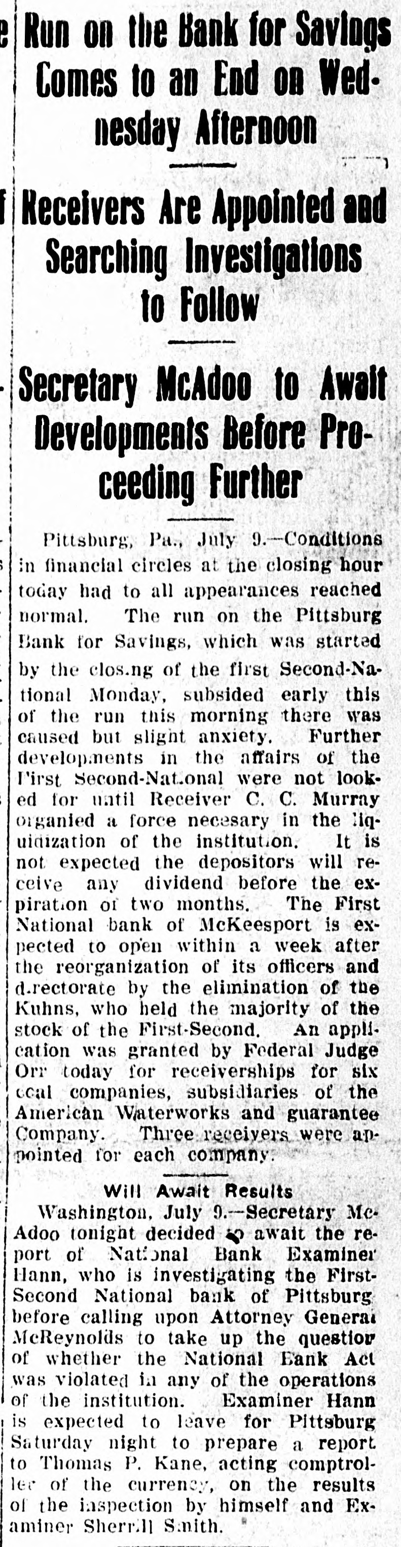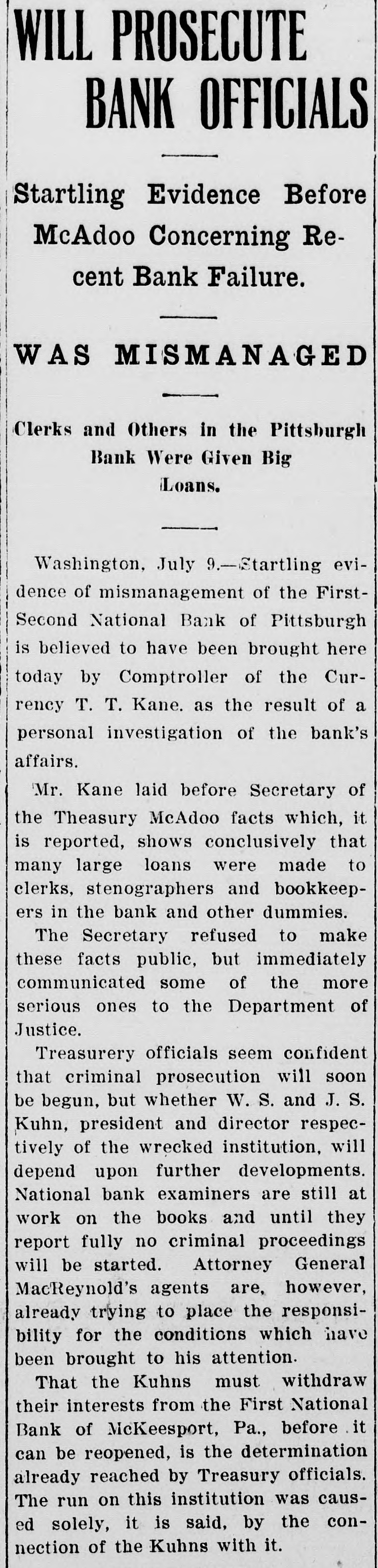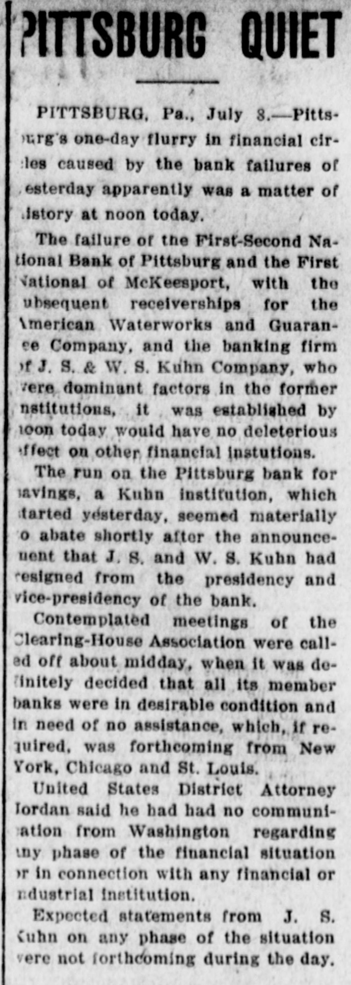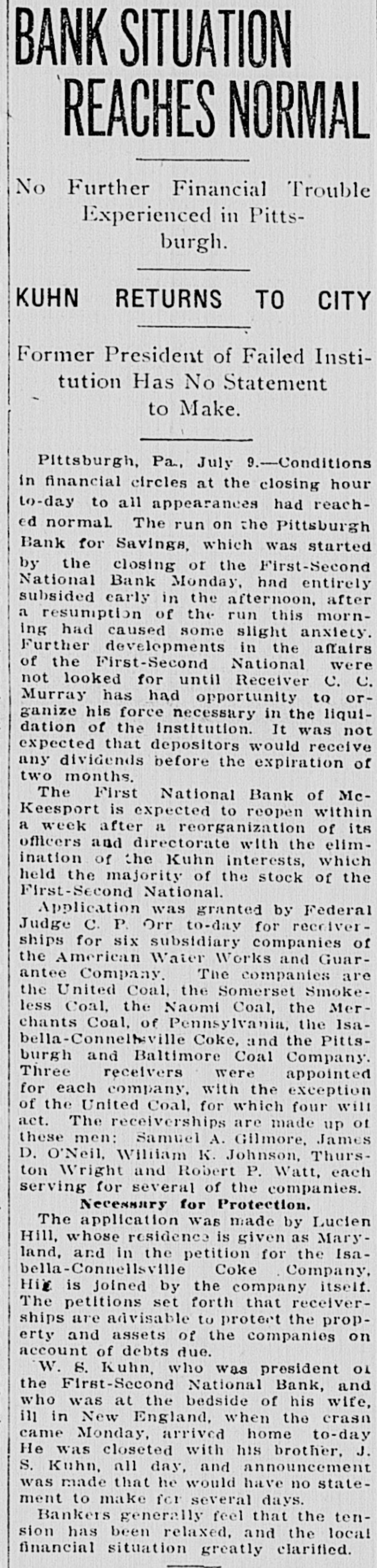 First-Second National of Pittsburgh Forced to Close Doors. SOON FOLLOWED BY TWO OTHERS First National of McKeesport and Bank of J. S. & W. S. Kuhn, Inc., Are Caught-Receiver Appointed for American Water Works and Guarantee Company. Pittsburgh, July 7.-The First-Second National Bank of Pittaburgh, the First National Bank of McKeesport, a neighboring city: the American Water Works and Guarantee Company and the banking-house of J. S. & W. S. Kuhn, Incorporated, of this city, were forced into the hands of receivers to-day through the failure of the first named institution to open its doors this morning. The closing of the First-Second National Bank was ordered by the deputy comptroller of currency, T. P. Kane, after every effort had been made to meet the government requirements as to the legal reserve. The Kuhn banking-house has extensive interests in Irrigation projects throughout the West and in mines and street traction systems throughout Western Pennsylvania, besides being a dominant figure In the American Water Works and Guarantee Company. W. S. Kuhn is president of the FirstSecond National Bank, vice-president and director in the banking-house and vice-president and director of the American Water Works and Guarantee Company, besides a director of the McKeesport bank. J. S. Kuhn is a director of the FirstSecond National Bank, president and director of the American Water Works and Guarantee Company, president and director of the McKeesport bank and chairman of the board of directors of the banking-house. Receivers Asked For. When it was learned that the banks would have to suspend business, steps were taken to protect the American Water Works and Guarantee Company and the Kuhn's banking-house, and application was made in the Federal court this afternoon for receivers for both Institutions. Throughout the day a statement of the banks and affected companies' affairs was awaited with feverish anxiety, but none was forthcoming until tonight. when Mr. Kuhn made a formal statement. No statement of the condition of the bank was obtainable subsequent to the one issued June 4 on the last bank call of the comptroller. The June 4 statement was as follows: Resources: Loans and discounts. $15,704,901.16. Overdrafts, secured and unsecured. $2,571.76. United States bonds to secure circulation, $1,900,000. United States bonds to secure United States deposits, $171,000. United States bonds on hand, $16,000. Premium of united bonds, $10,121.26. Bonds, securities, etc., $8,549,236.95. Banking furniture and lixtures, $176,755.04. Other real estate owned. $4,541,977.65. Due from national banks (not reserve agents). $1,178,987.06 Due from State banks and bankers, $1,316,820.23. Due from approved reserve agents, $4,216,447.75 Checks and other cash items. $160.076.23. Exchanges for clearing house, $693,230.42. Notes of other national banks, $360,000. Fractional paper currency, nickels and cents, $13,237.88. Lawful money reserve in bank, via.: Specie and legal tender notes, $1,S.1.023. Redemption fund with United States Treasury (5 per cent of circulation), 95 per cent. Due from United States treasurer other than 5 per cent redemption fund, $87,500. Total, $38,103,856.39. Other Side of Ledger. Liabilities: Capital stock paid in, $3,400,000. Surplus fund, $1,700,000. Undivided profits, less expenses and taxes paid, $250,068.45. National bank notes outstanding, (Continued on Second Page.)